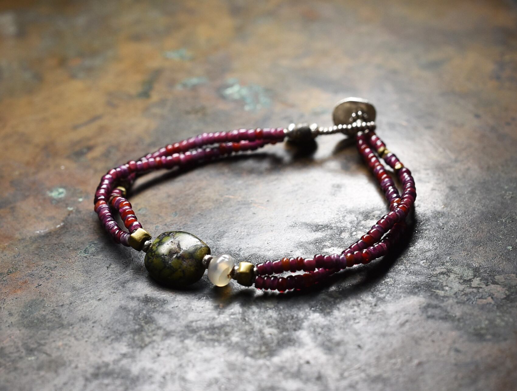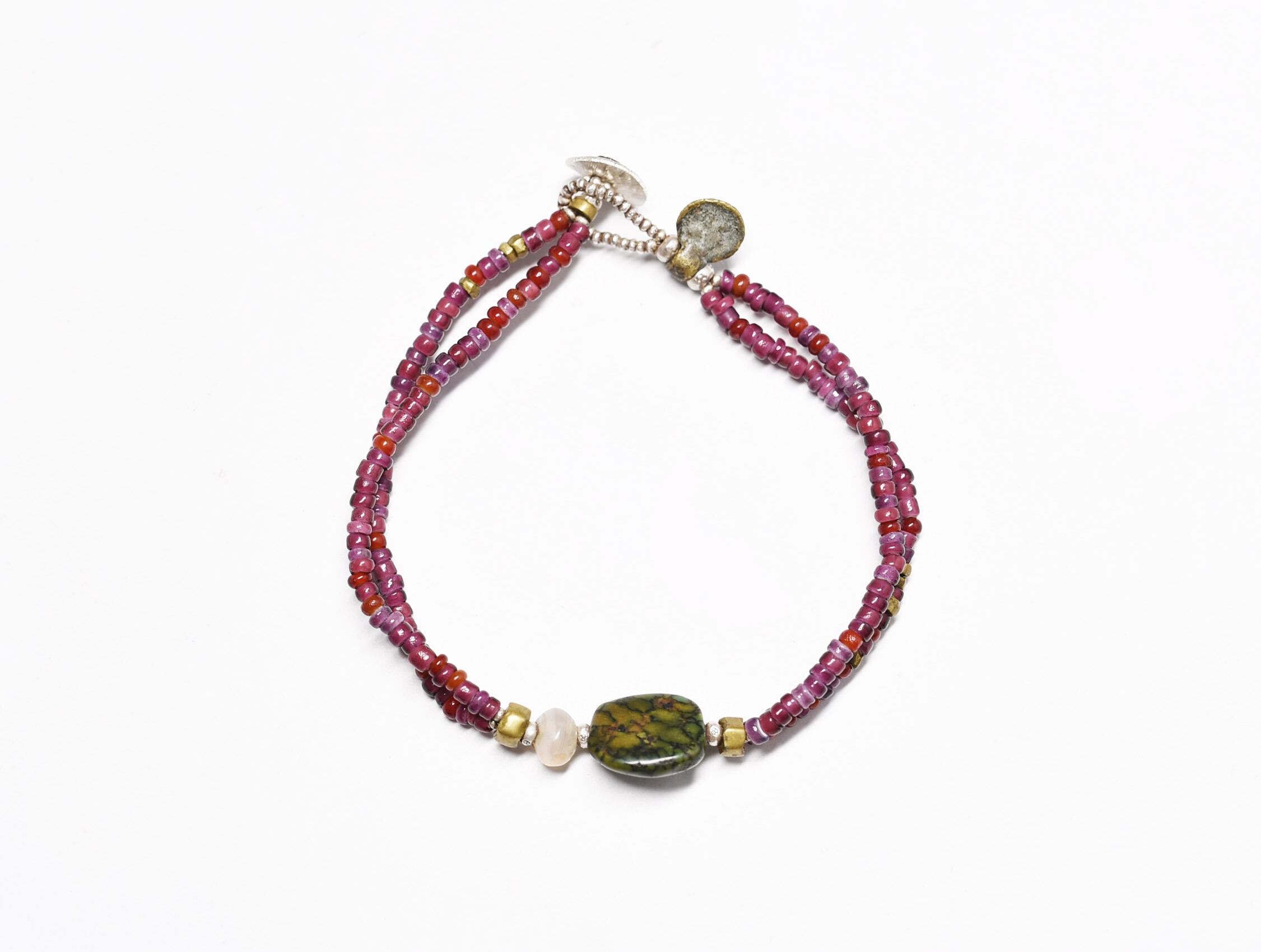 oldチベタンターコイズと古代瑪瑙、oldオリッサブラス、葡萄色ホワイトハーツの2連ブレス