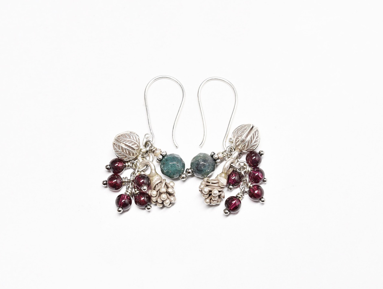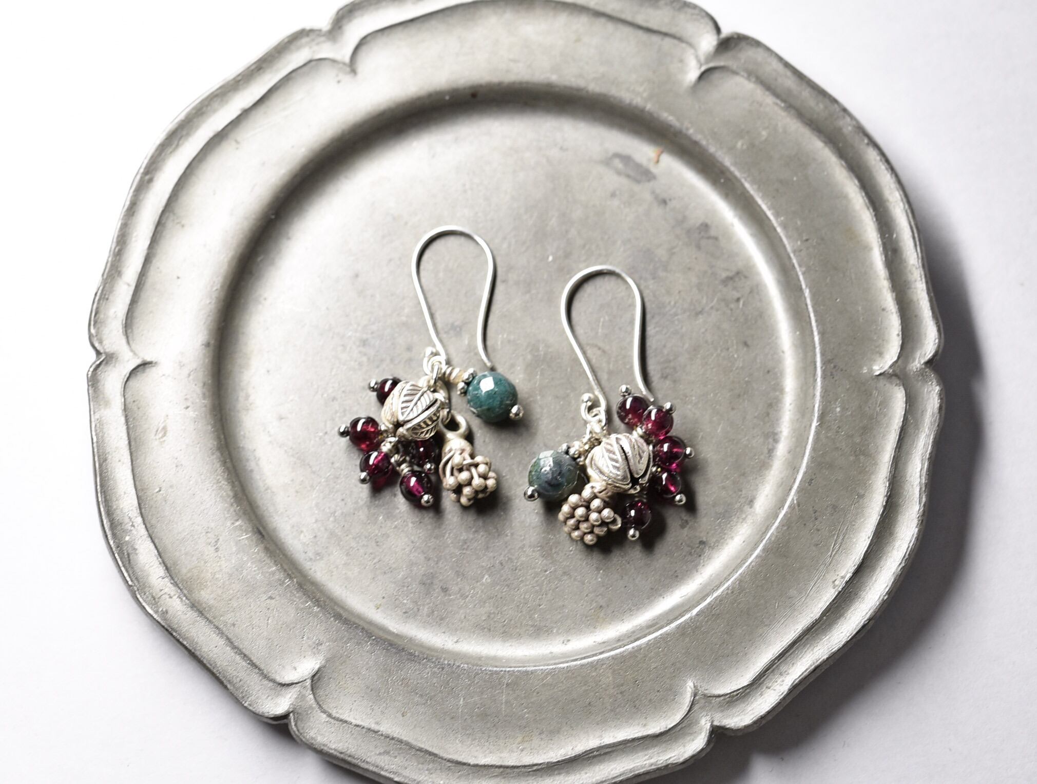 2種類の蕾カレンシルバーとたわわなガーネット、インディアンアゲートのピアス