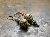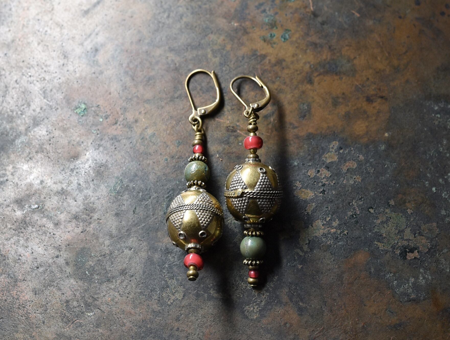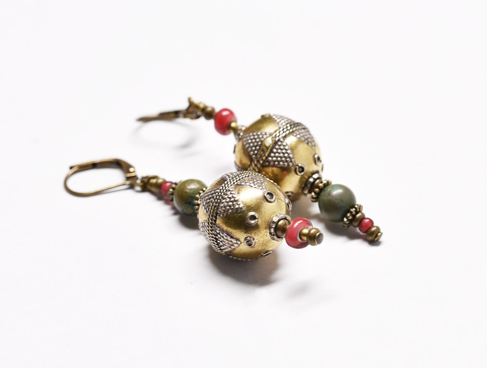 トルクメニスタンから届いたメタルビーズにターコイズ、金赤ホワイトハーツを繋いだピアスです。