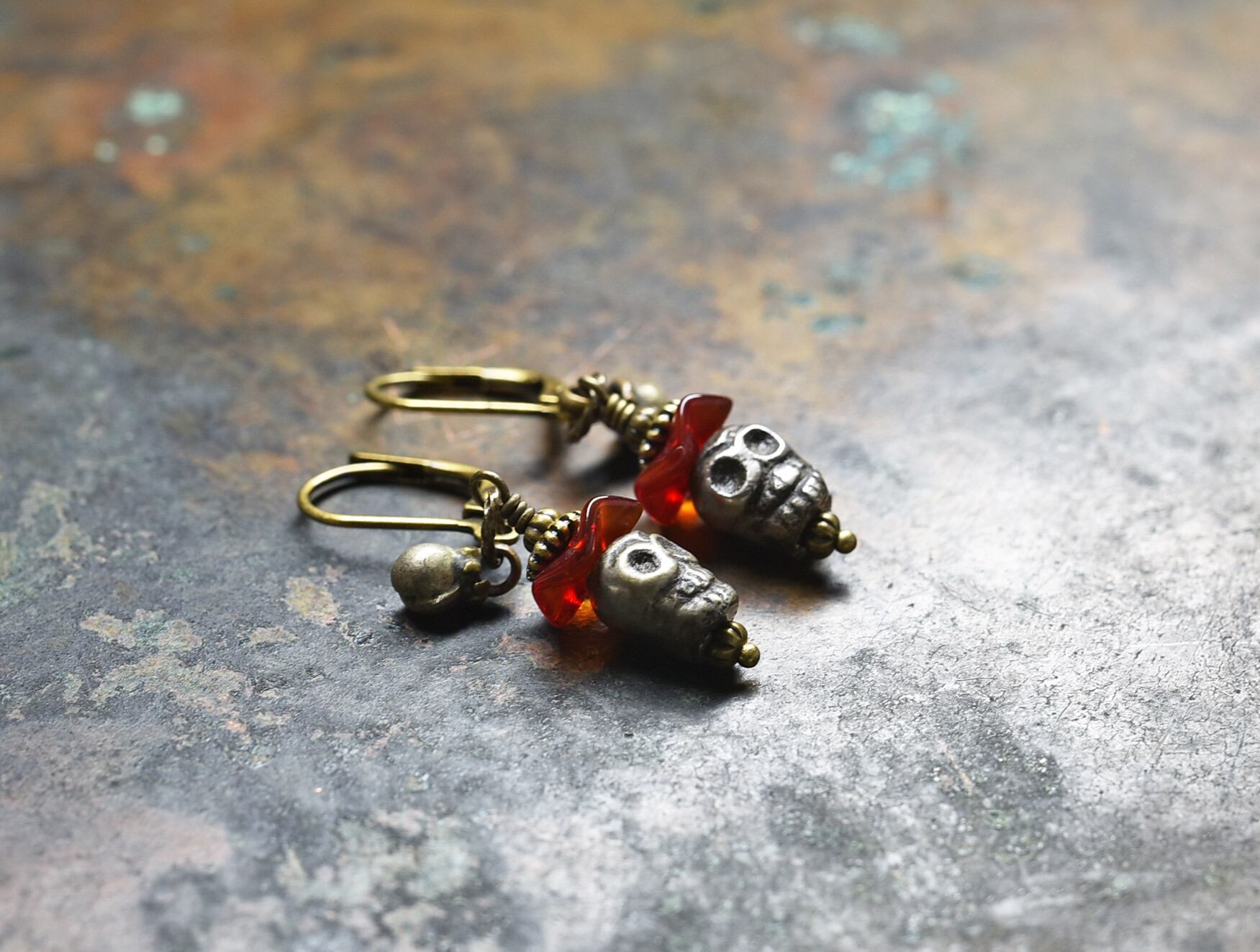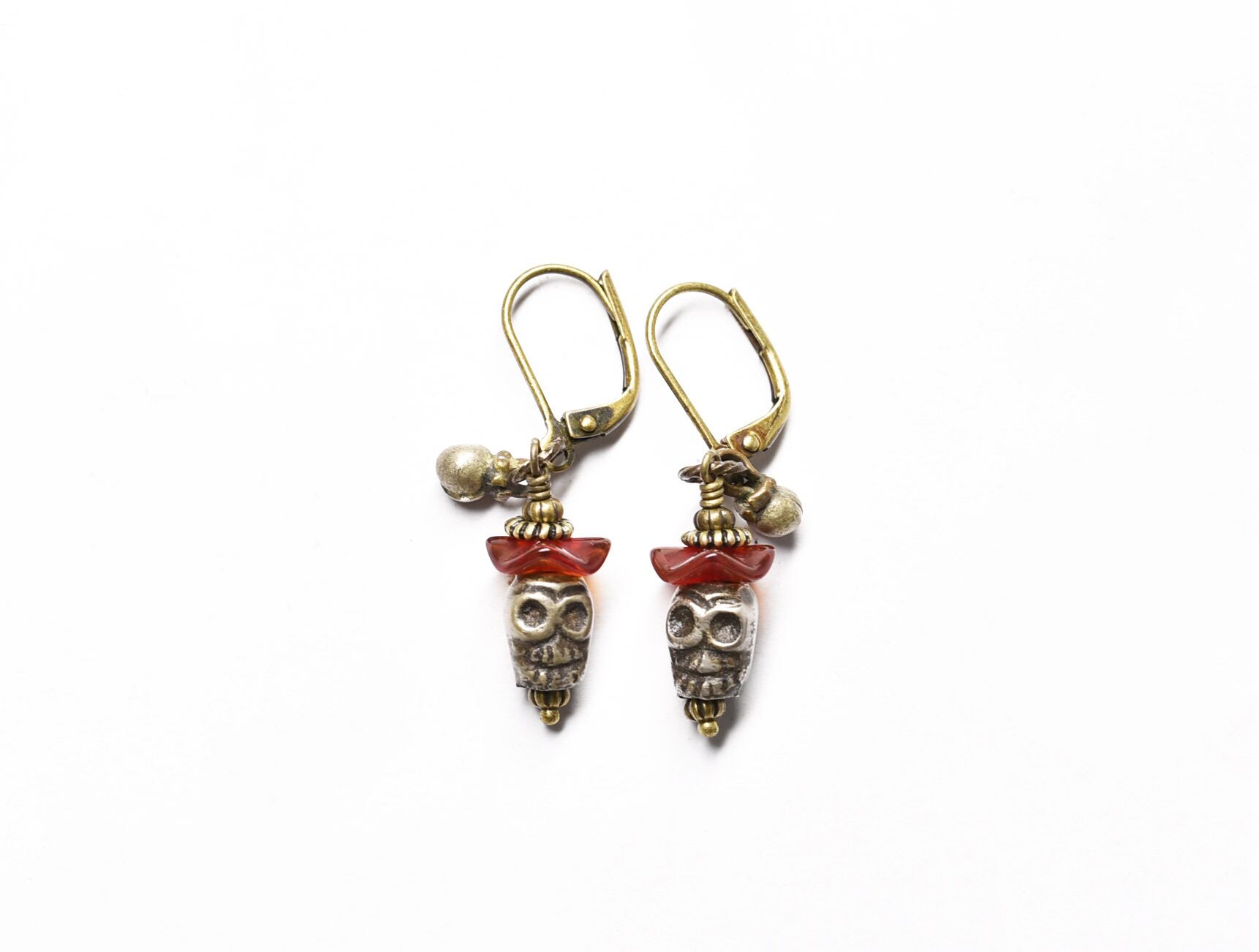 ファニーなスカルとjapanヴィンテージビーズと小さな鈴を繋いだ、ちょっと小さめなピアスです。
