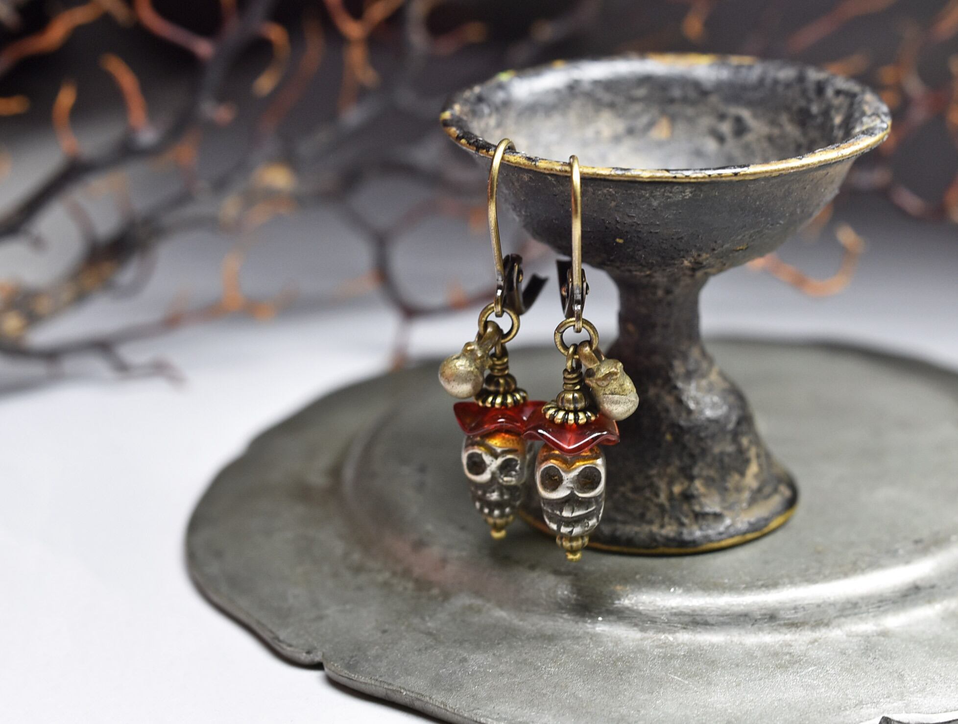 ファニーなスカルとjapanヴィンテージビーズ、小さな鈴のピアス(古銀色)・再販