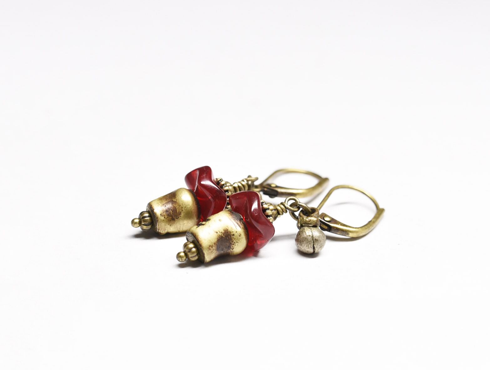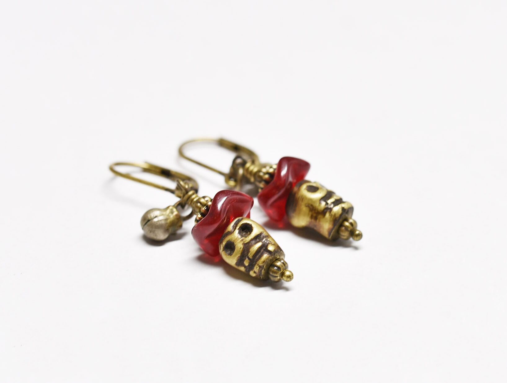 ファニーなスカルとjapanヴィンテージビーズ、小さな鈴のピアス(古金色)