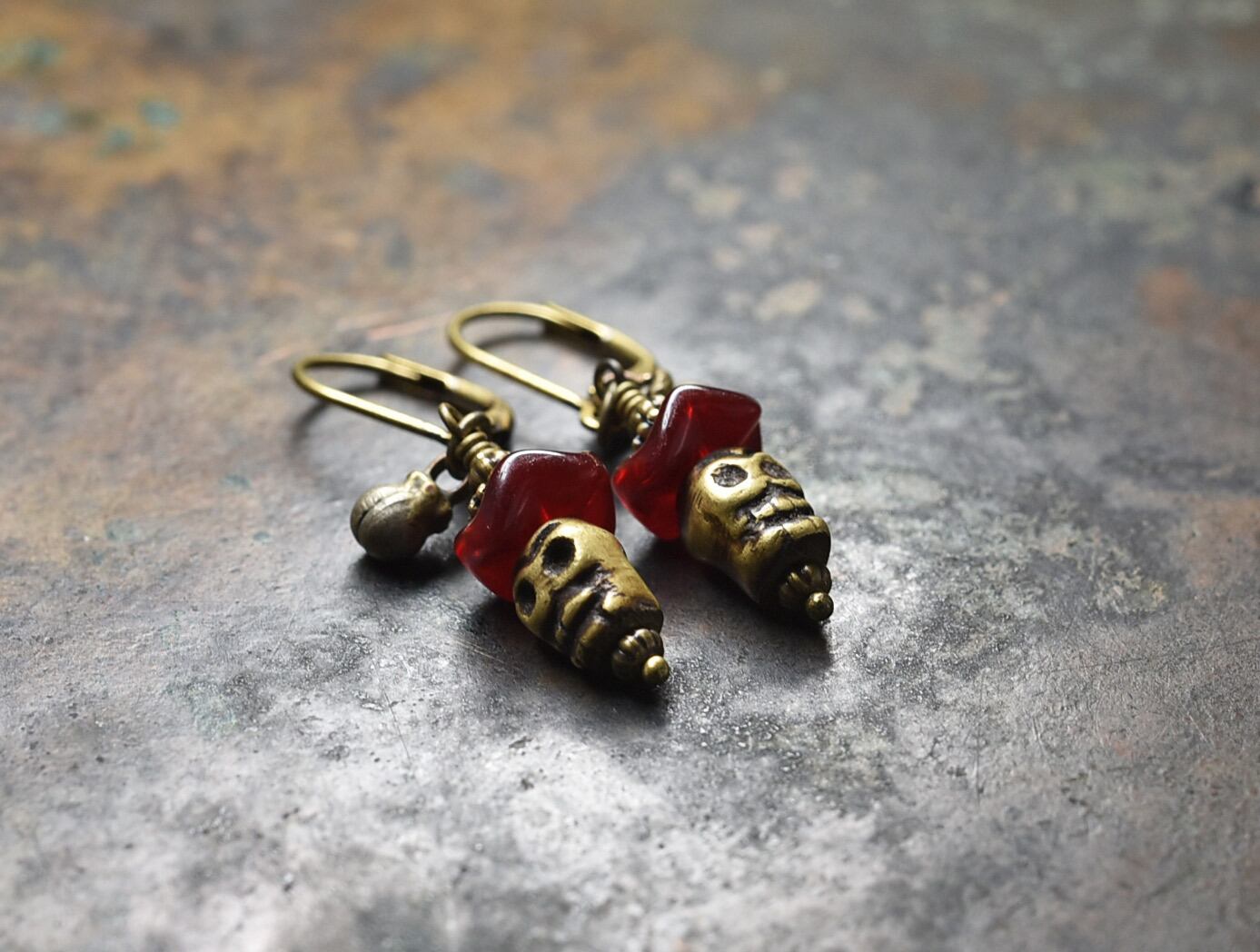 ファニーなスカルとjapanヴィンテージビーズと小さな鈴を繋いだ、ちょっと小さめなピアスです。