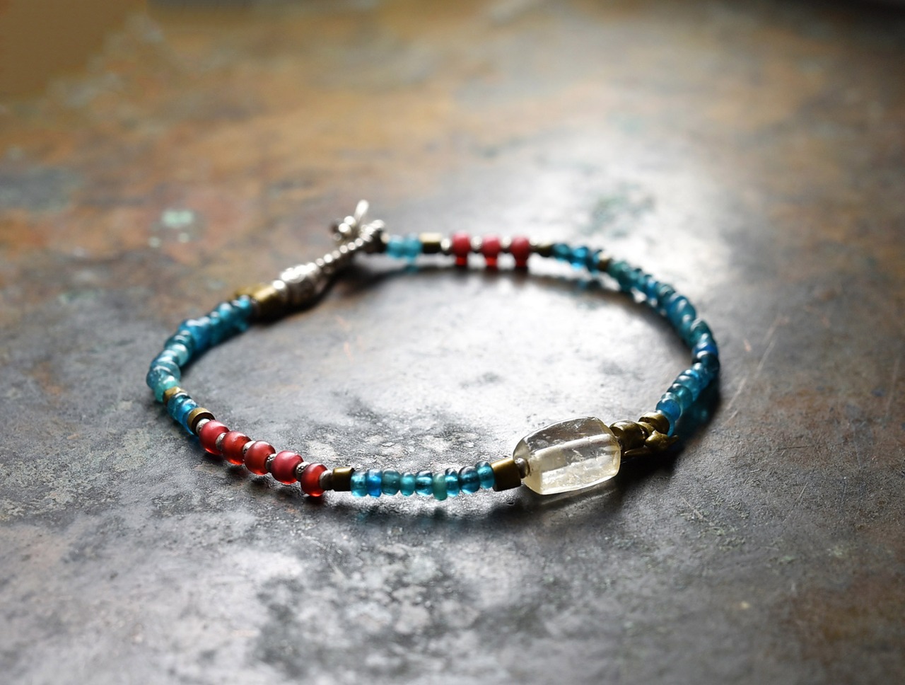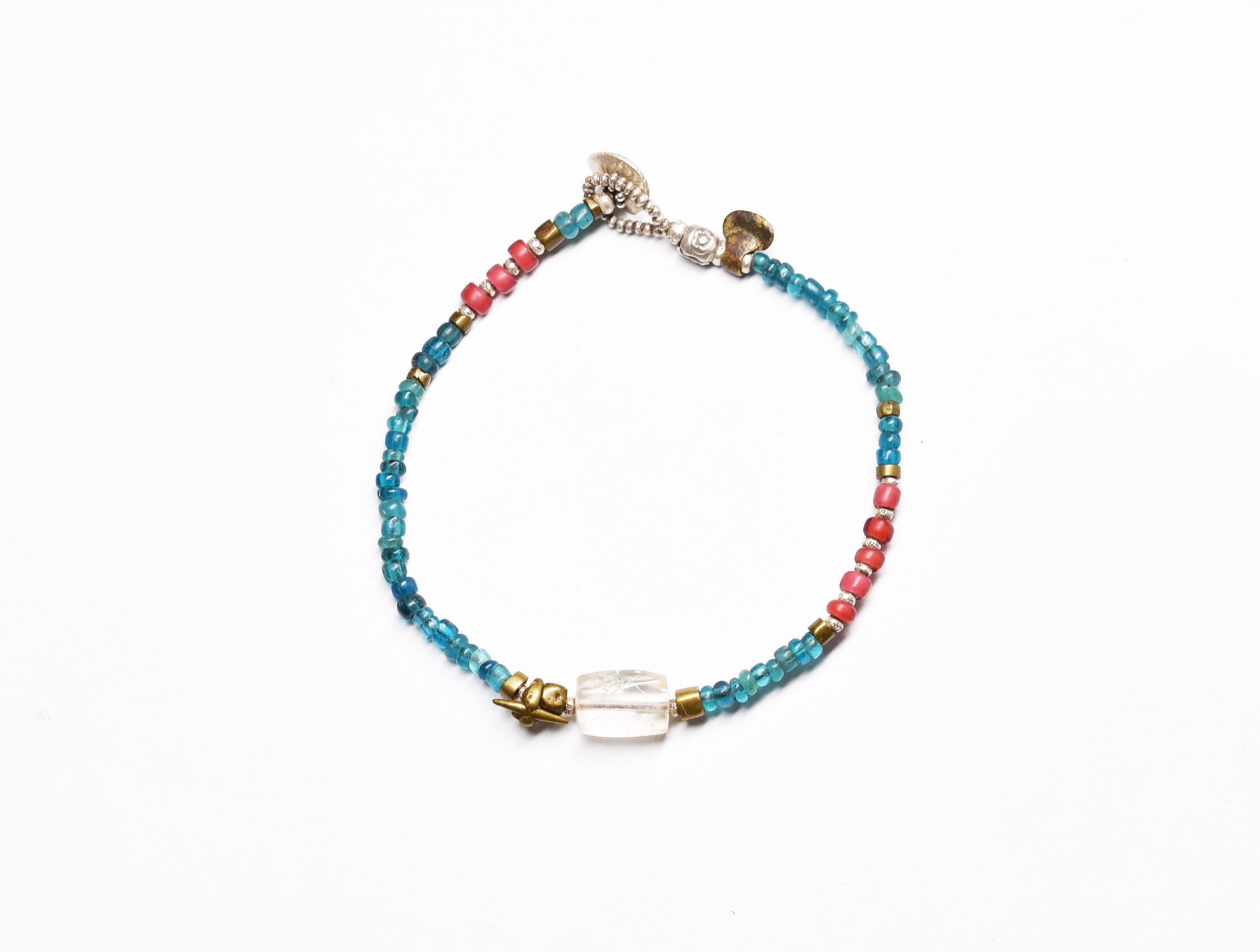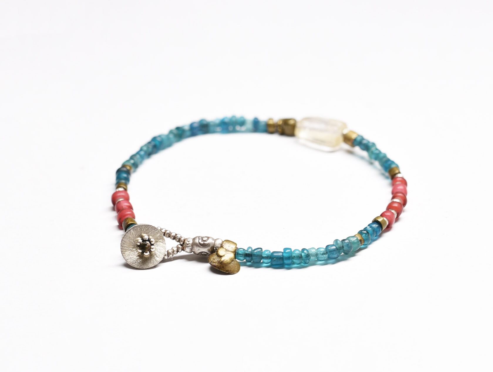 古代水晶、エメラルドブルーアンティークビーズ、金赤ホワイトハーツ、oldオリッサブラスを繋いだブレスです。