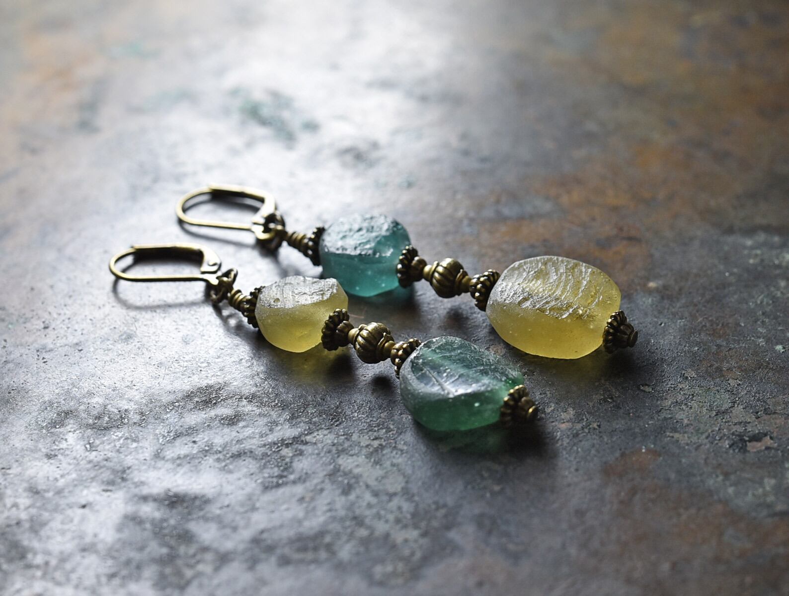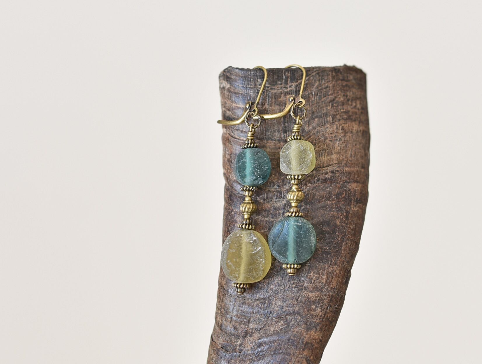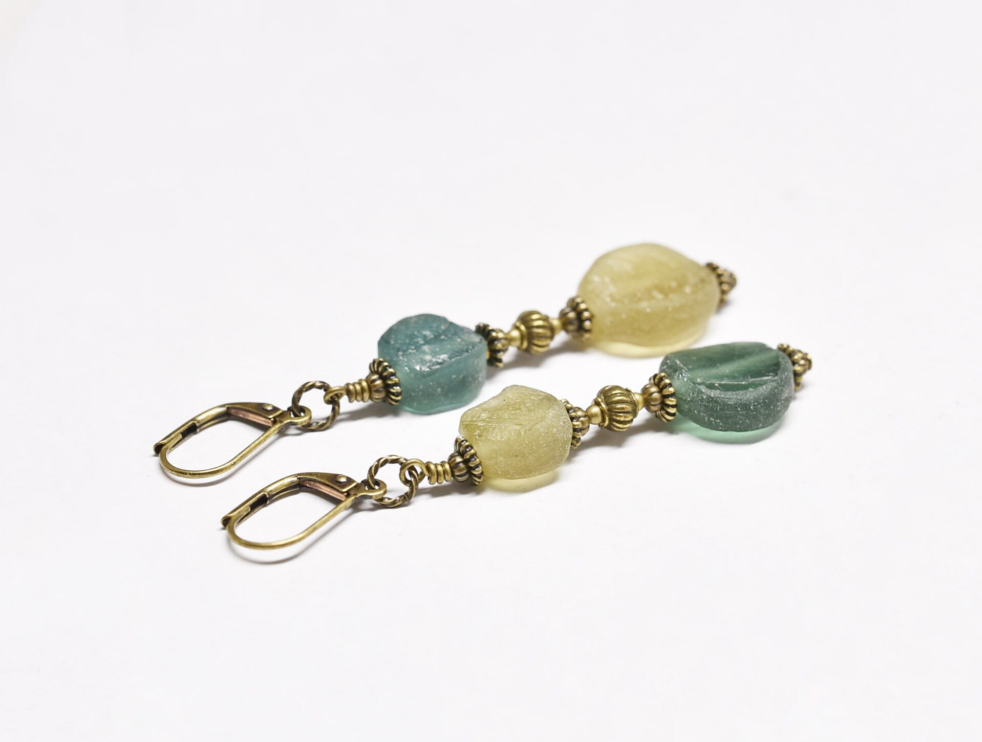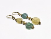 ミントグリーン&オリーブイエローローマングラスとブラスビーズのピアス