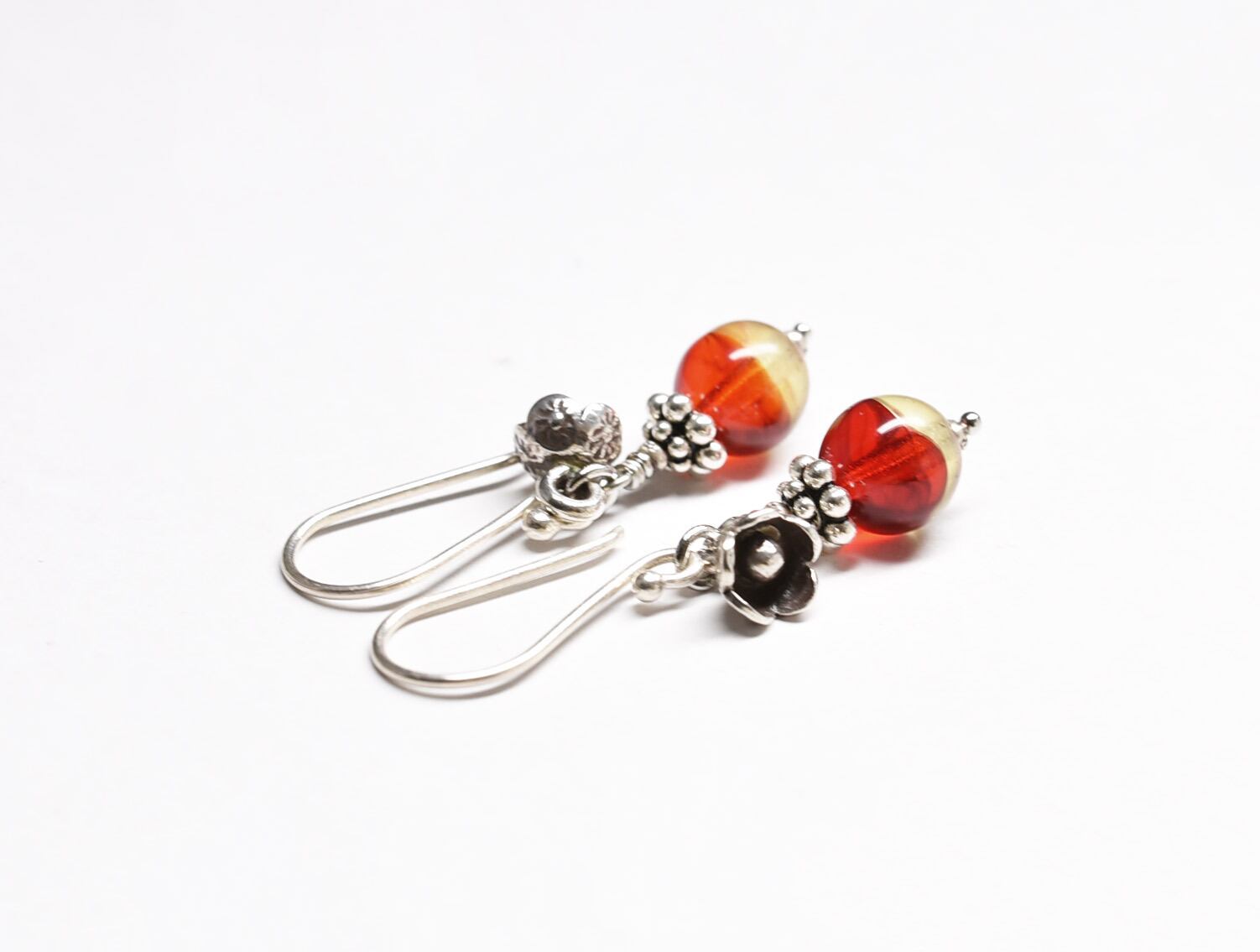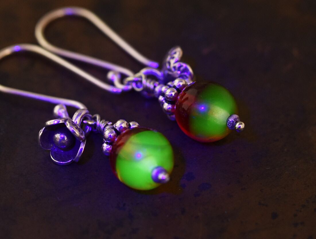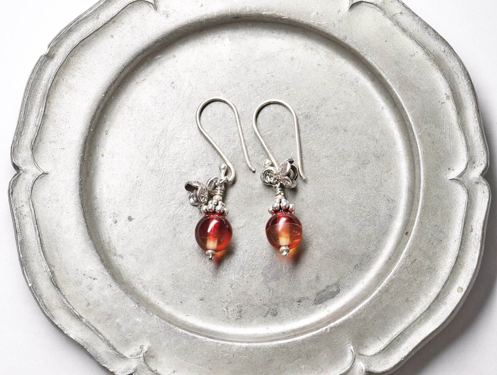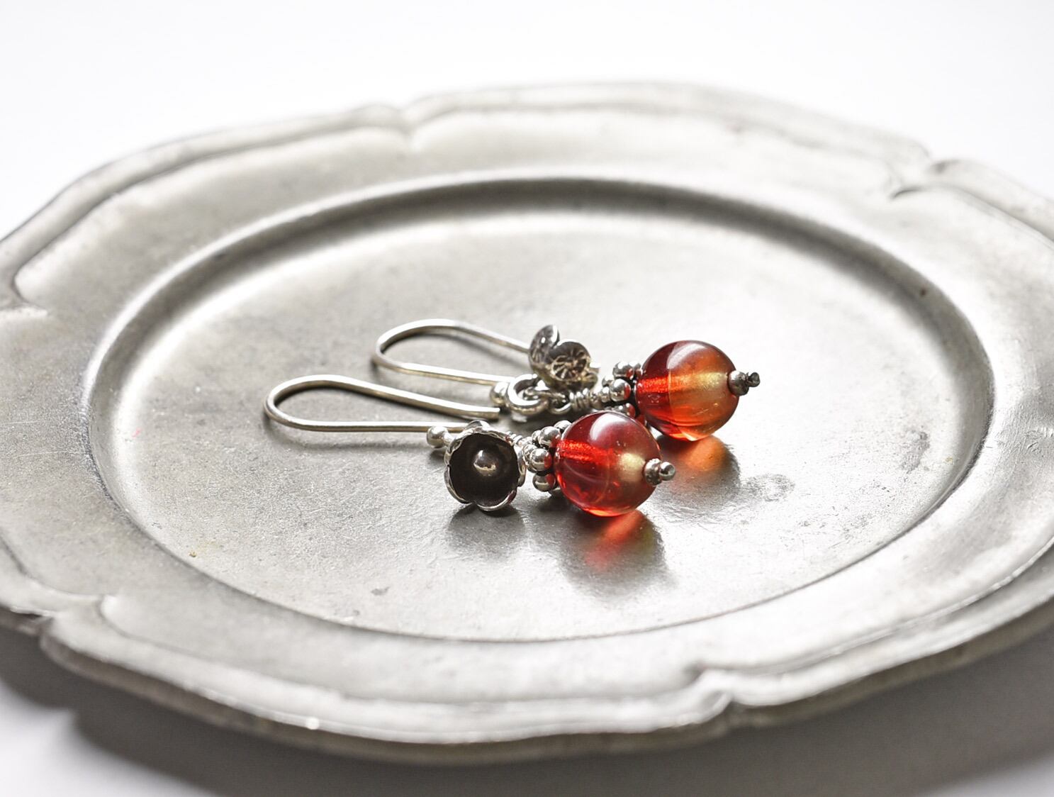 林檎のようなウランガラスと小さなカレンシルバーのお花ピアス