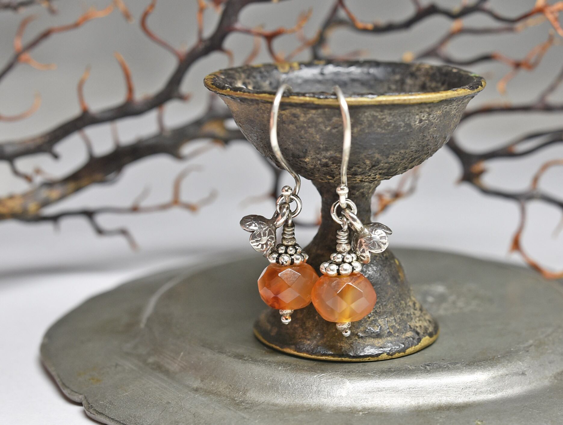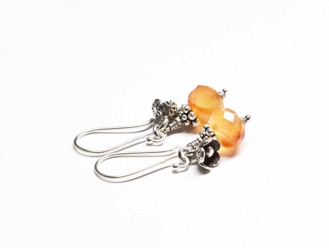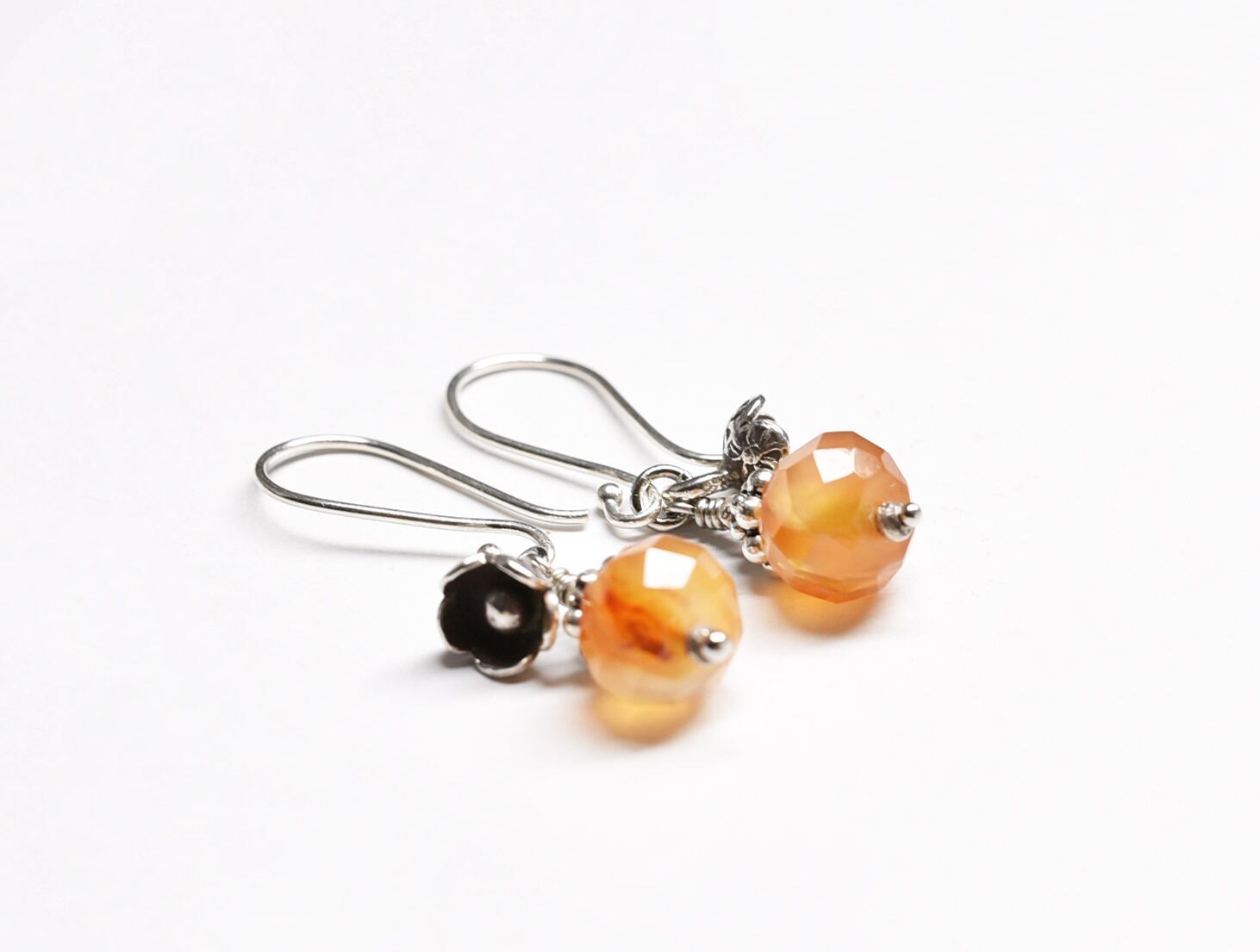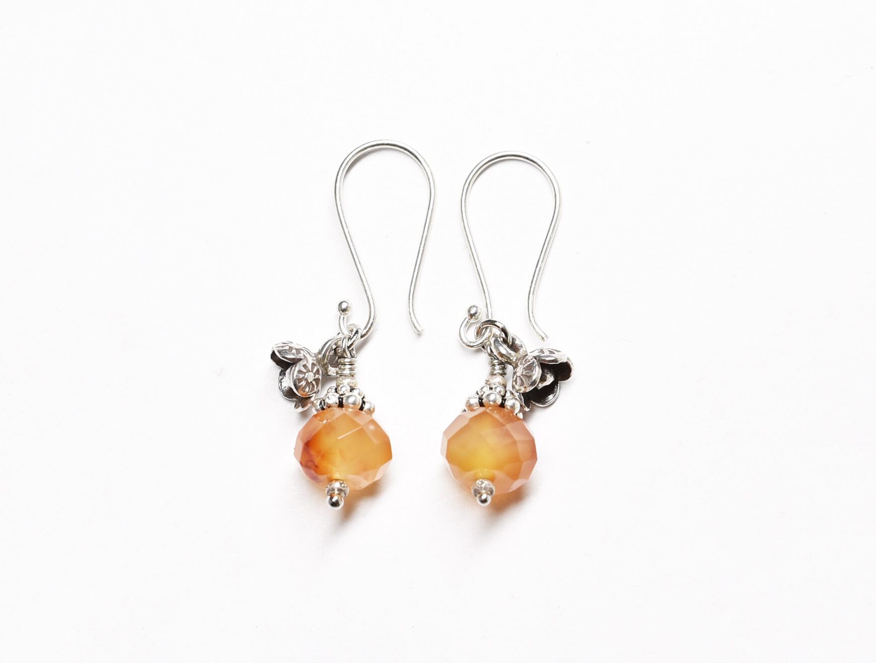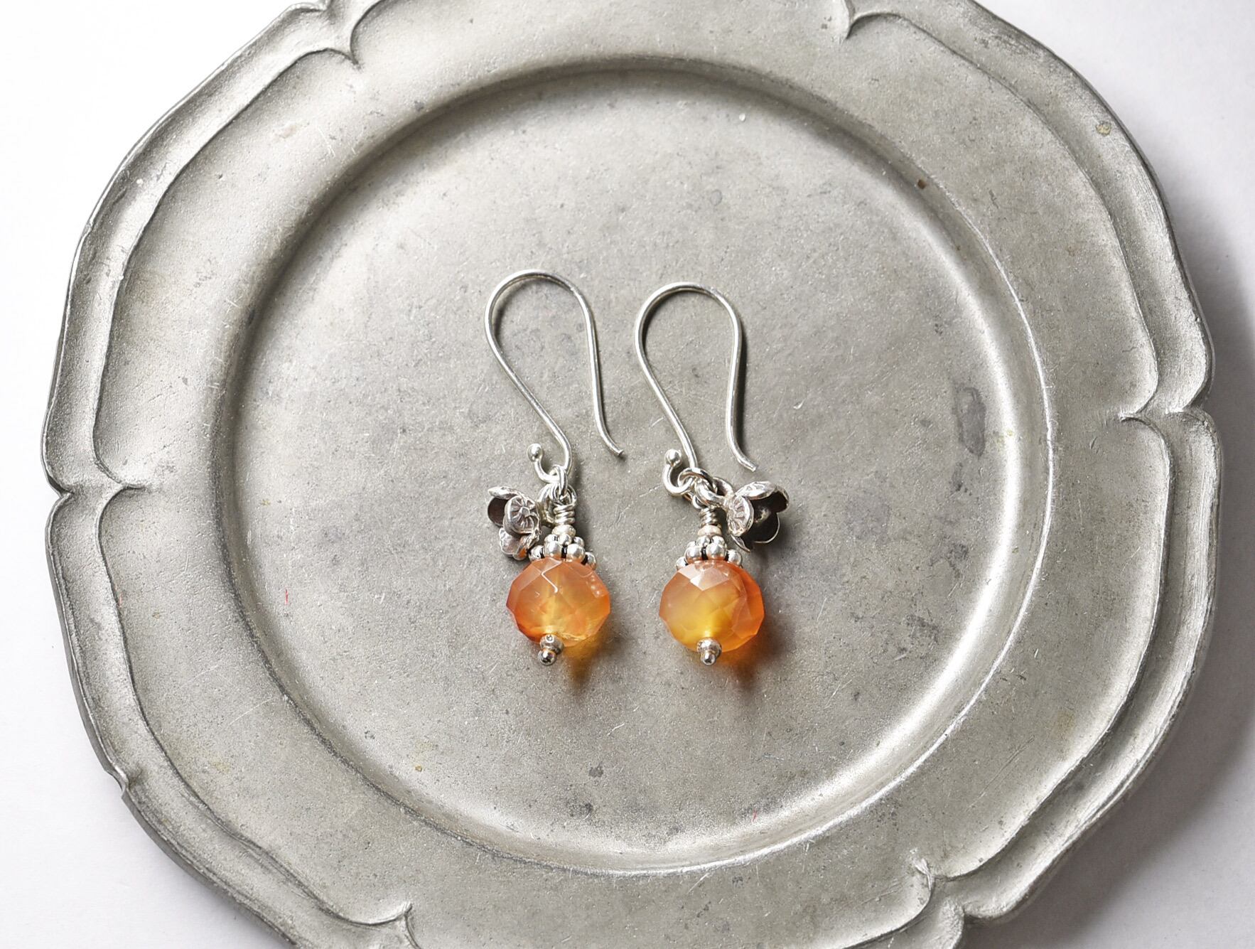 オレンジのようなカーネリアンと小さなカレンシルバーのお花を繋いだ小さめなピアスです。