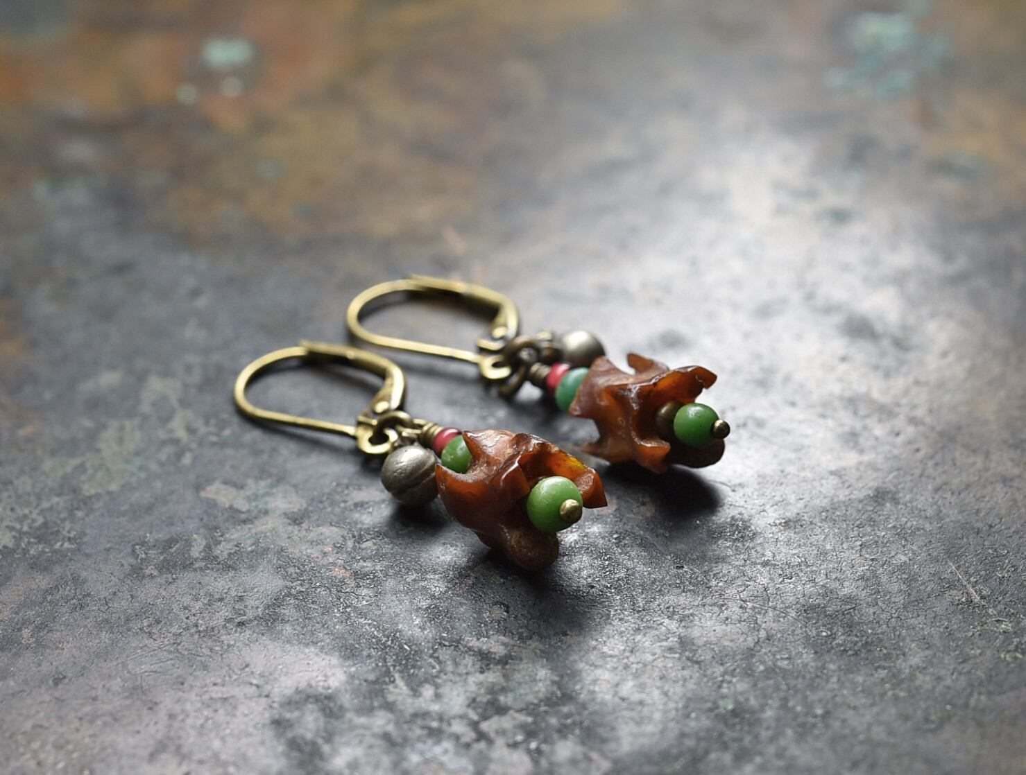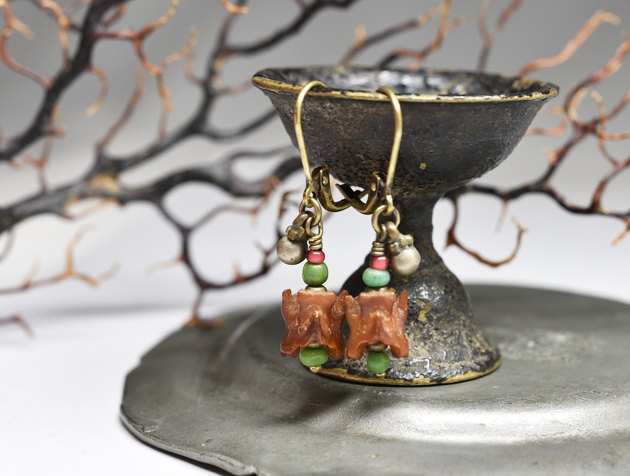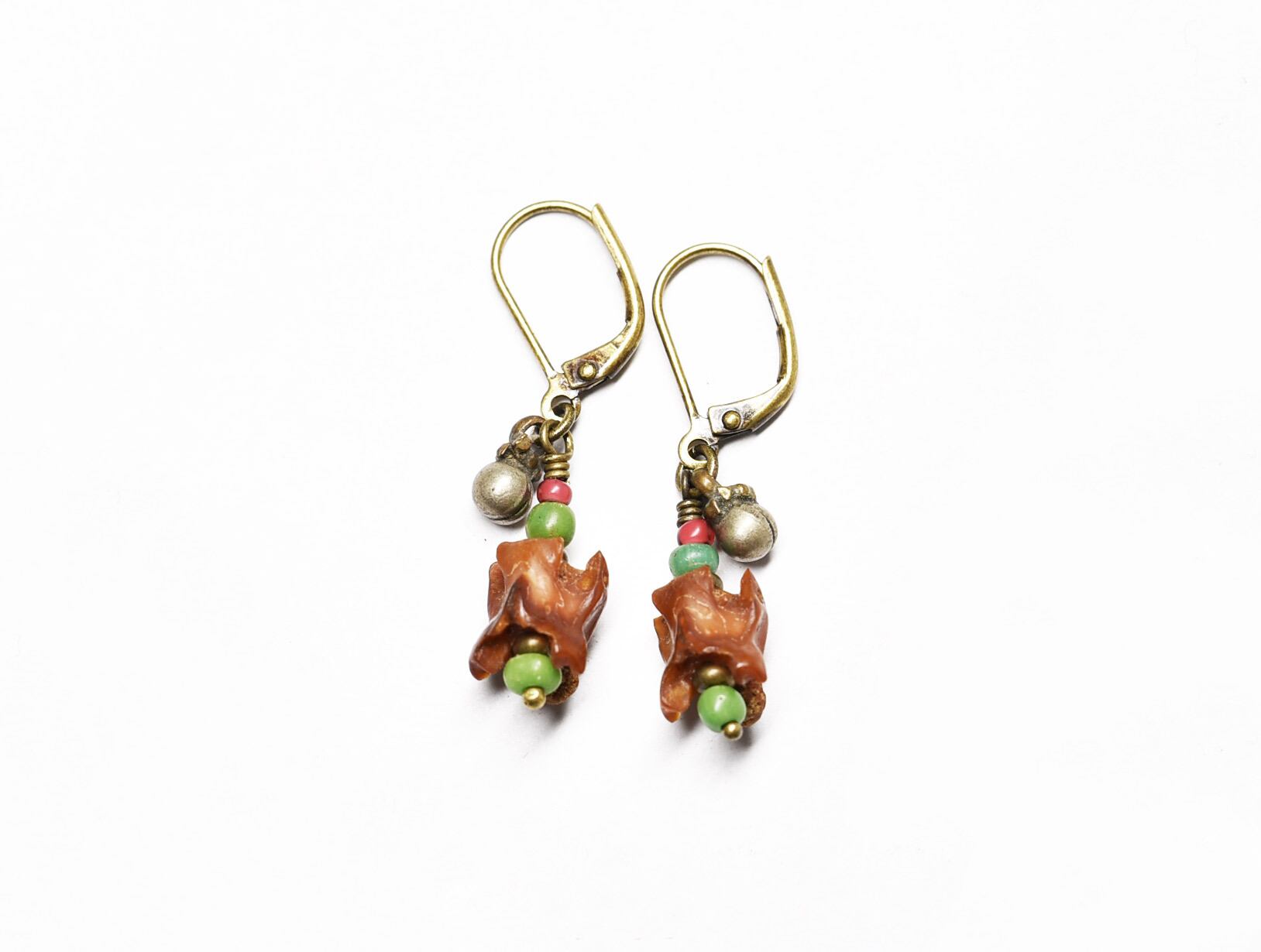 蛇骨、翡翠色のアンティークビーズ、金赤ホワイトハーツ、小さな鈴を繋いだピアスです。