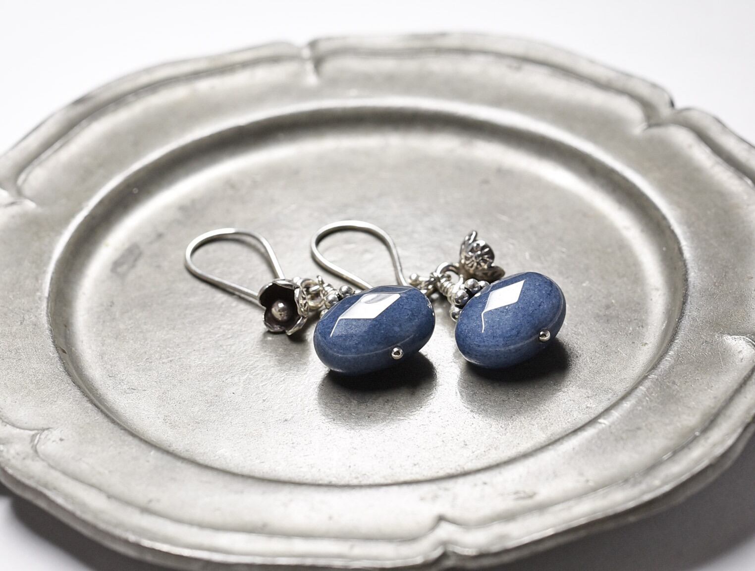 サファイアアゲートと小さなカレンシルバーのお花を繋いだ小さめなピアスです。