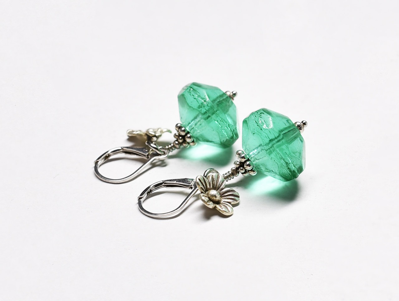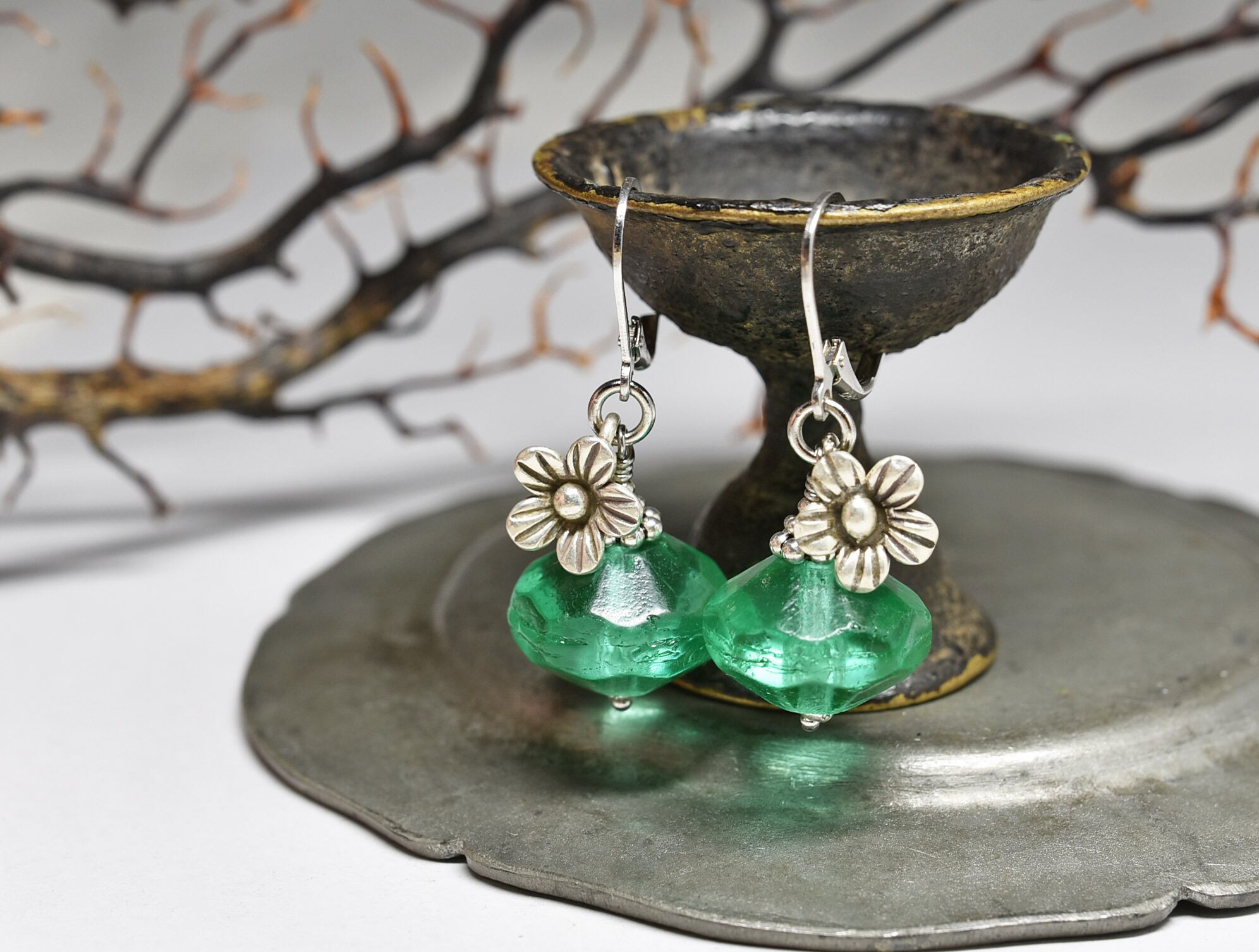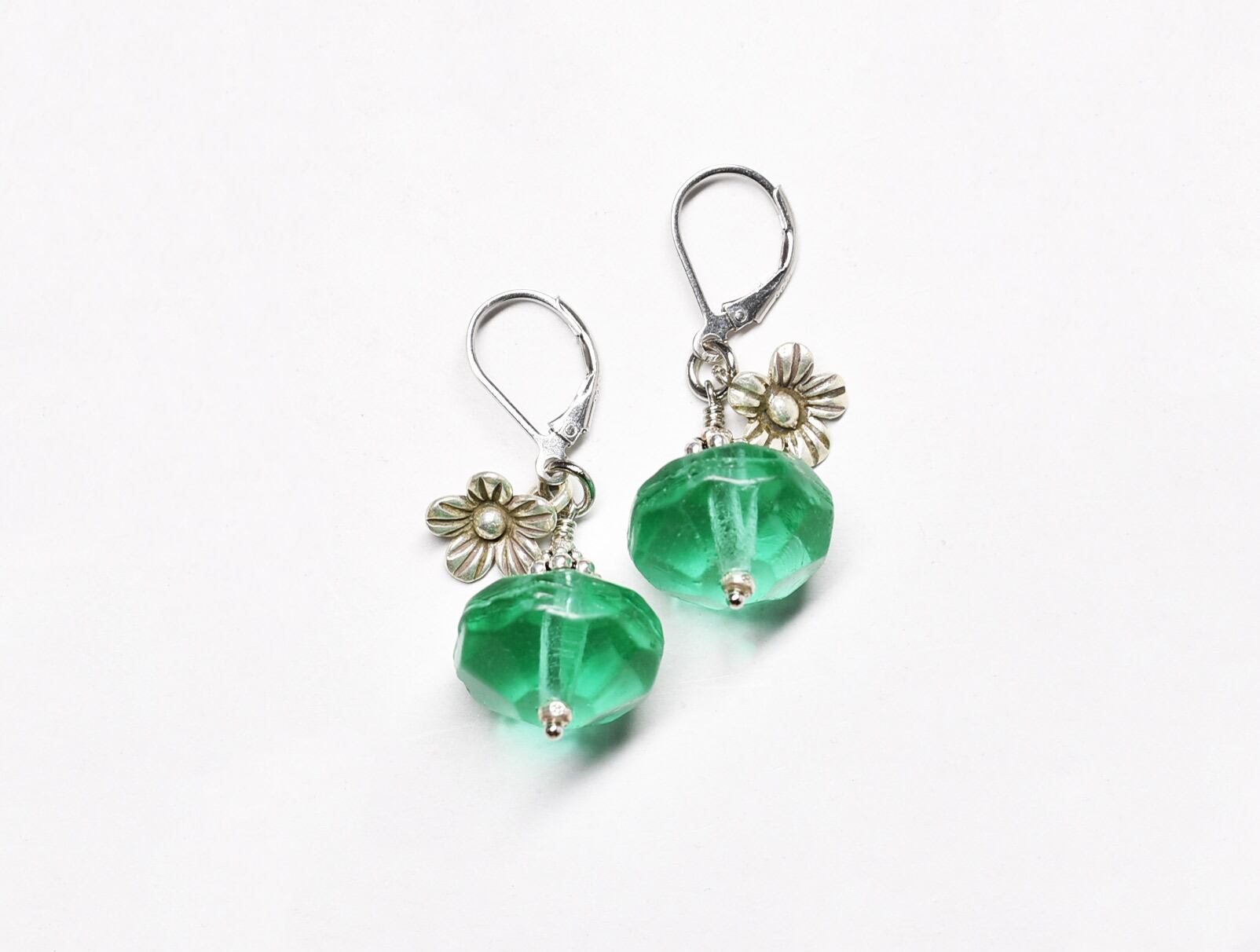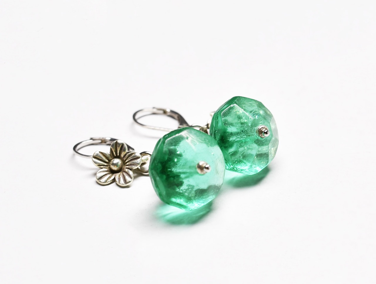 アンティークウランガラスとお花カレンシルバーのピアス