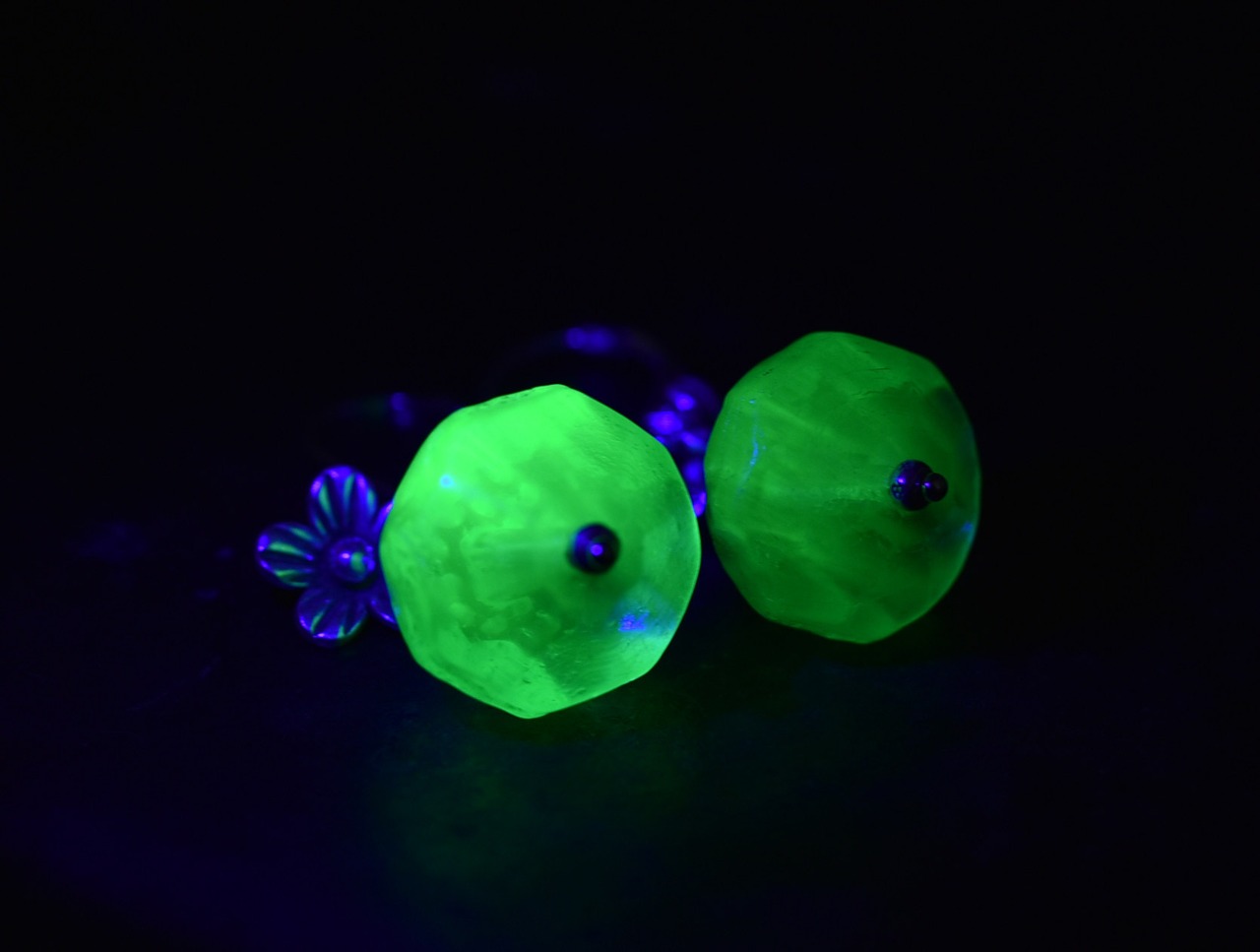 独特なセミクリアグリーンのビーズは、極々微量のウランで発色させています。ブラックライトを当てると光ります!