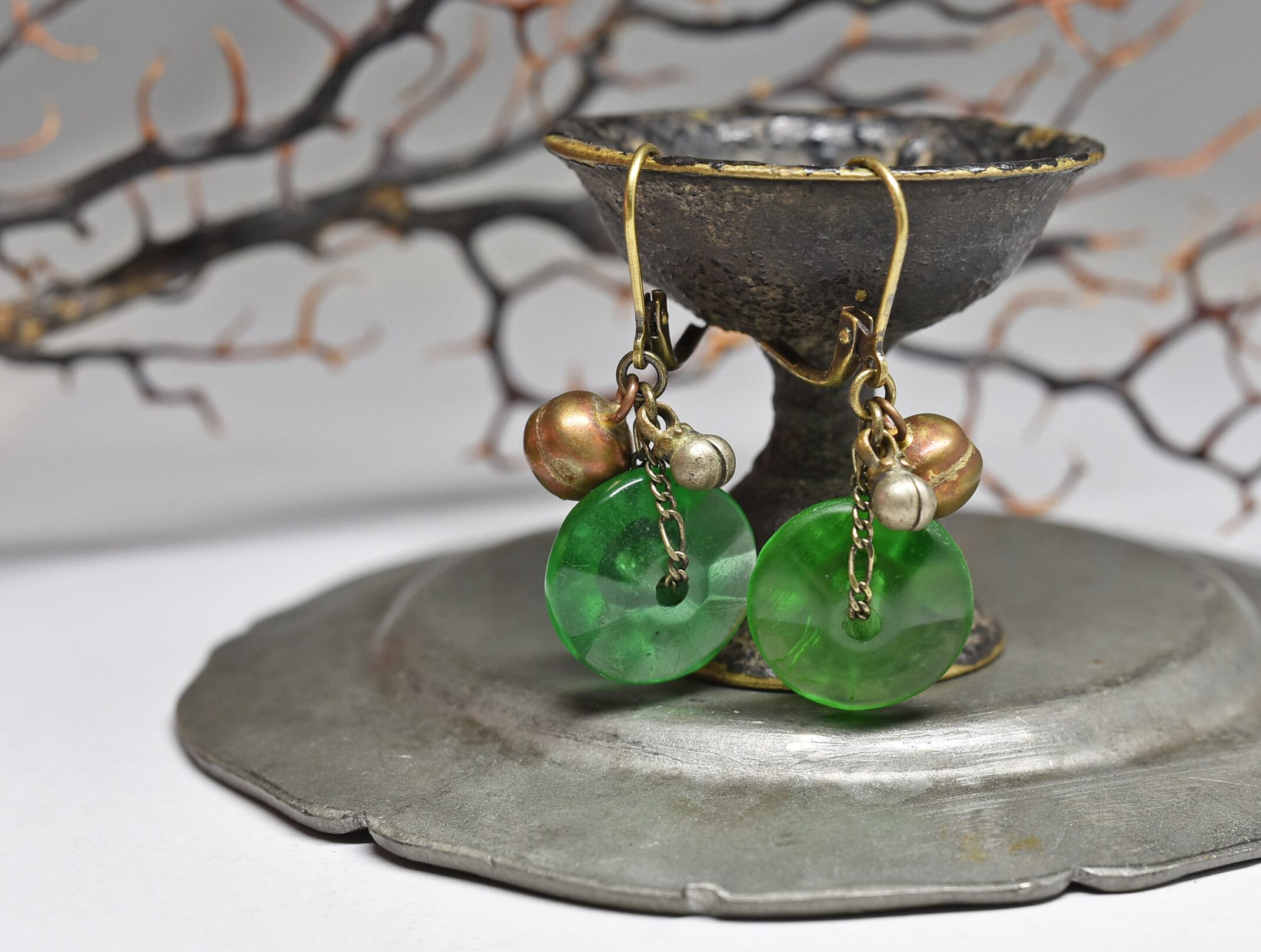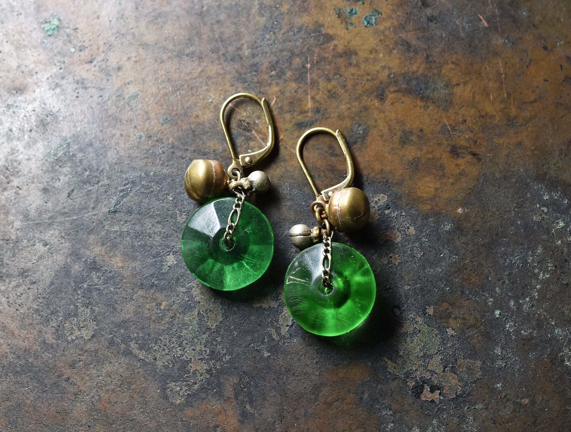 ディスク型アンティークボヘミアビーズと2種類の鈴のピアス