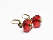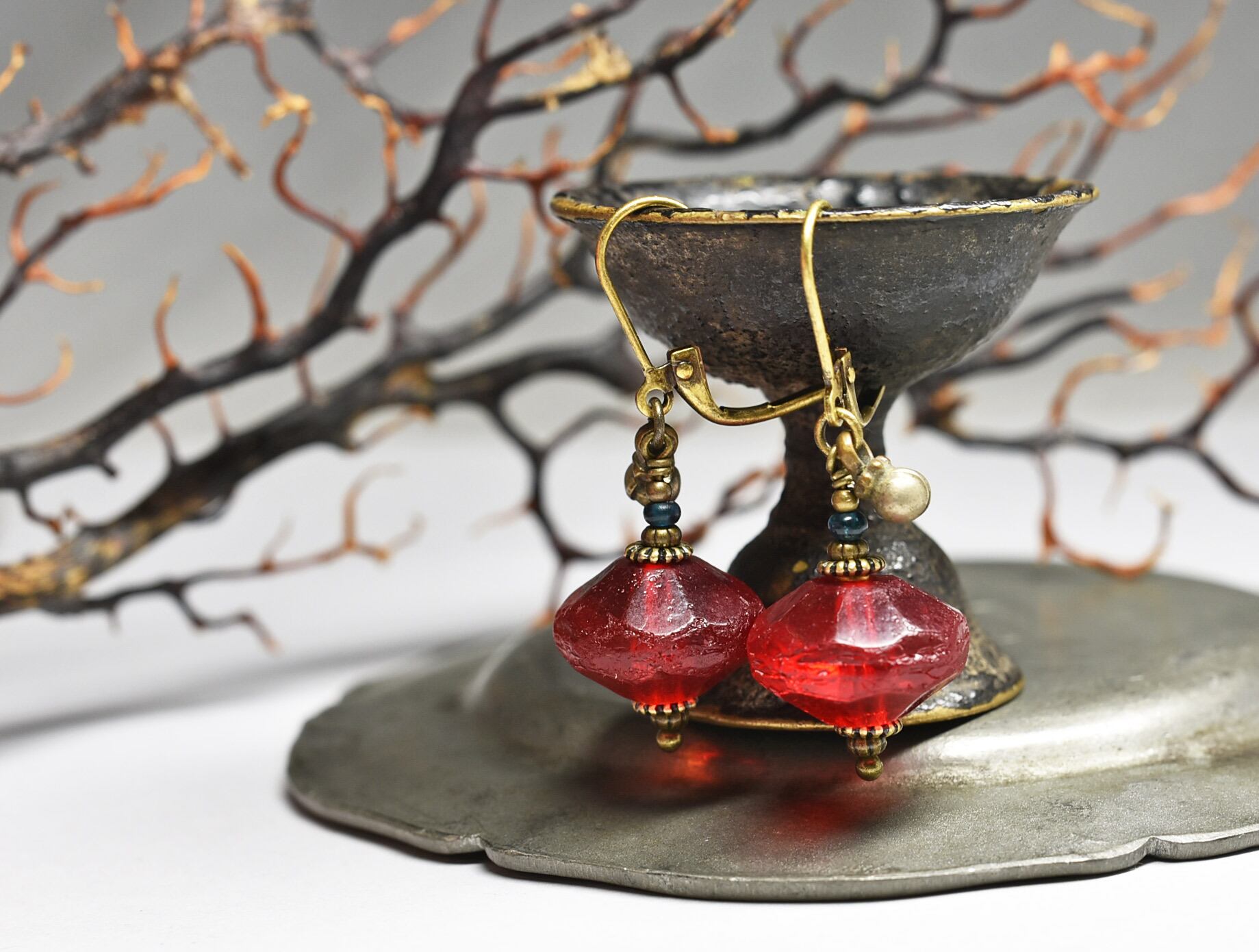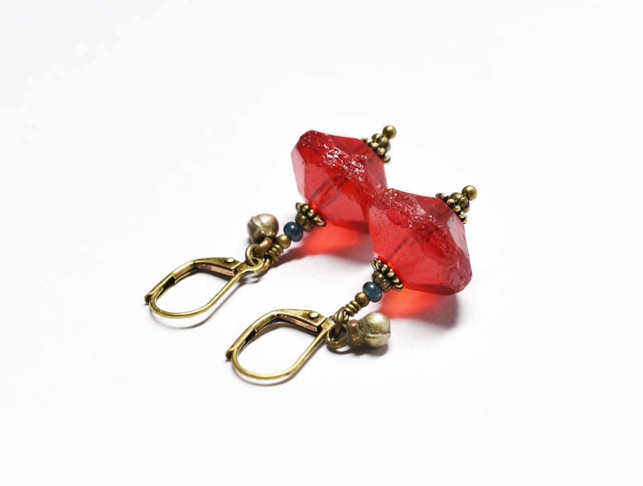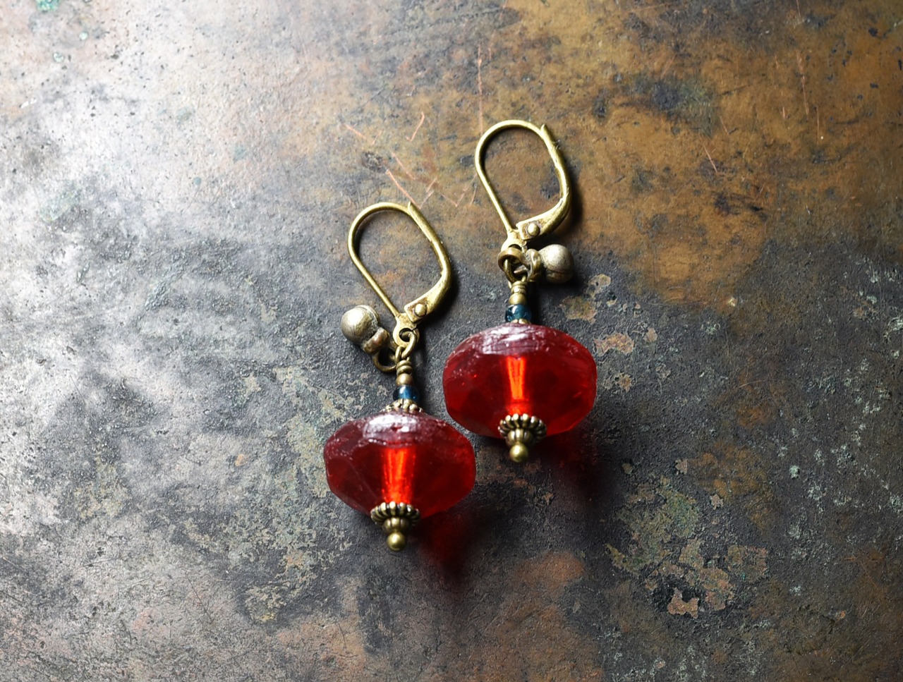 真っ赤な算盤型アンティークボヘミアビーズとインディゴブルービーズ、小さな鈴のピアス
