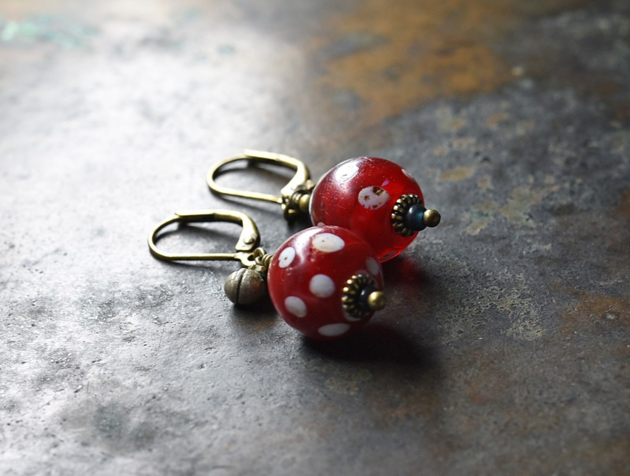 可愛らしい水玉模様のアンティークベネチアビーズ、インディゴブルービーズと小さな鈴のピアス