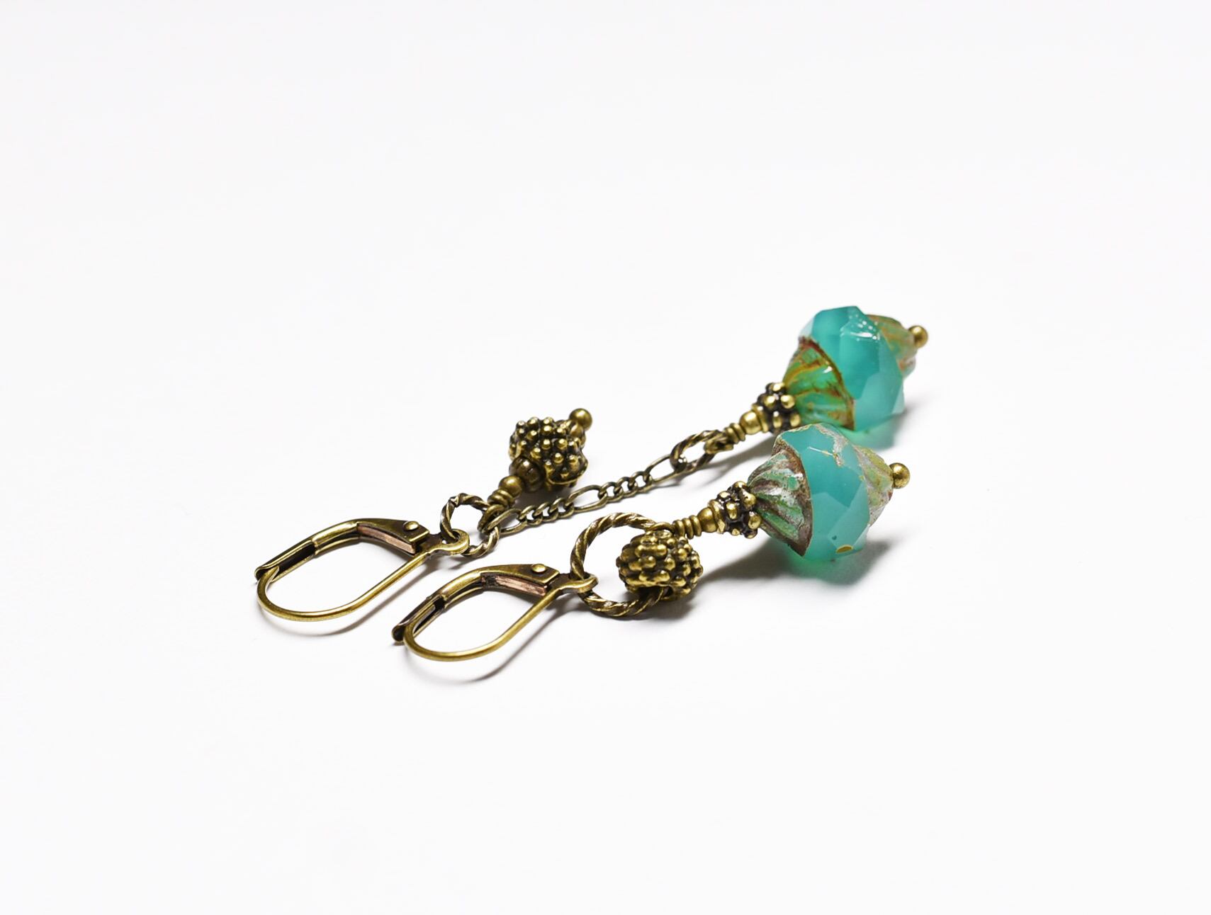 ウランガラスと松ぼっくりブラスのリング&チェーン、アンシメトリーピアス