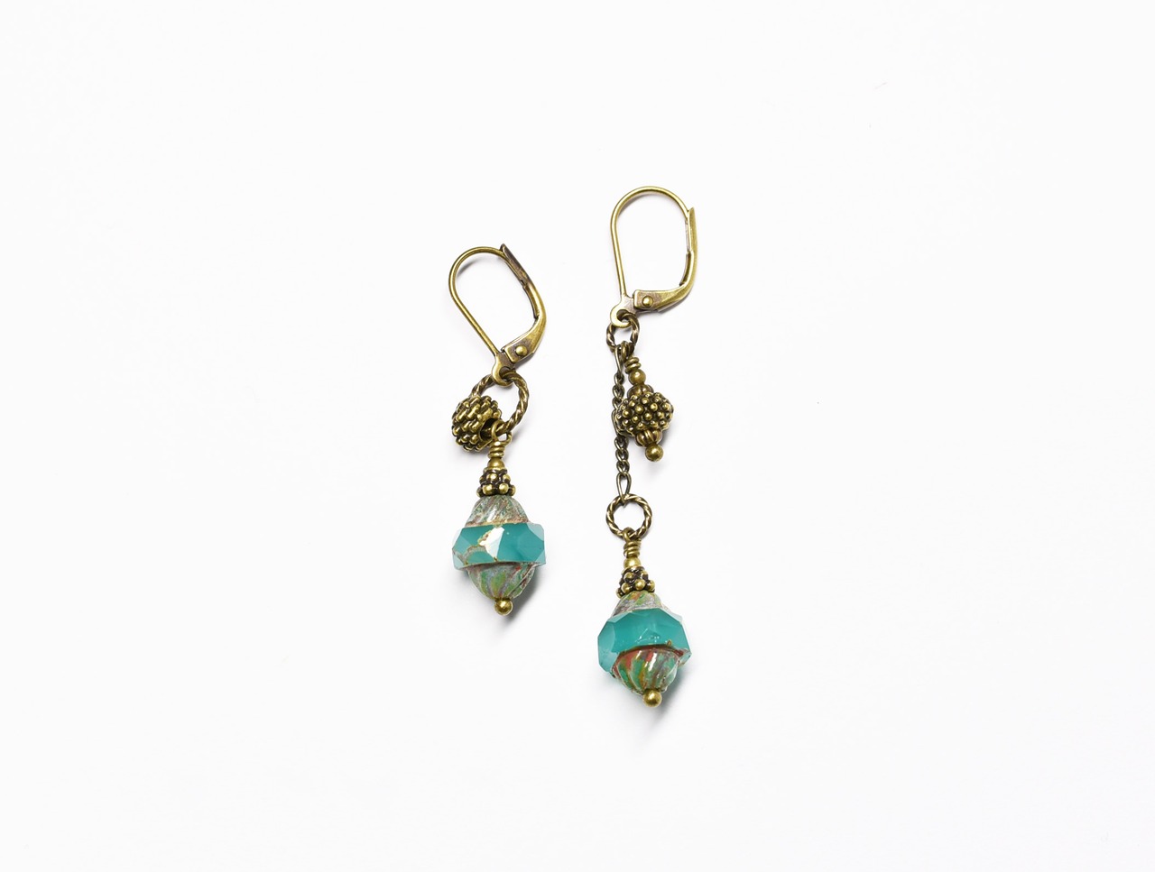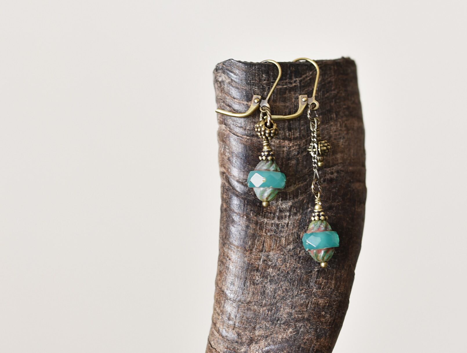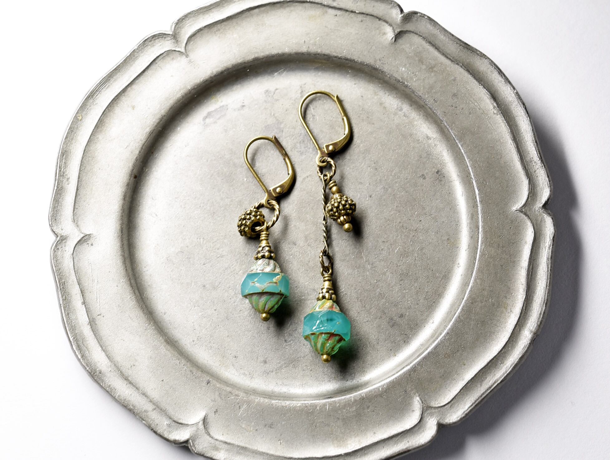 ウランガラスとブラスビーズをチェーンとリングで繋いだアンシメトリーなピアスです。