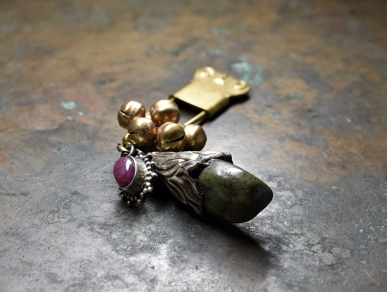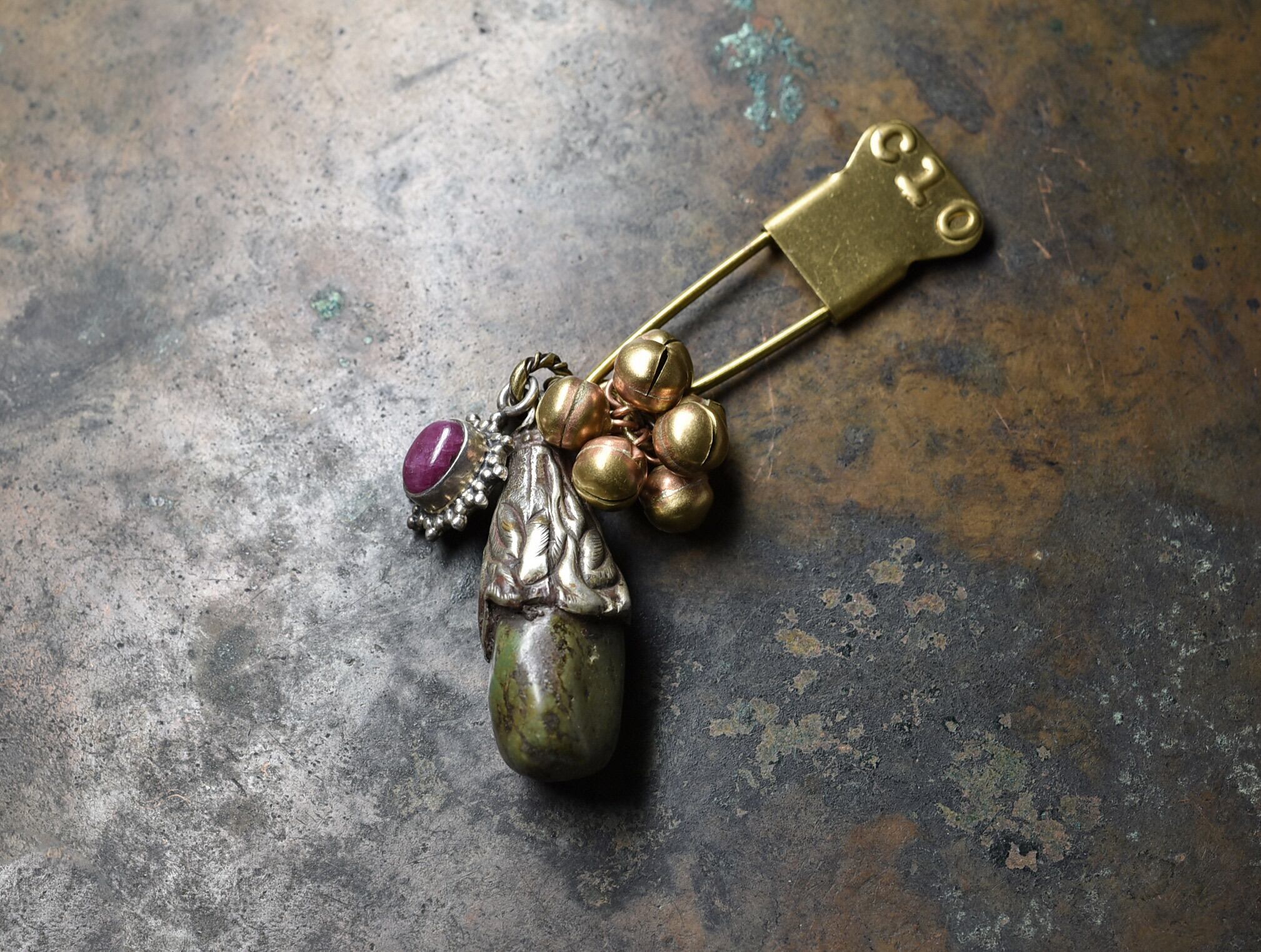 メタル装飾ターコイズと、ルビートップ、たわわな鈴を繋げたピンブローチです。