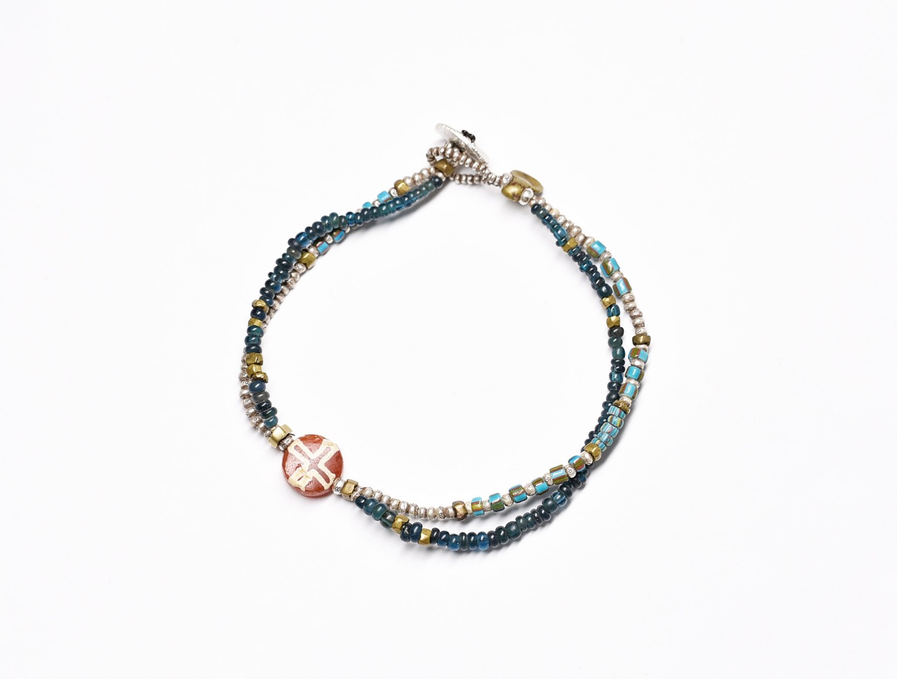 素材:エッチドカーネリアン、ガラス、カレンシルバー、真鍮、ロウビキ紐