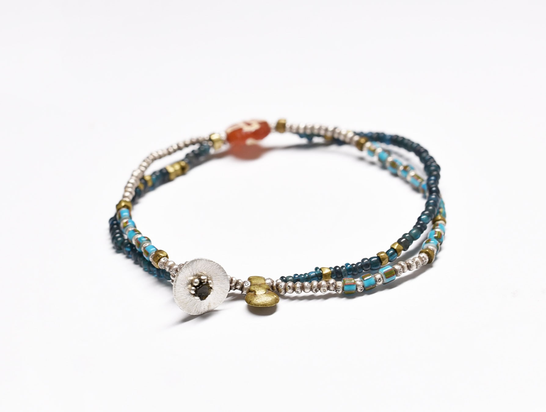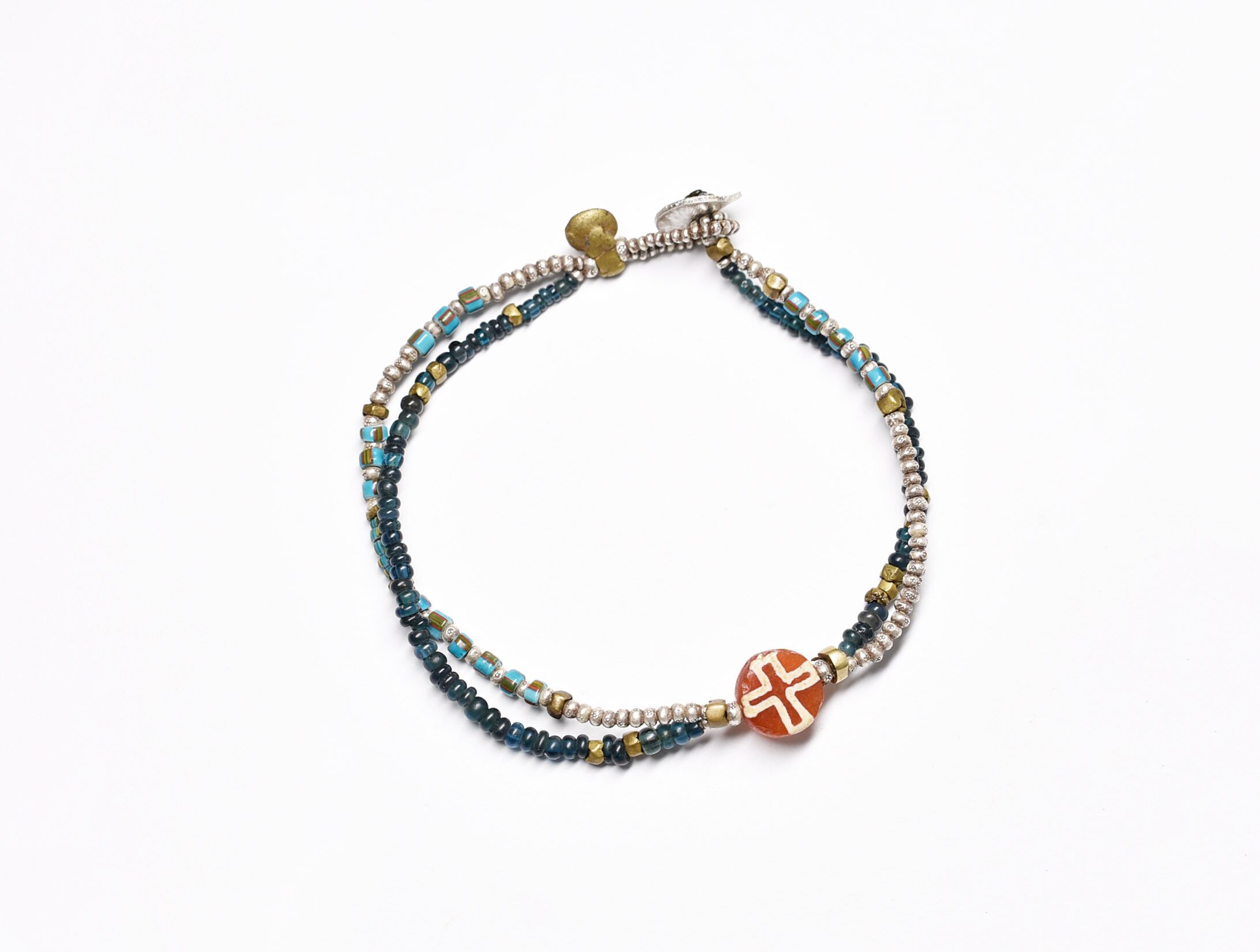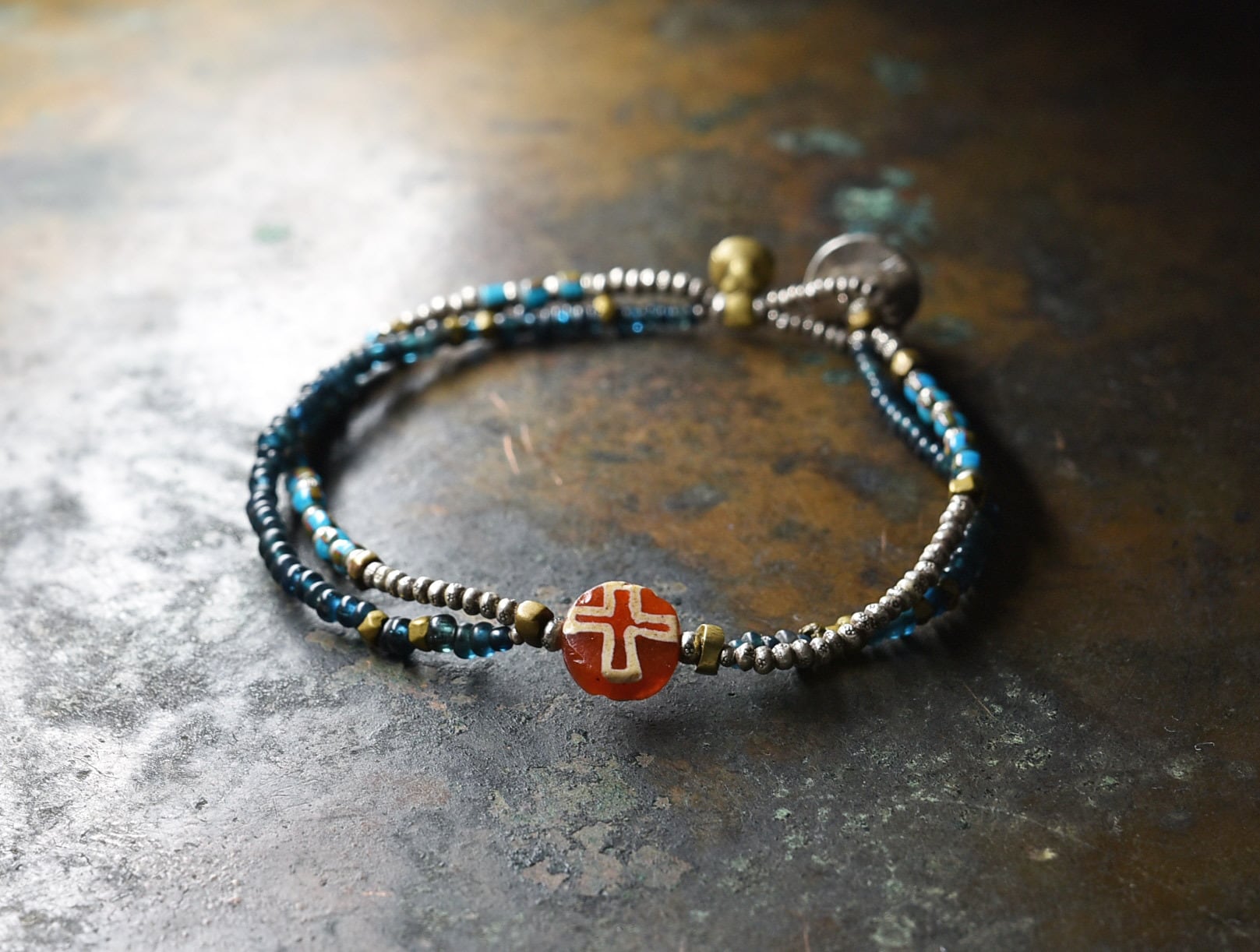 クロス模様エッチドカーネリアンとインディゴブルービーズ、縞模様ターコイズブルーホワイトハーツ、カレンシルバー、oldオリッサブラスを繋いだの2連のブレスです。