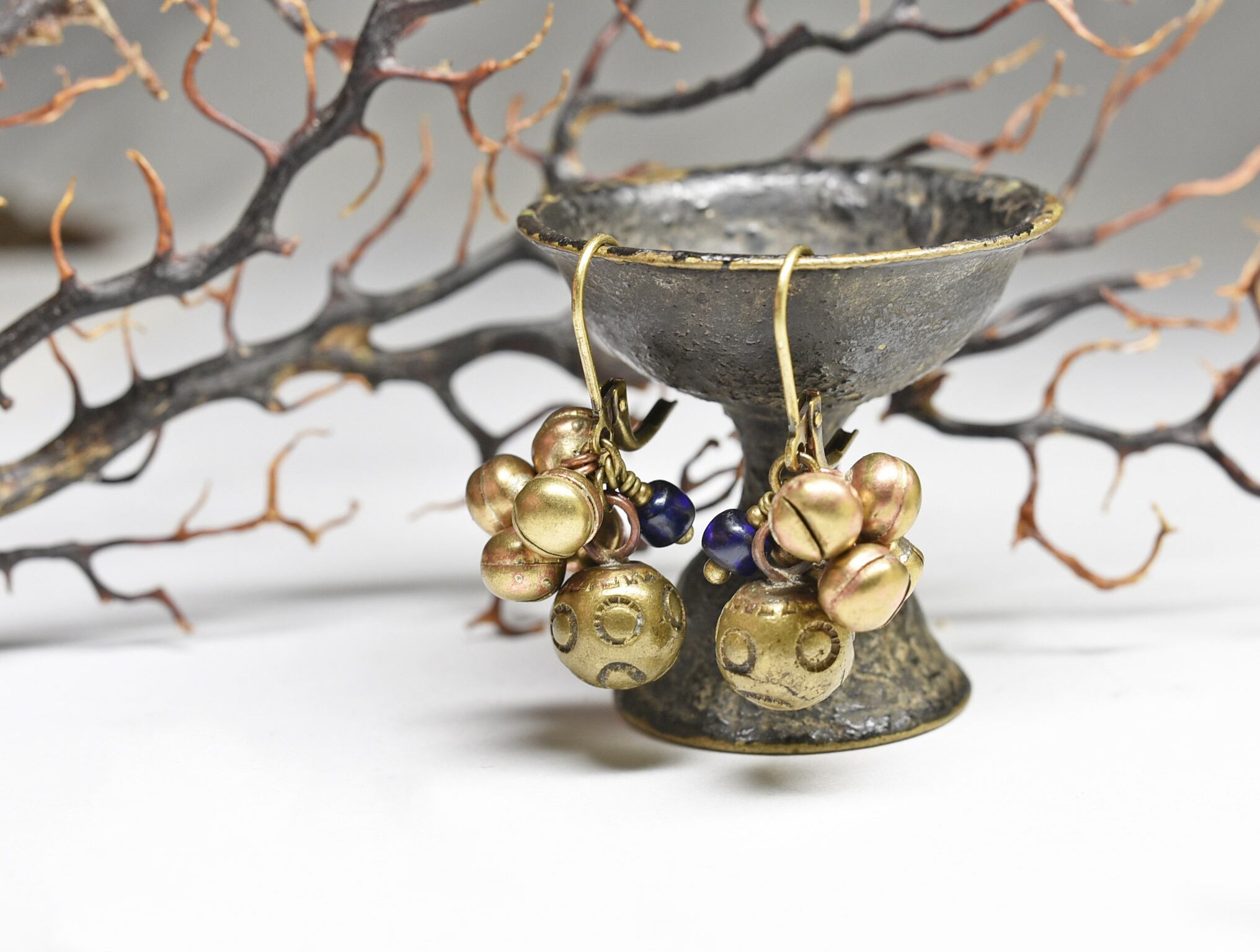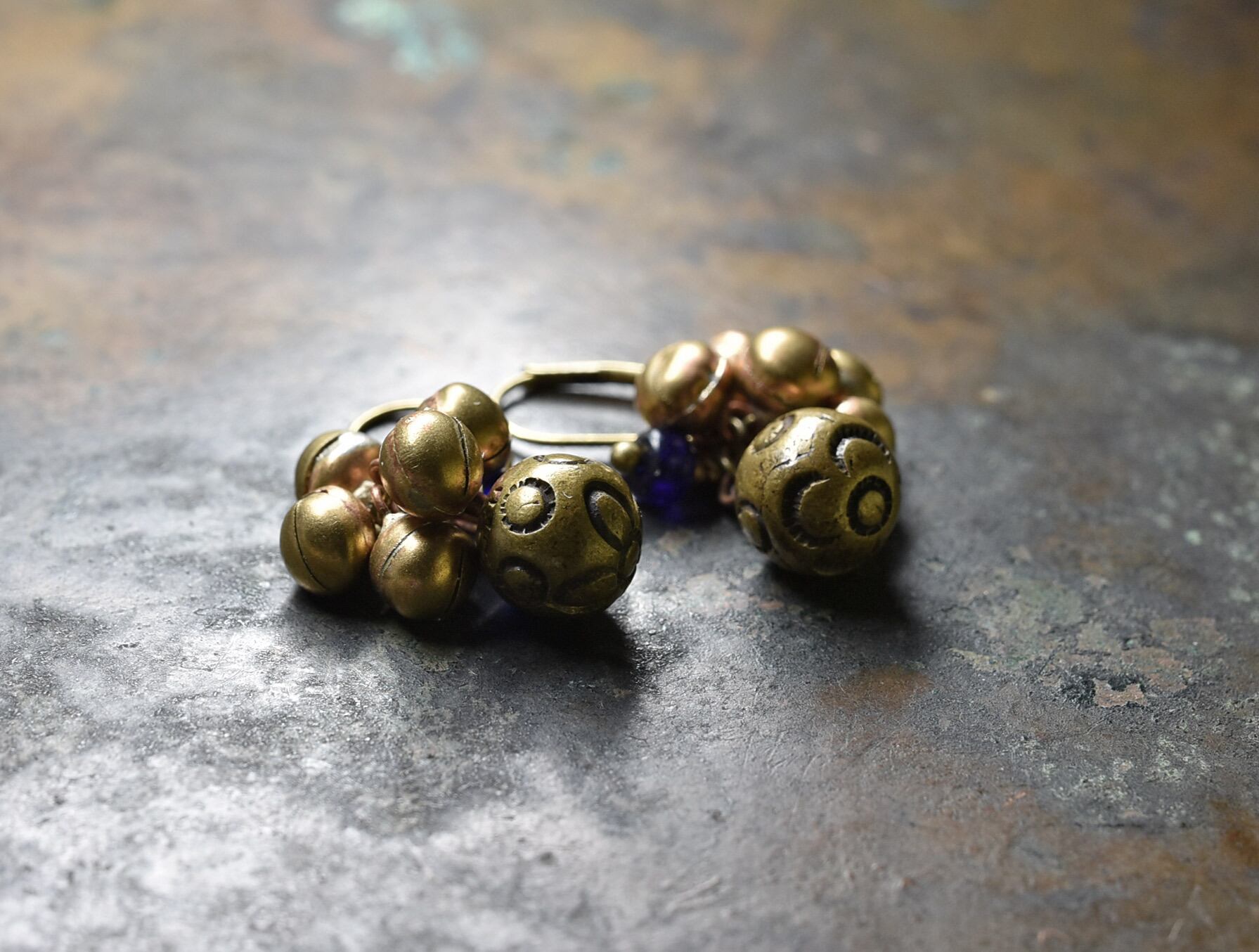 ヴィンテージボタンとたわわな鈴、瑠璃色アンティークビーズのピアス