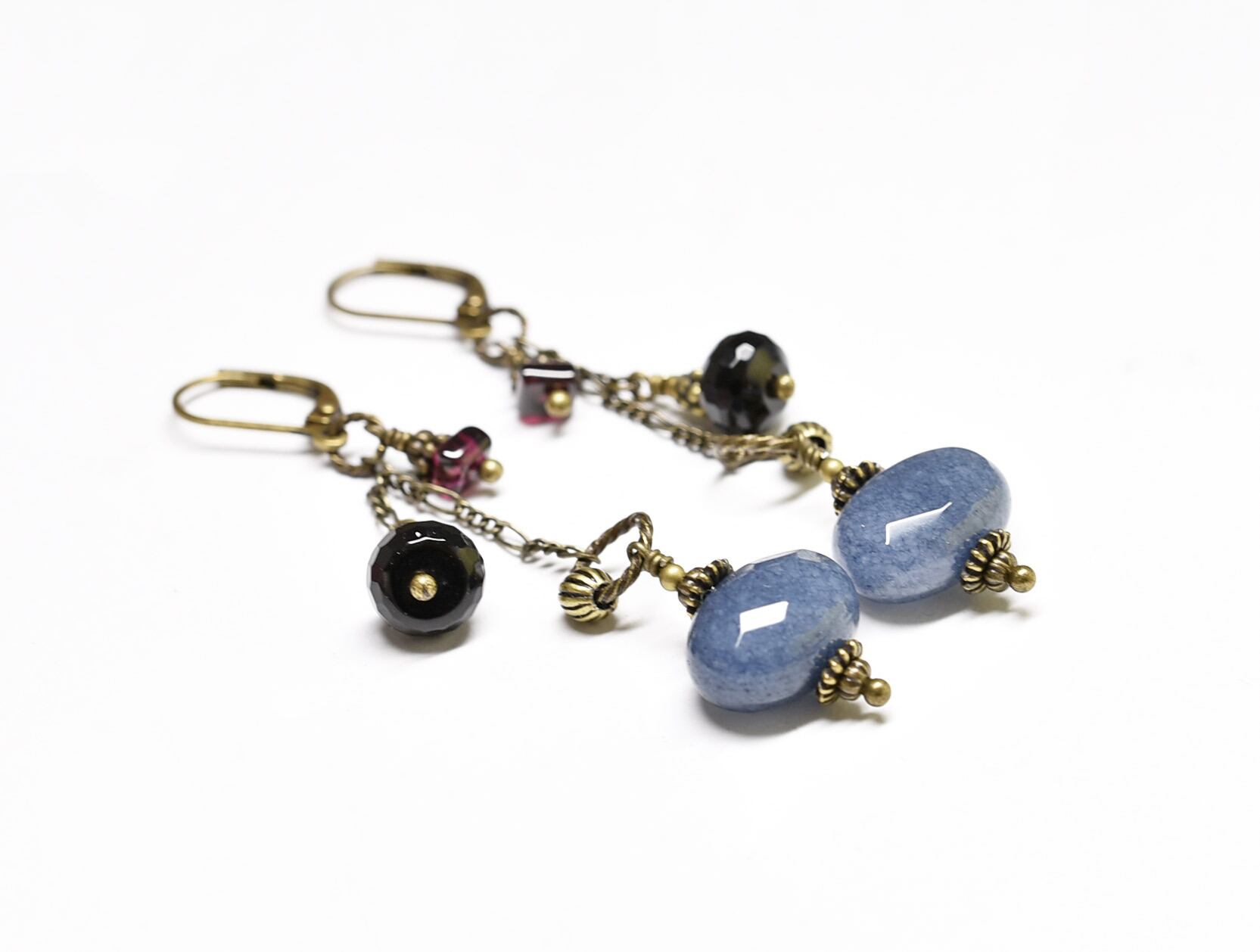 サファイアアゲートとオニキス、ガーネットのシャンデリアピアス
