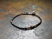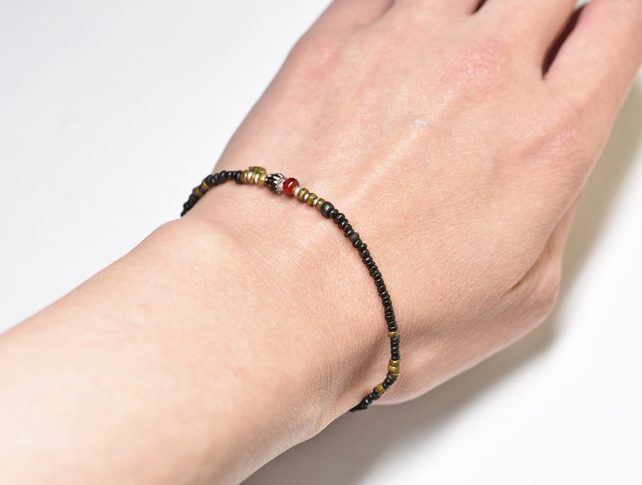 アンティークブラックビーズとoldオリッサブラス、ブラックシェブロン、ホワイトハーツの華奢なブレス