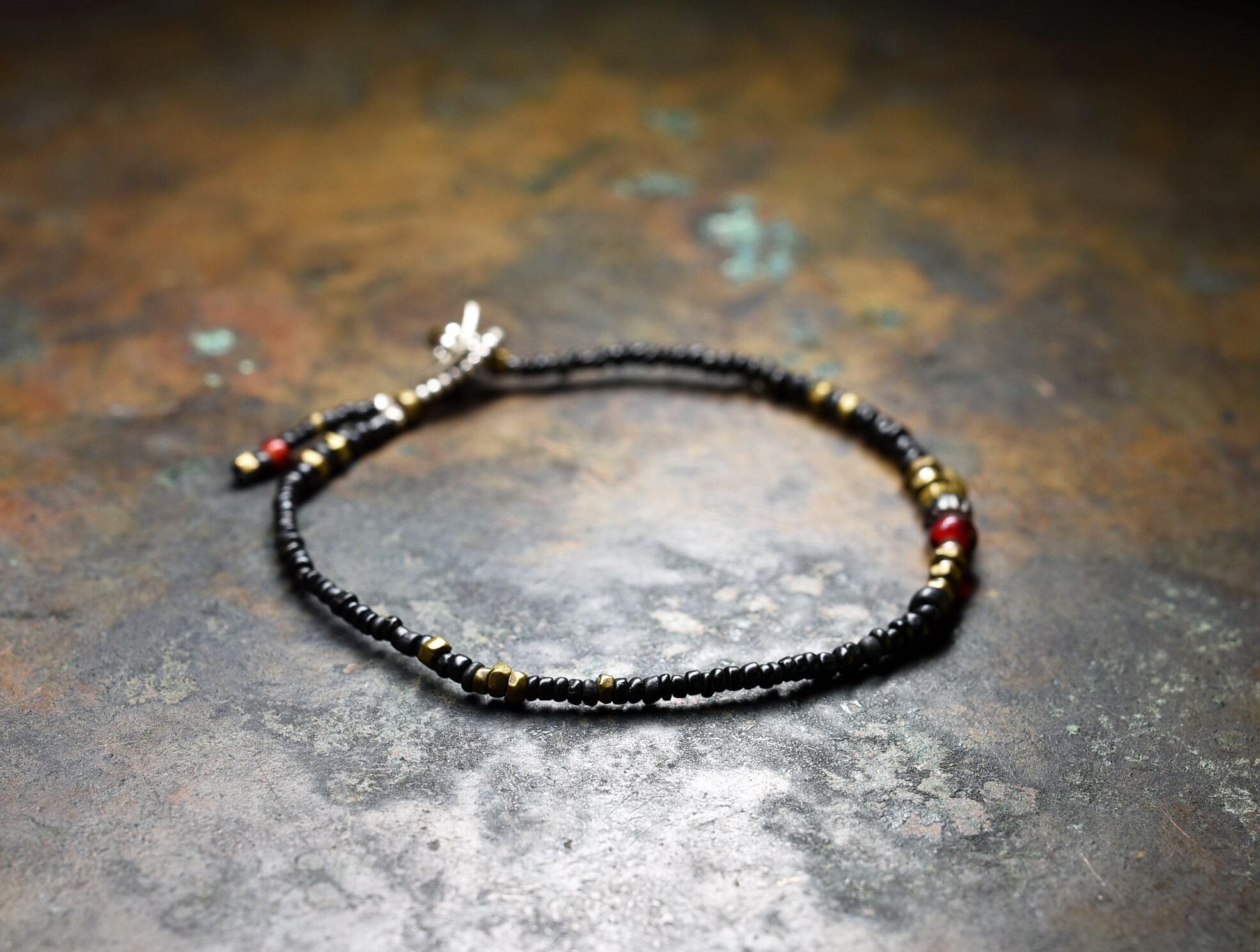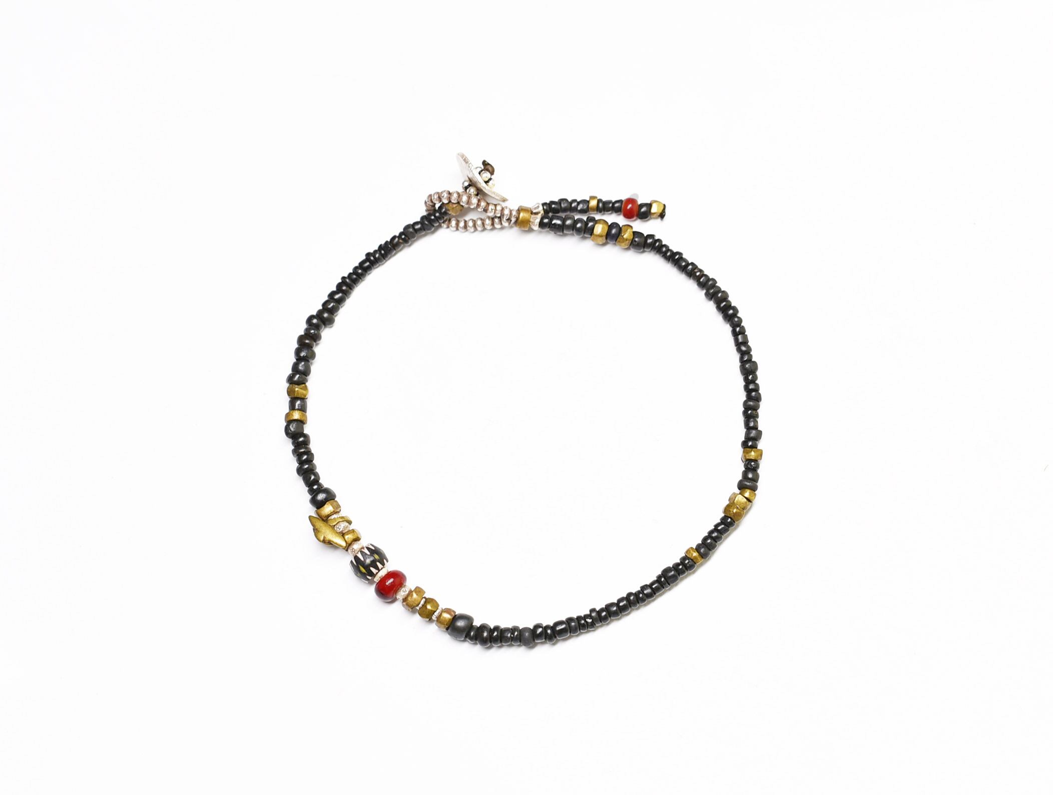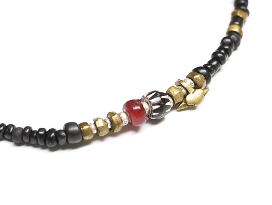 ブラックのアンティークビーズと、oldオリッサブラス、小さなカレンシルバーにブラックシェブロンと濃い色のホワイトハーツを一粒づつ入れたブレスです。