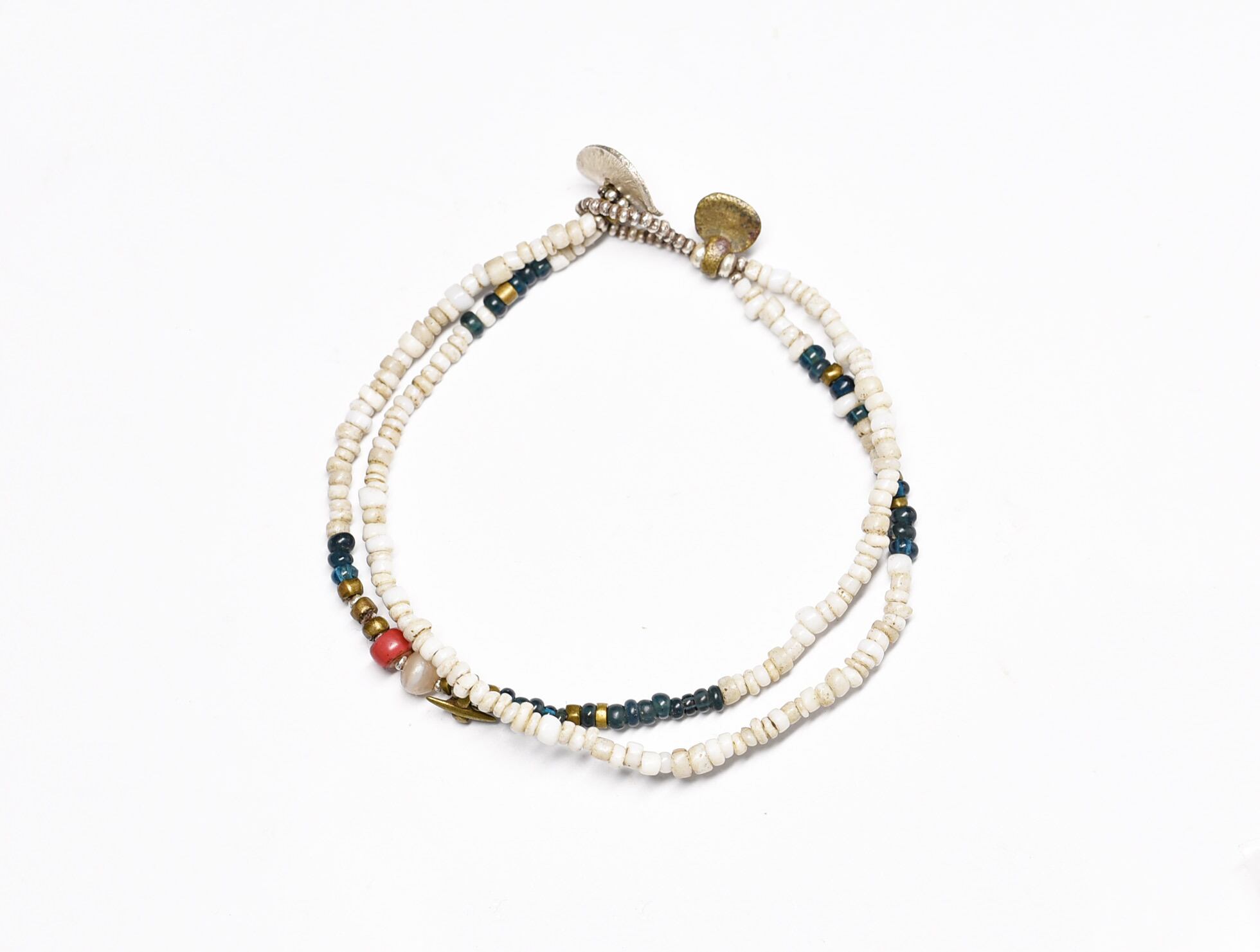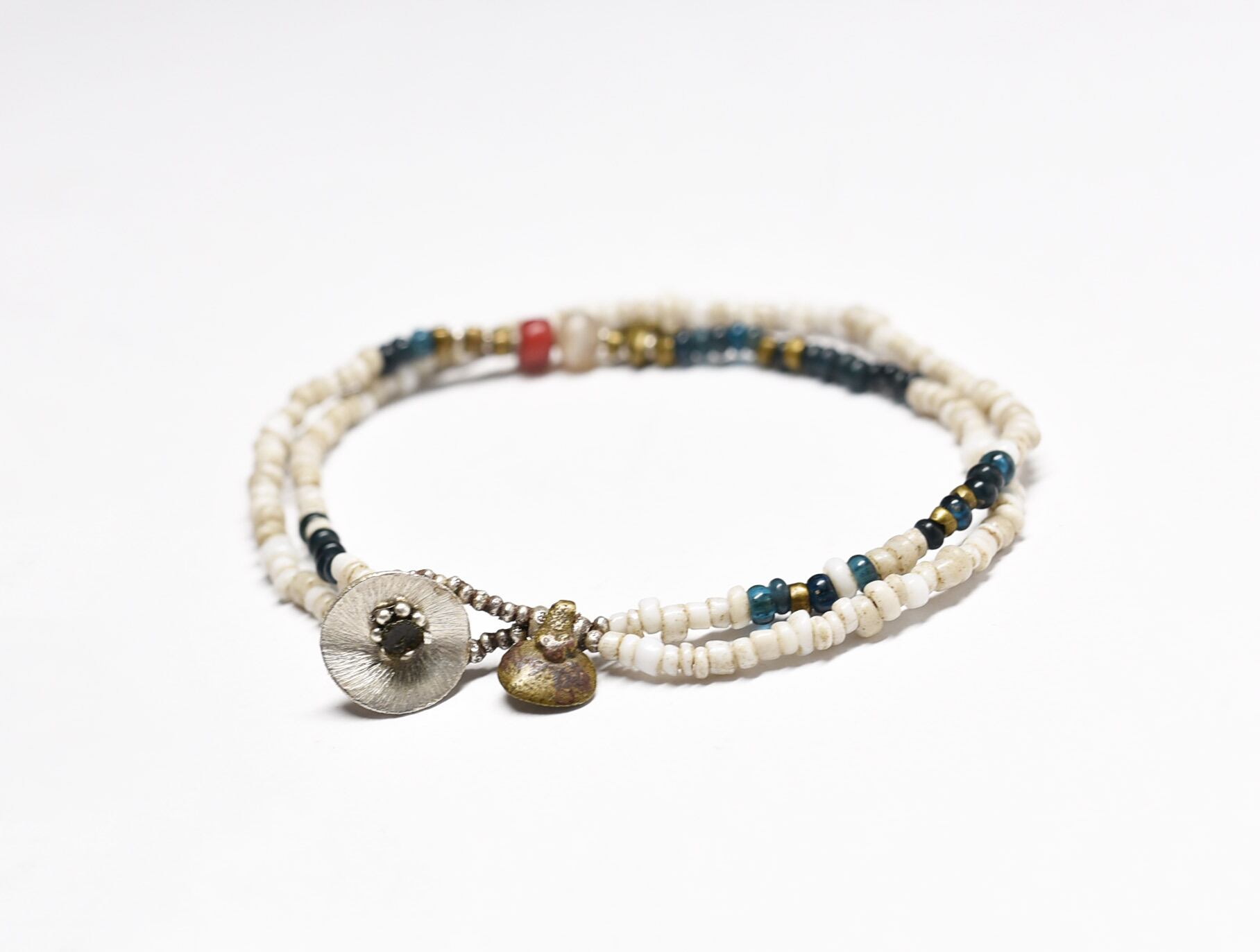 古代瑪瑙と、金赤ホワイトハーツをインディゴブルーとホワイトのアンティークビーズ、oldオリッサブラスなどを繋げた華奢な2連のブレスです。