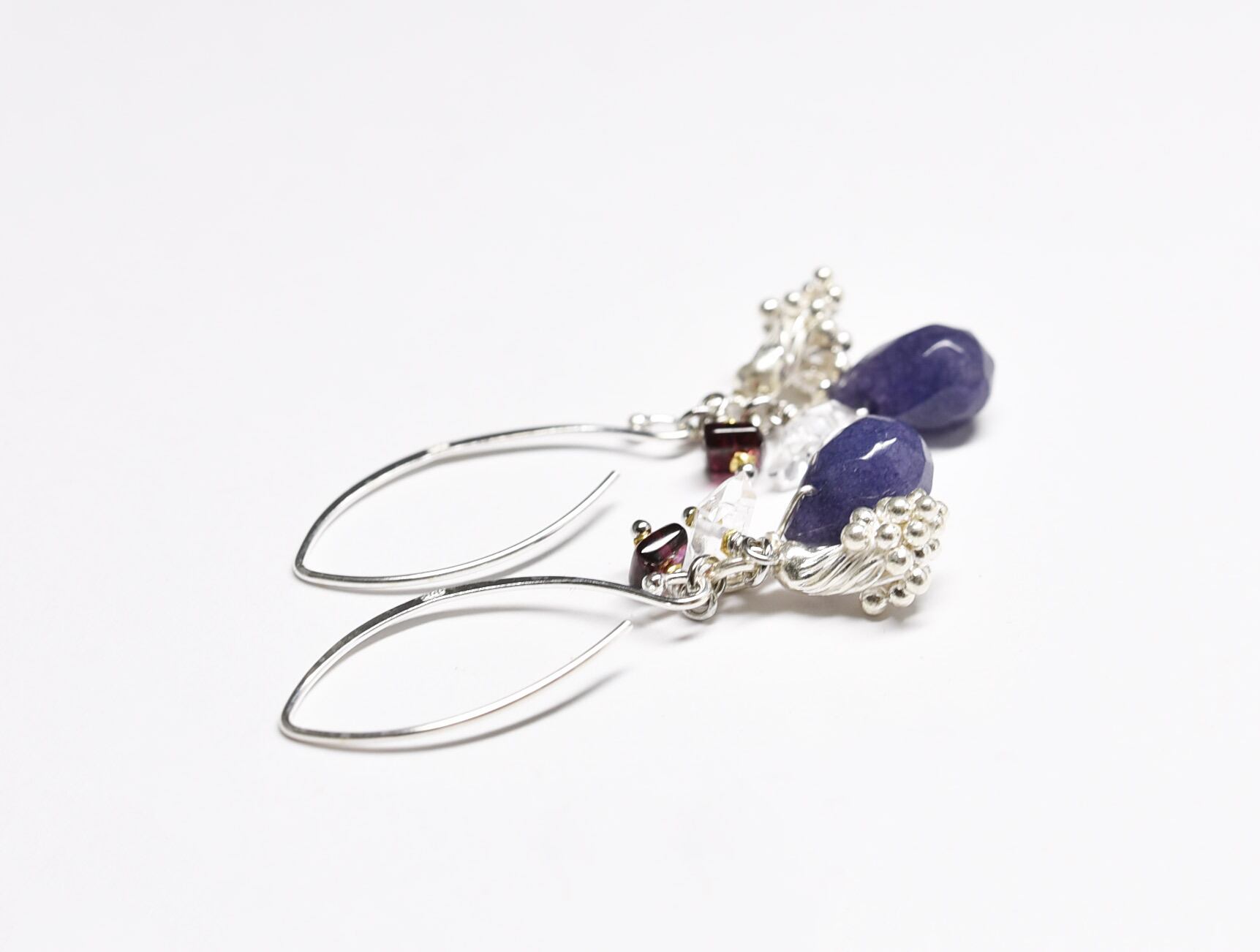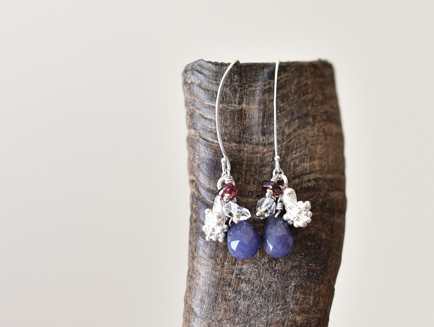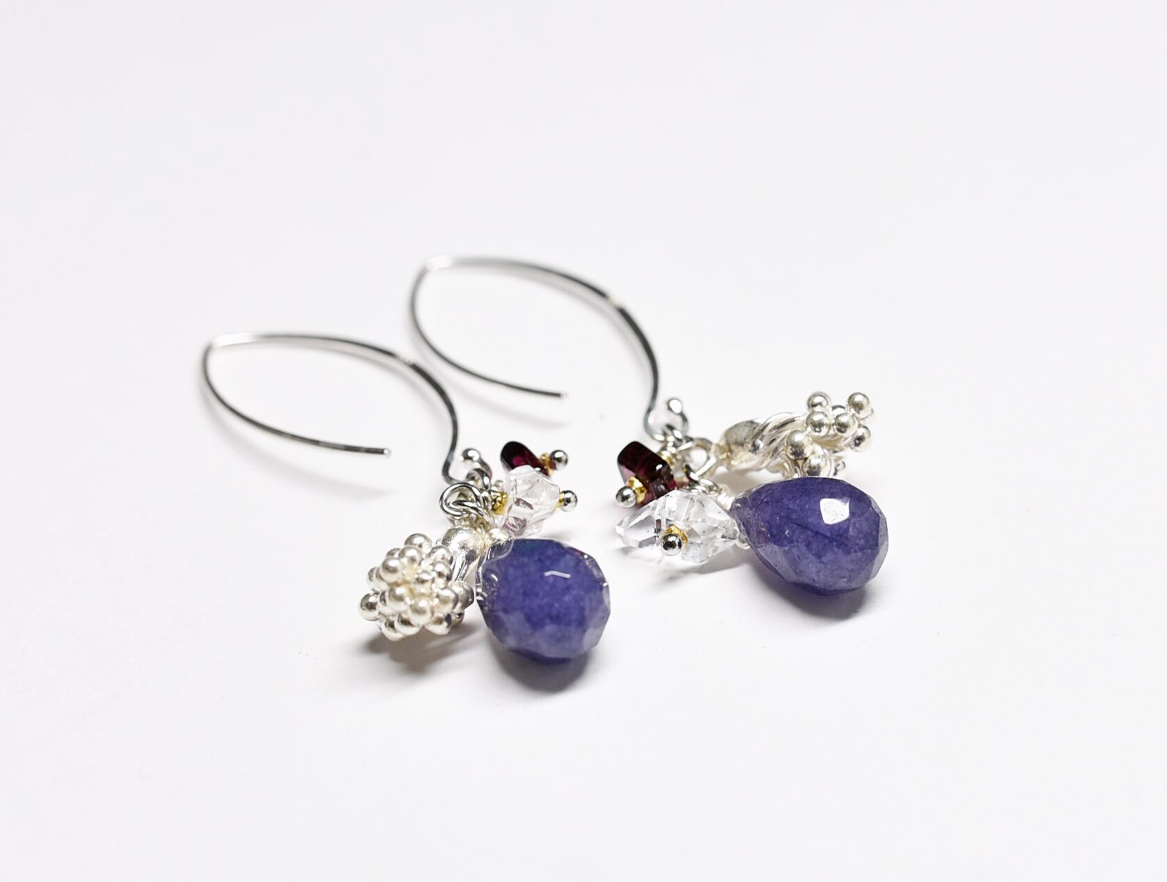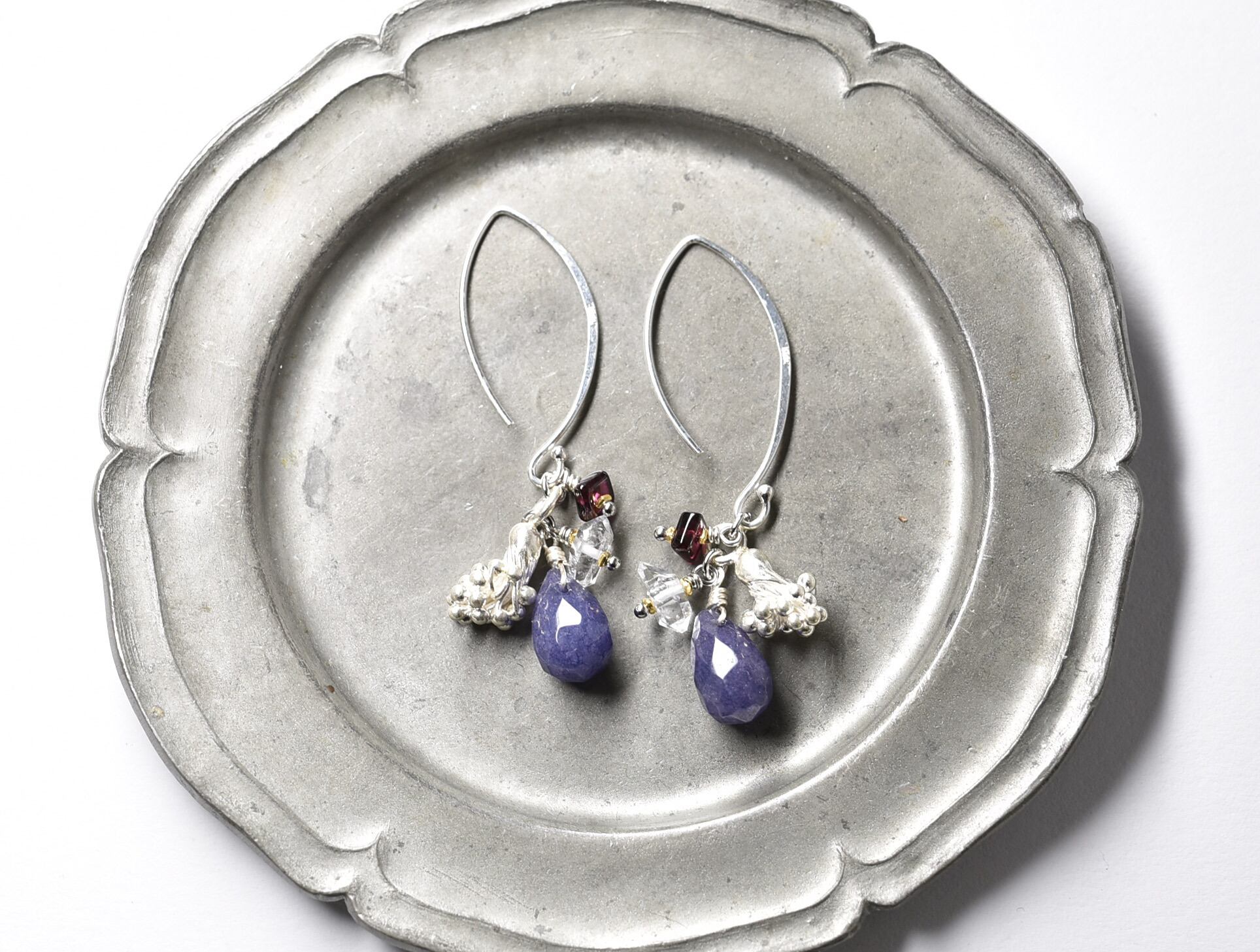 ツブツブ蕾カレンシルバーとフサファイアアゲート、ハーキマーダイヤモンド、ガーネットのフックピアス