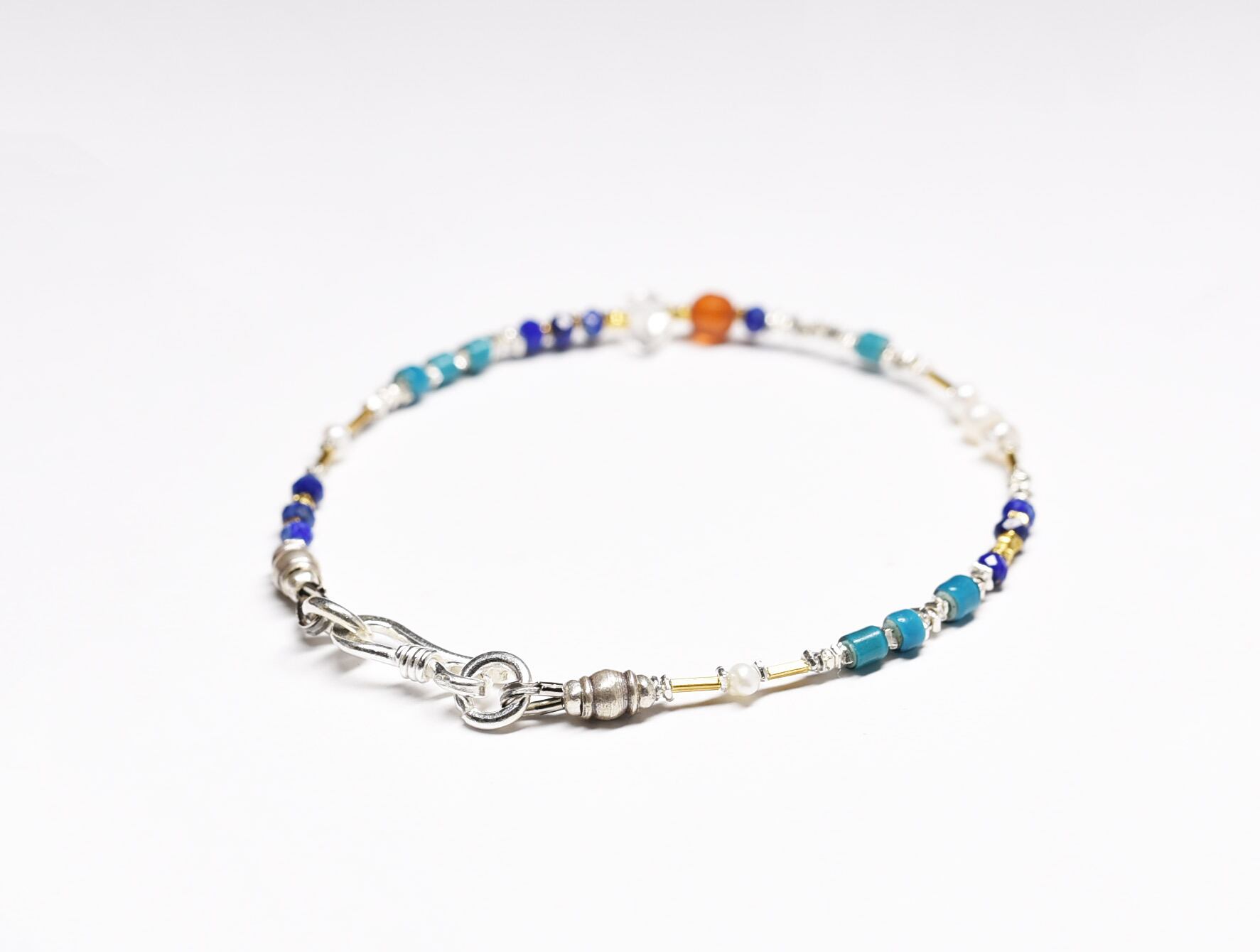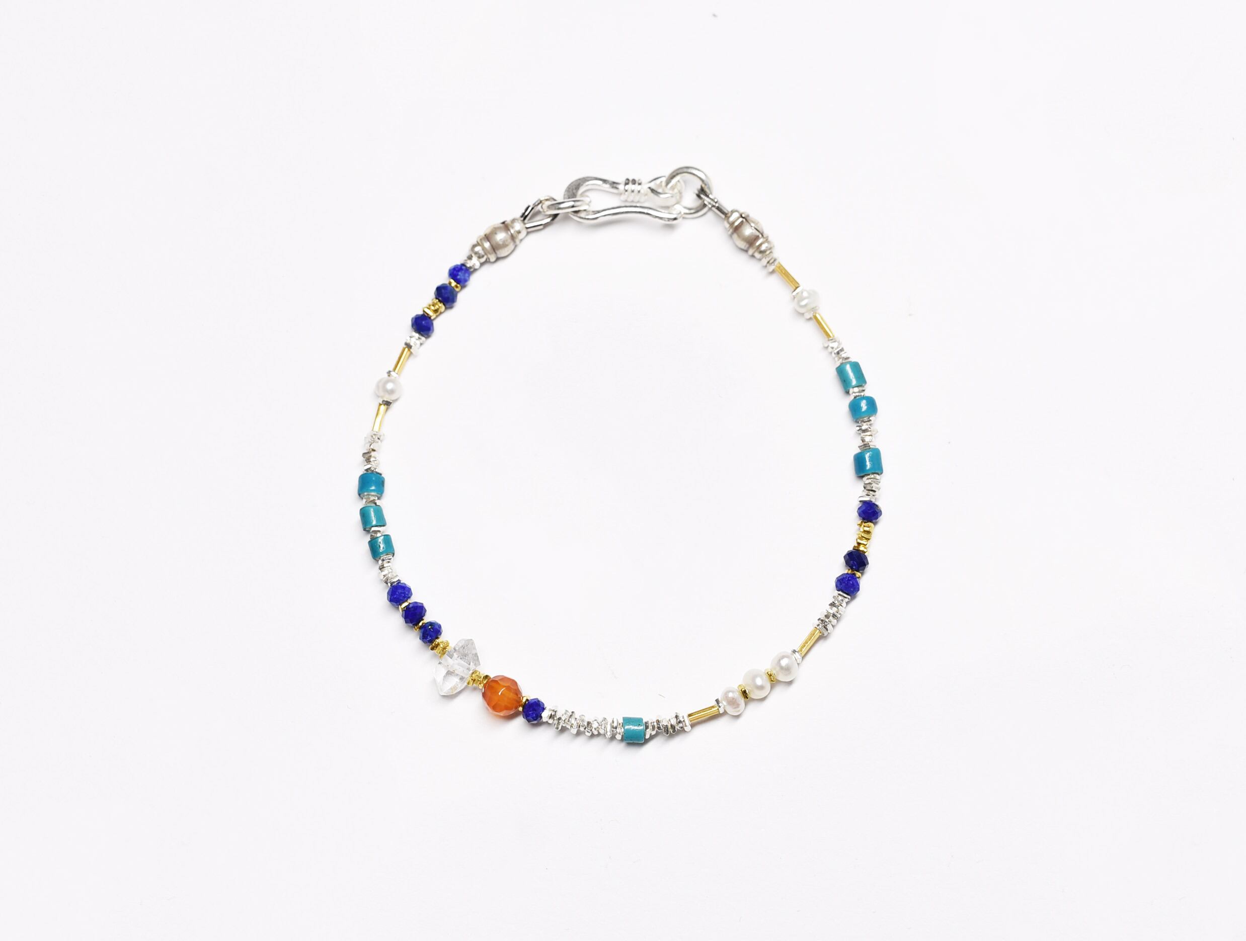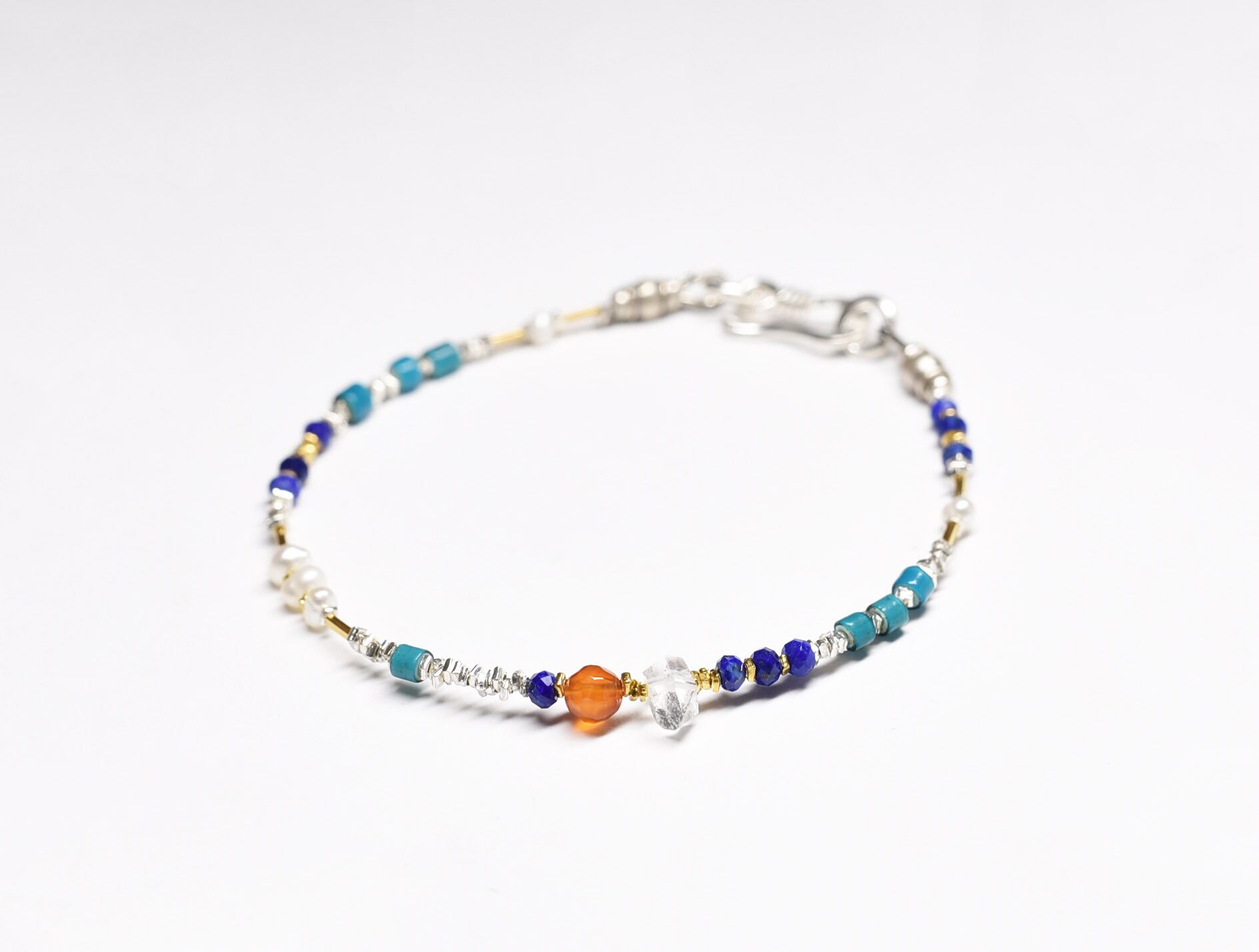 ハーキマーダイヤモンドとカーネリアン、ラピス、パールとターコイズブルーホワイトハーツとカレンシルバーの華奢なブレス