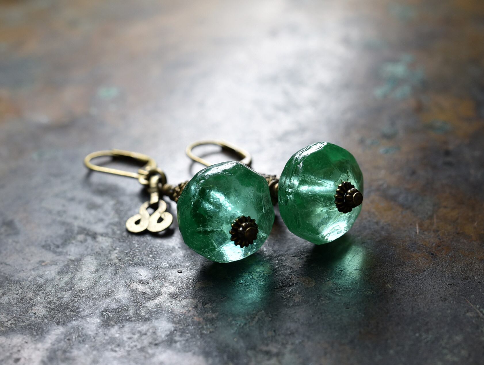 アンティークウランガラスとベニン族のツブツブビーズ、アフガンパーツのピアス