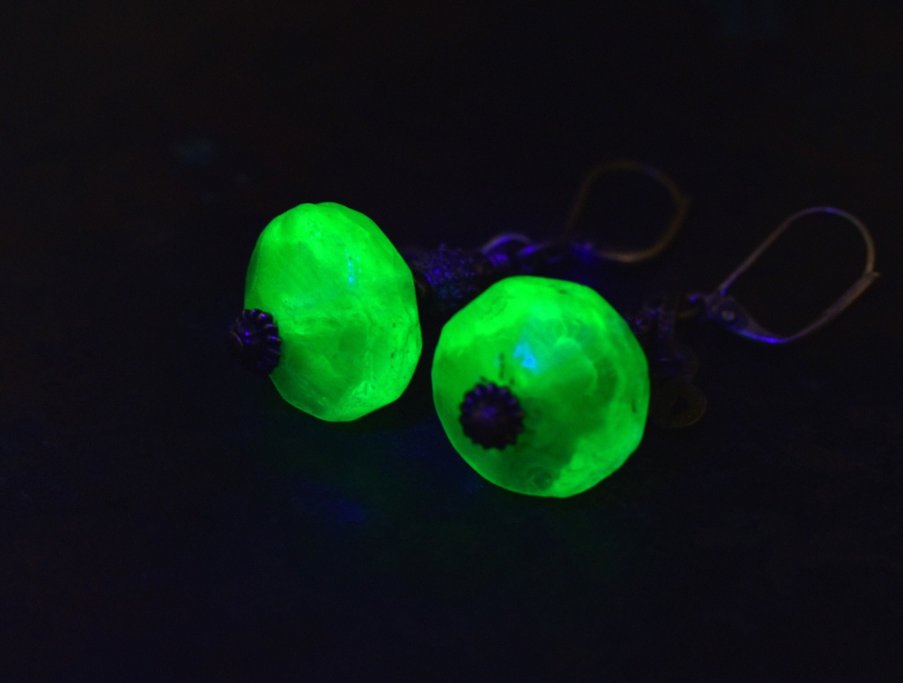 独特なセミクリアグリーンのビーズは、極々微量のウランで発色させています。ブラックライトを当てると光ります!