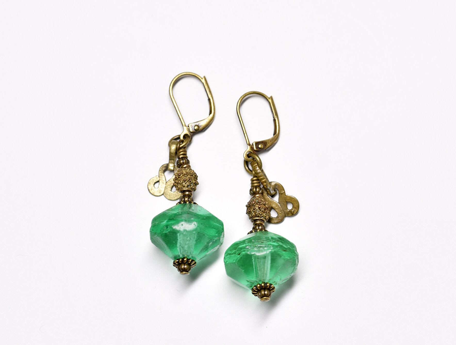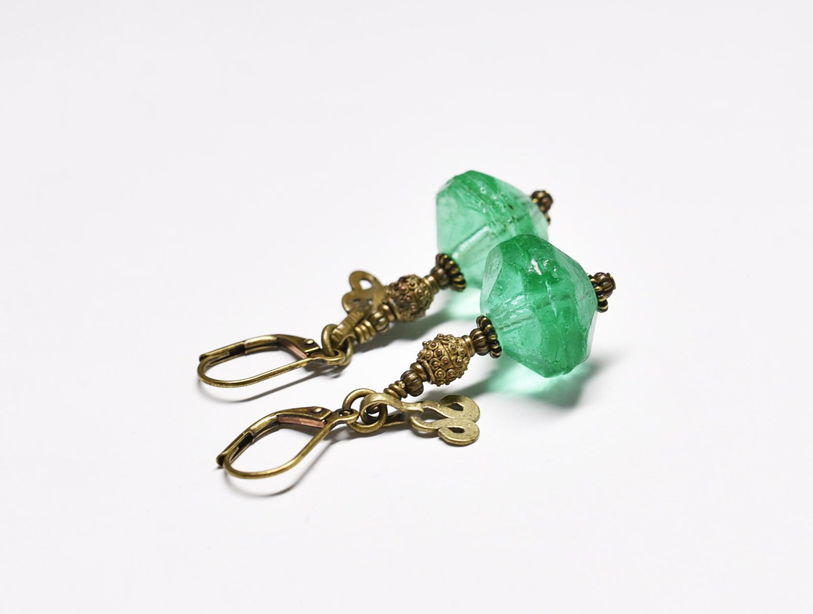 美しくも味わいのあるグリーンと、ふりメタルパーツのコントラストが素敵なピアスです。