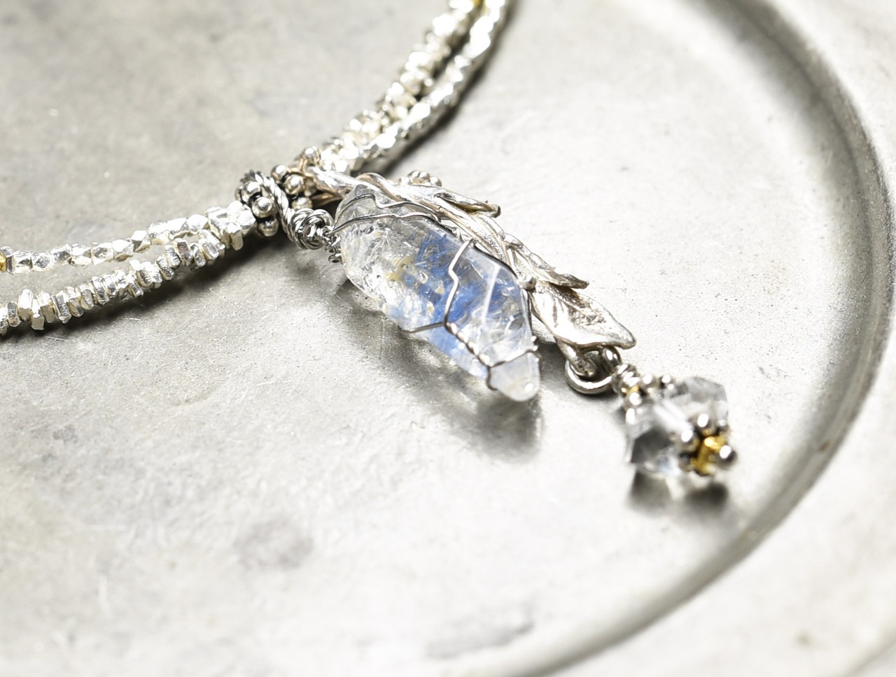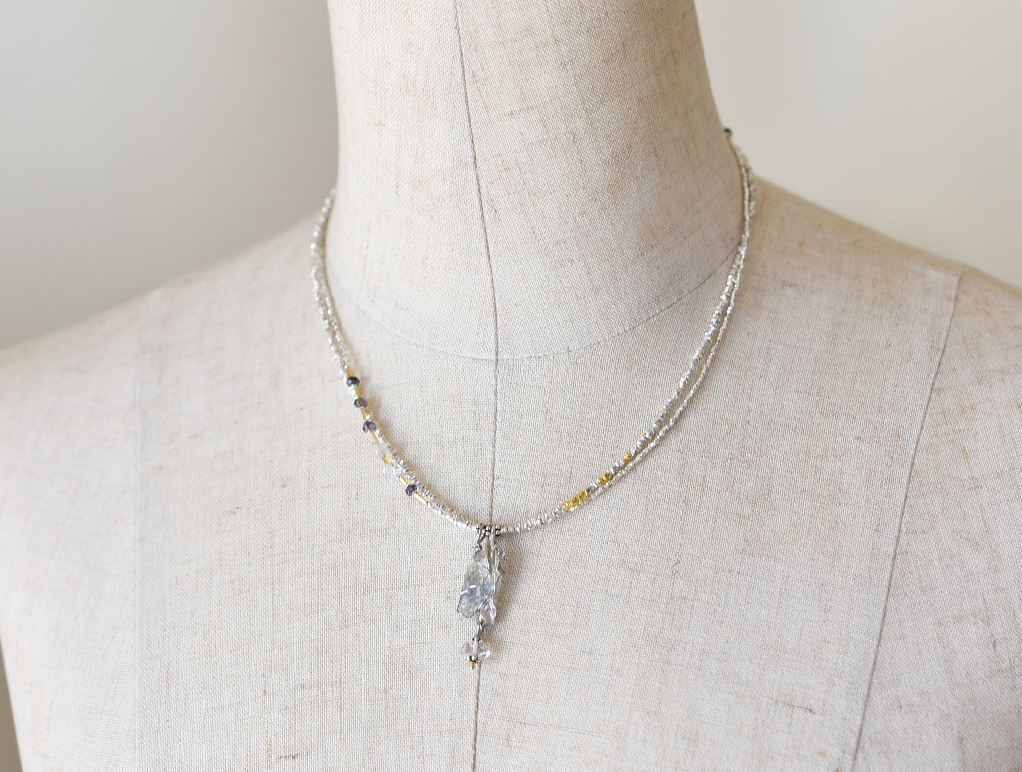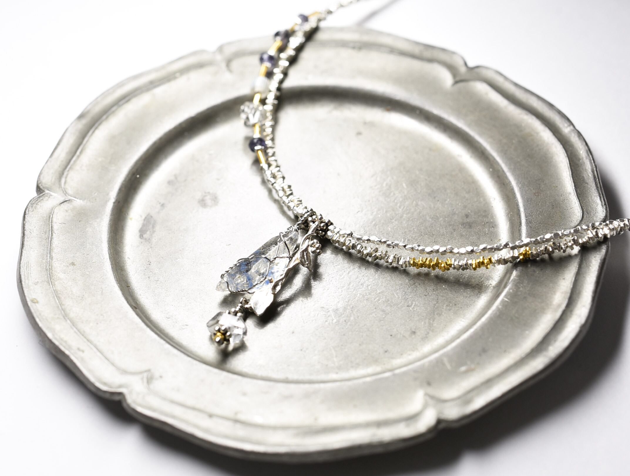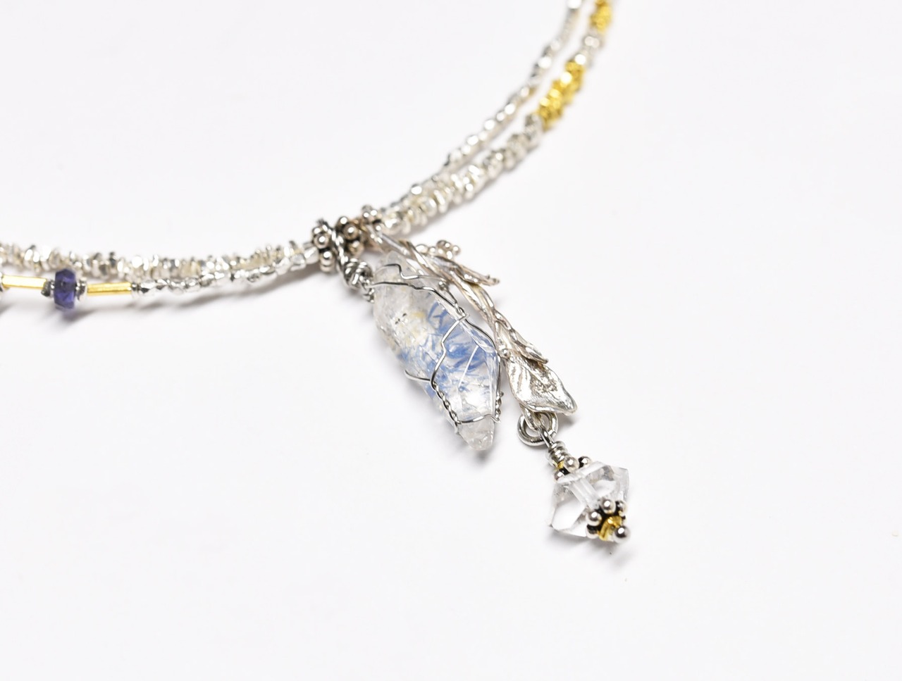 デュモルチェライトインクォーツ、ボタニカルなシルバーパーツと、ハーキマーダイヤモンド、アイオライト、カレンシルバービーズを繋いだ2連のネックレスです。