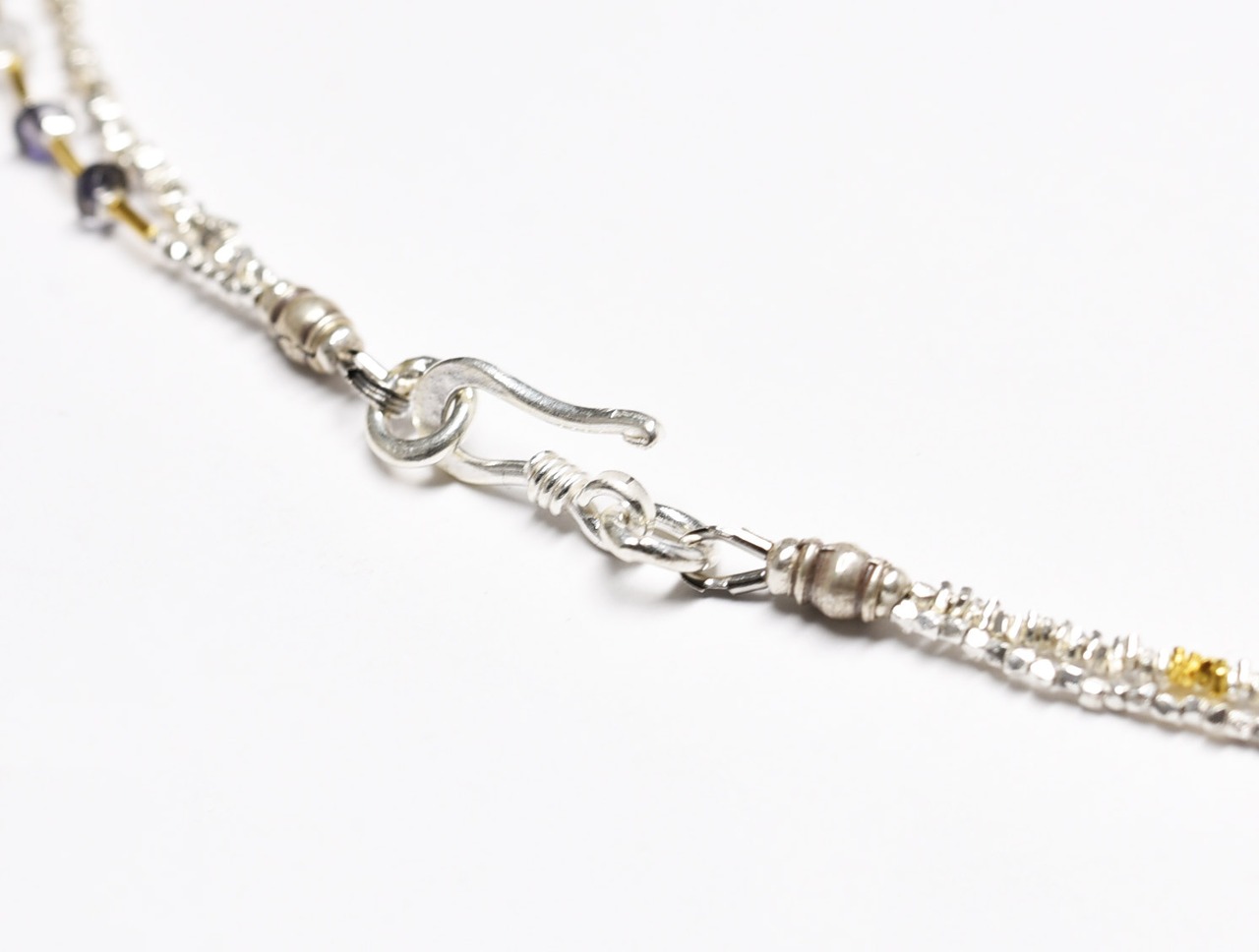 小さな渋い青紫色のビーズはアイオライトです。ラフな多面体カットが施されています。
