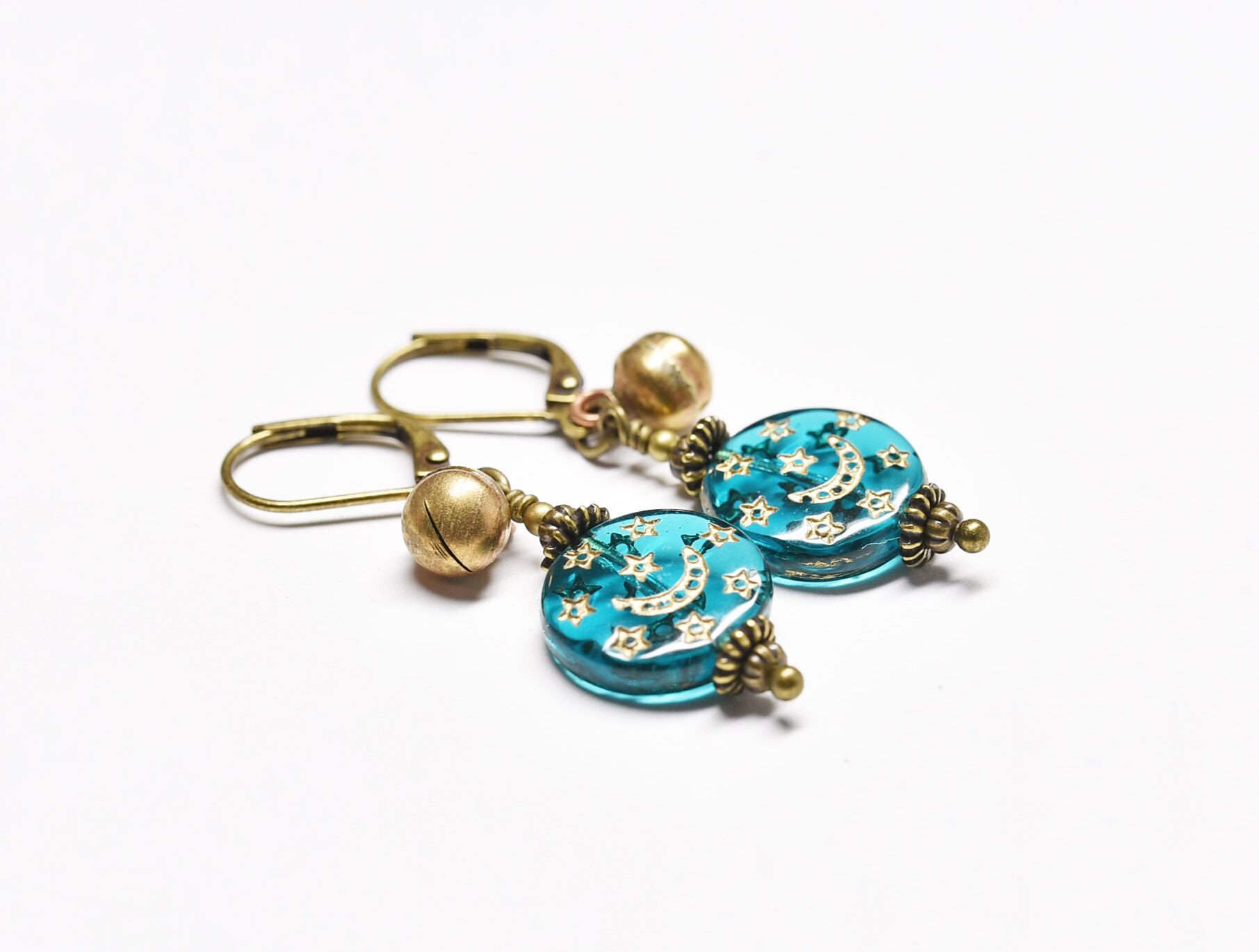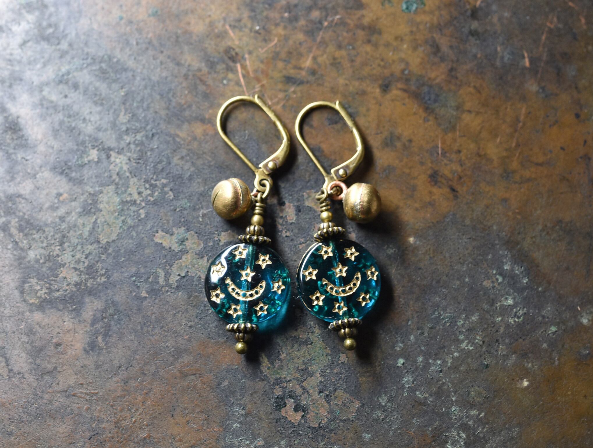 月と星の模様が施された聖者のビーズと、小さな鈴を繋いだピアスです。
