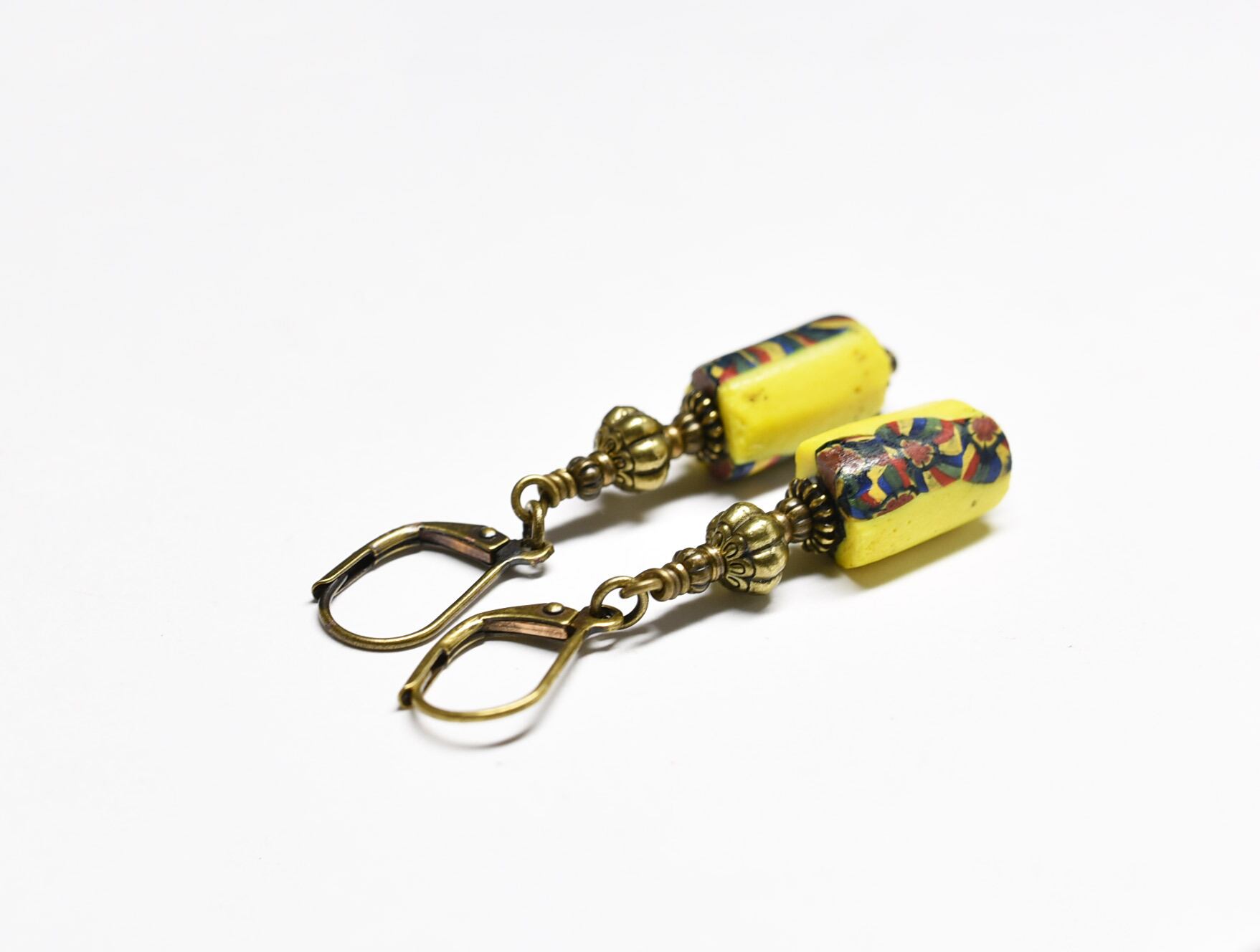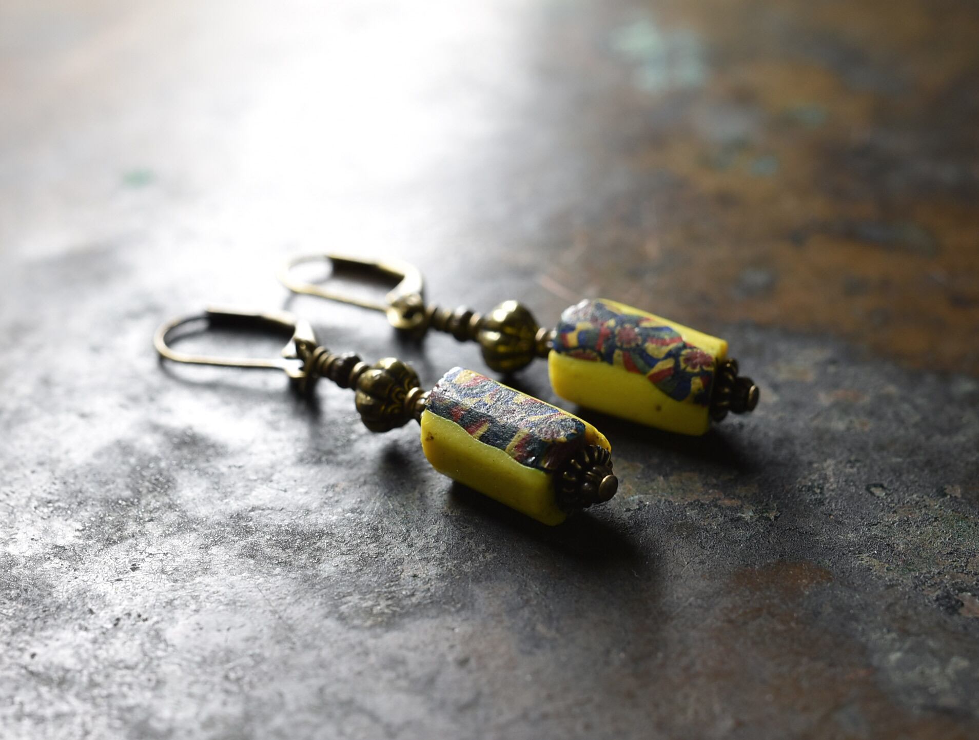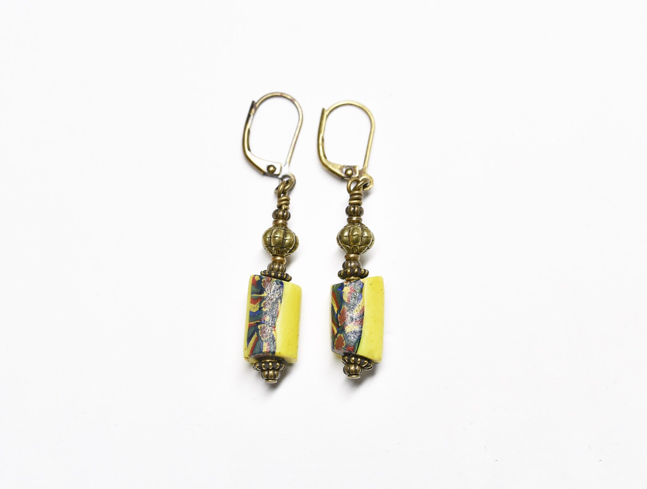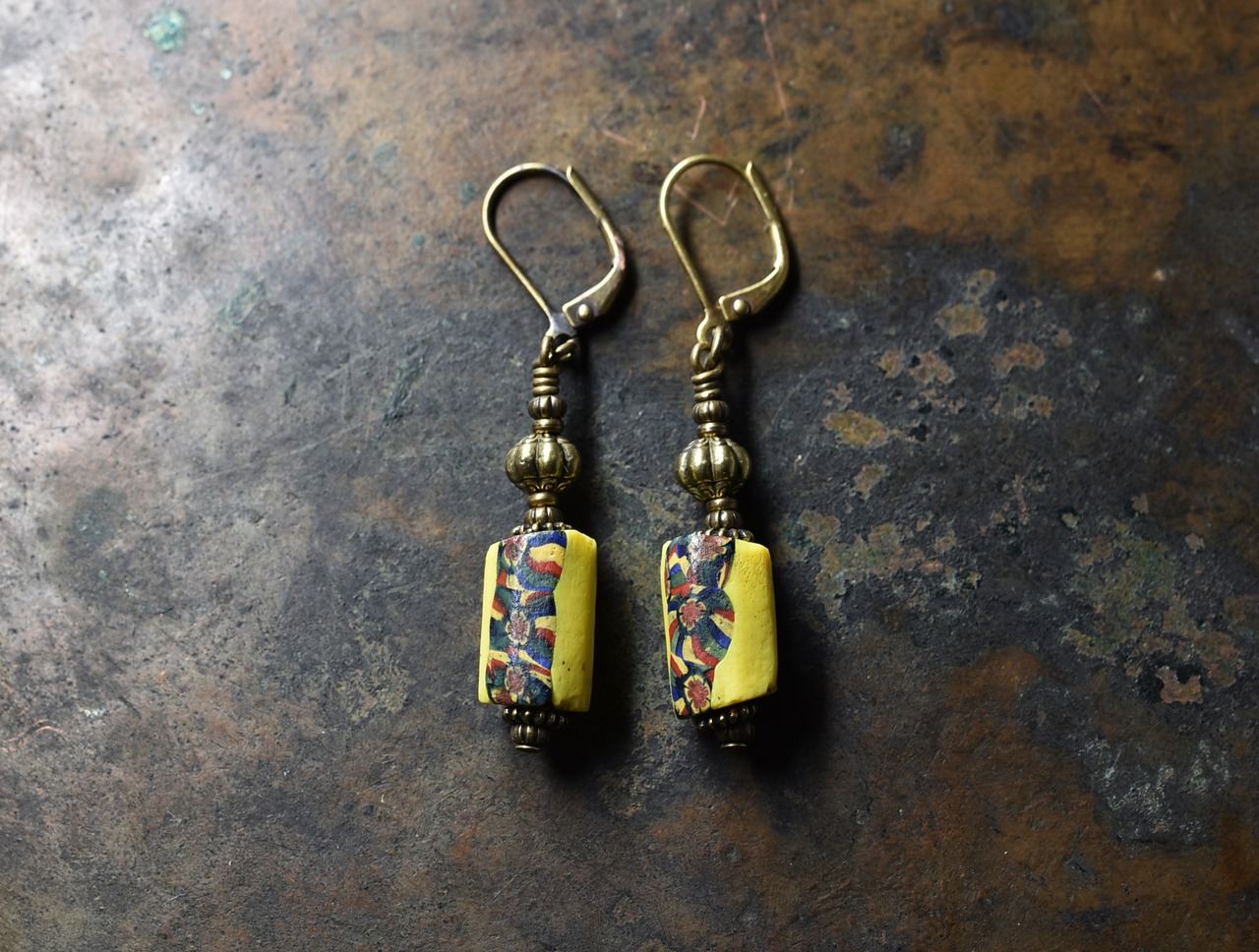 イエロー&クレイジーミックスベネチアアンティークミルフィオリとブラスビーズのピアス