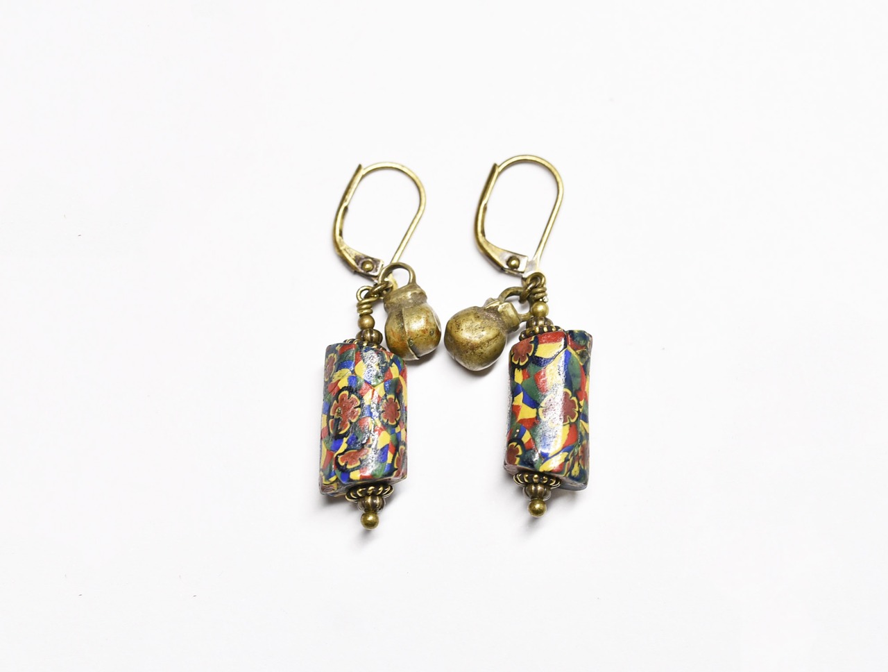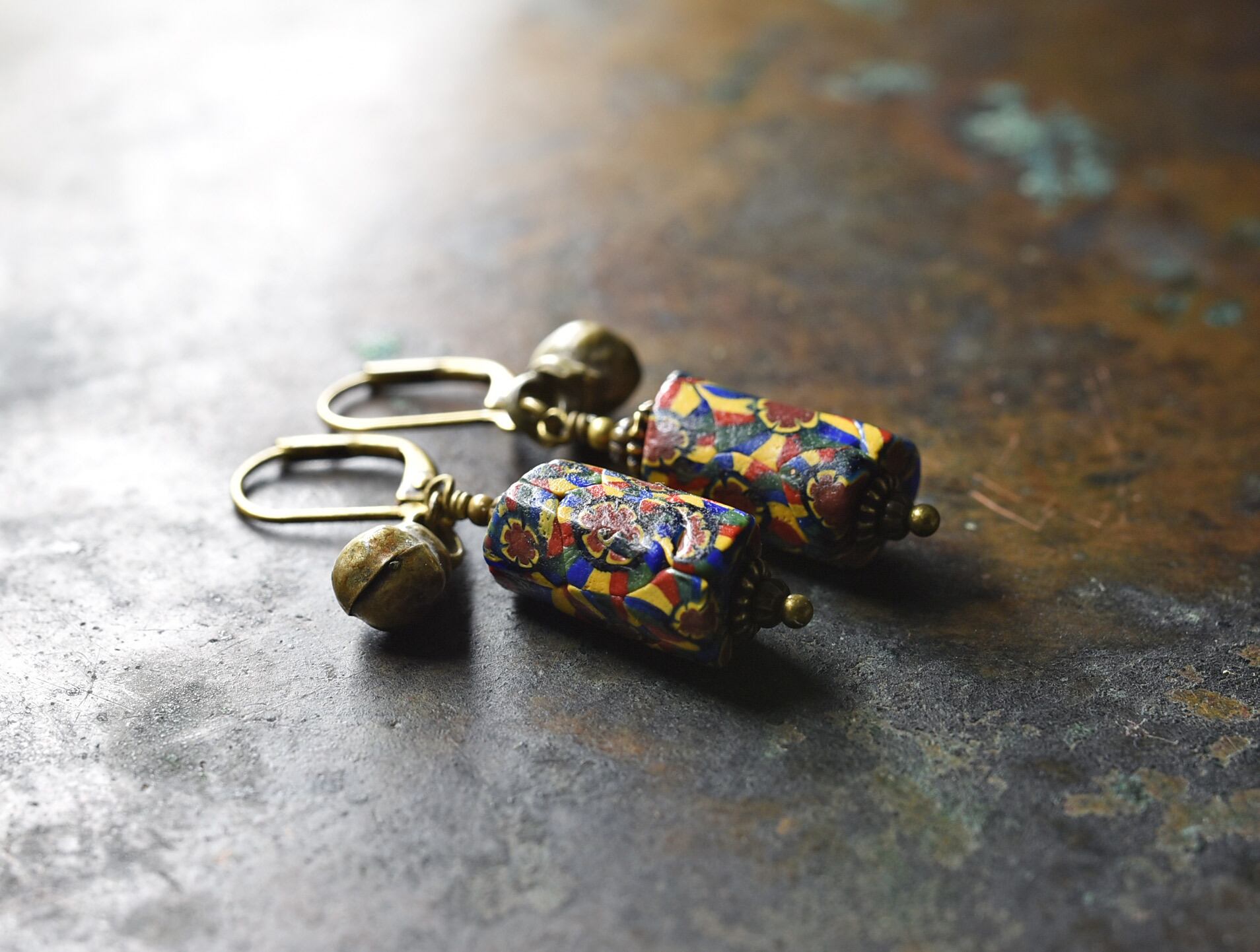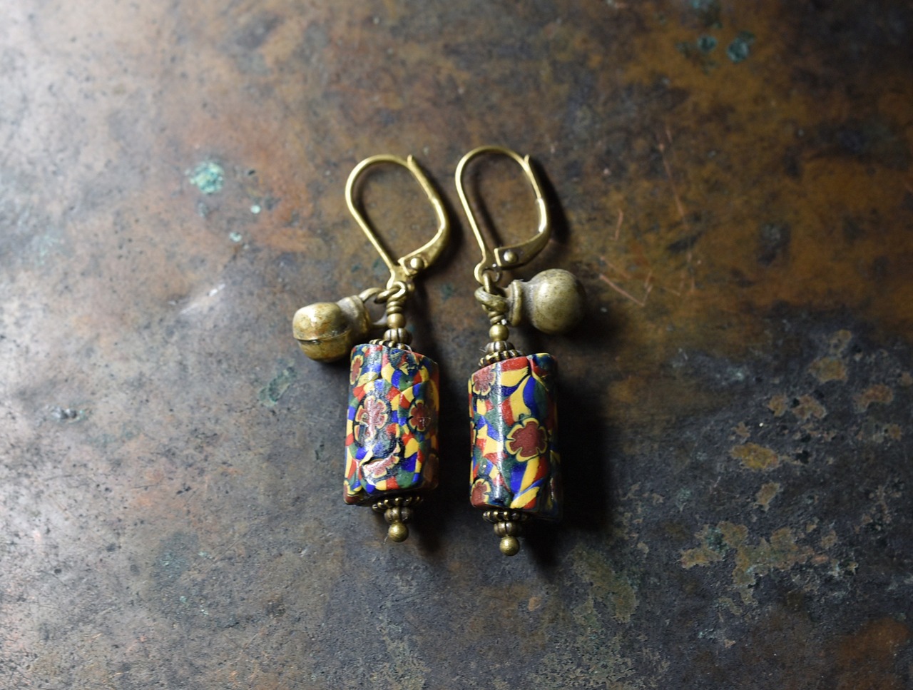 クレイジーミックスベネチアアンティークミルフィオリと民族鈴のピアス