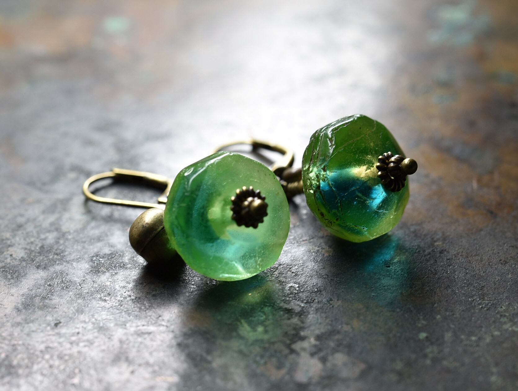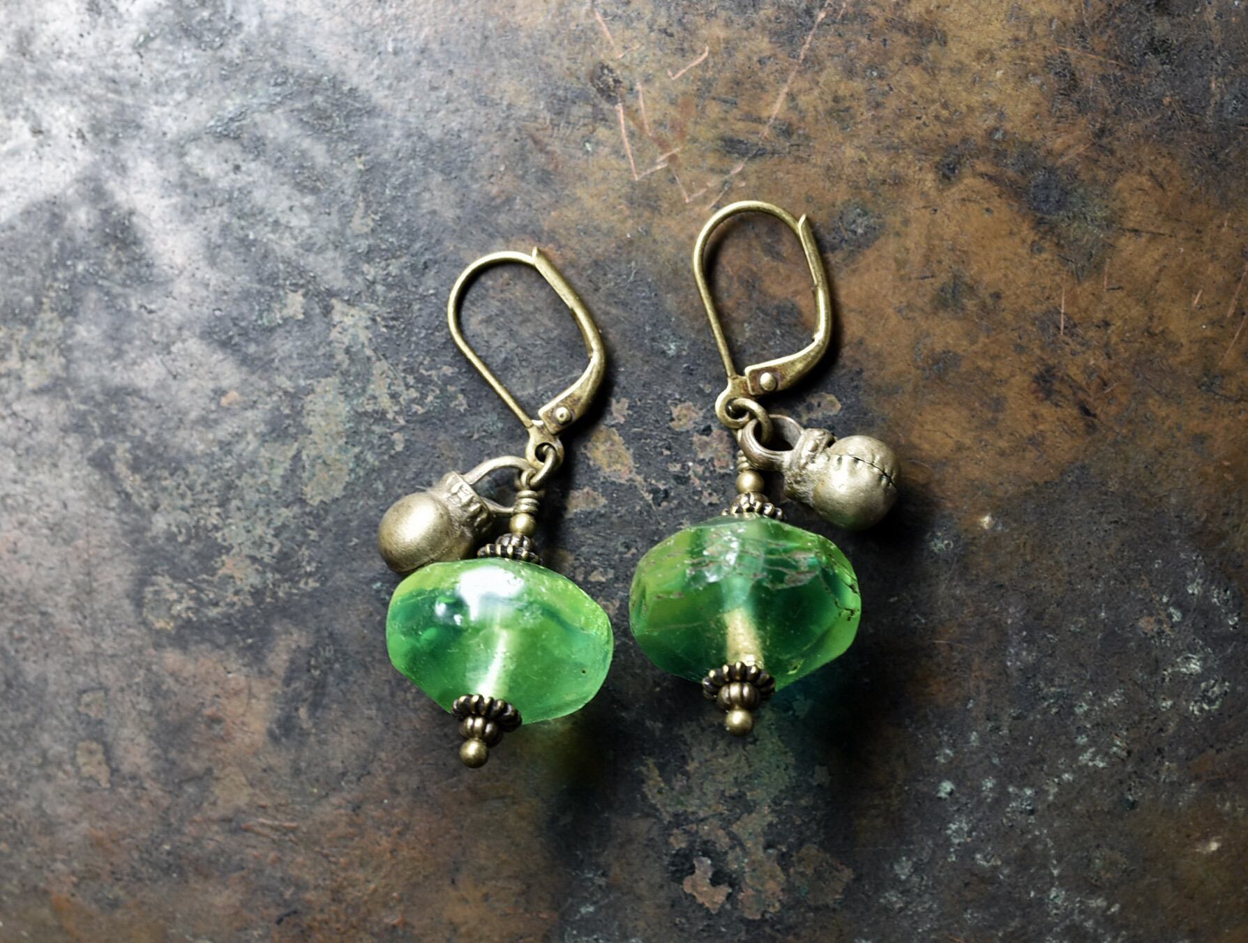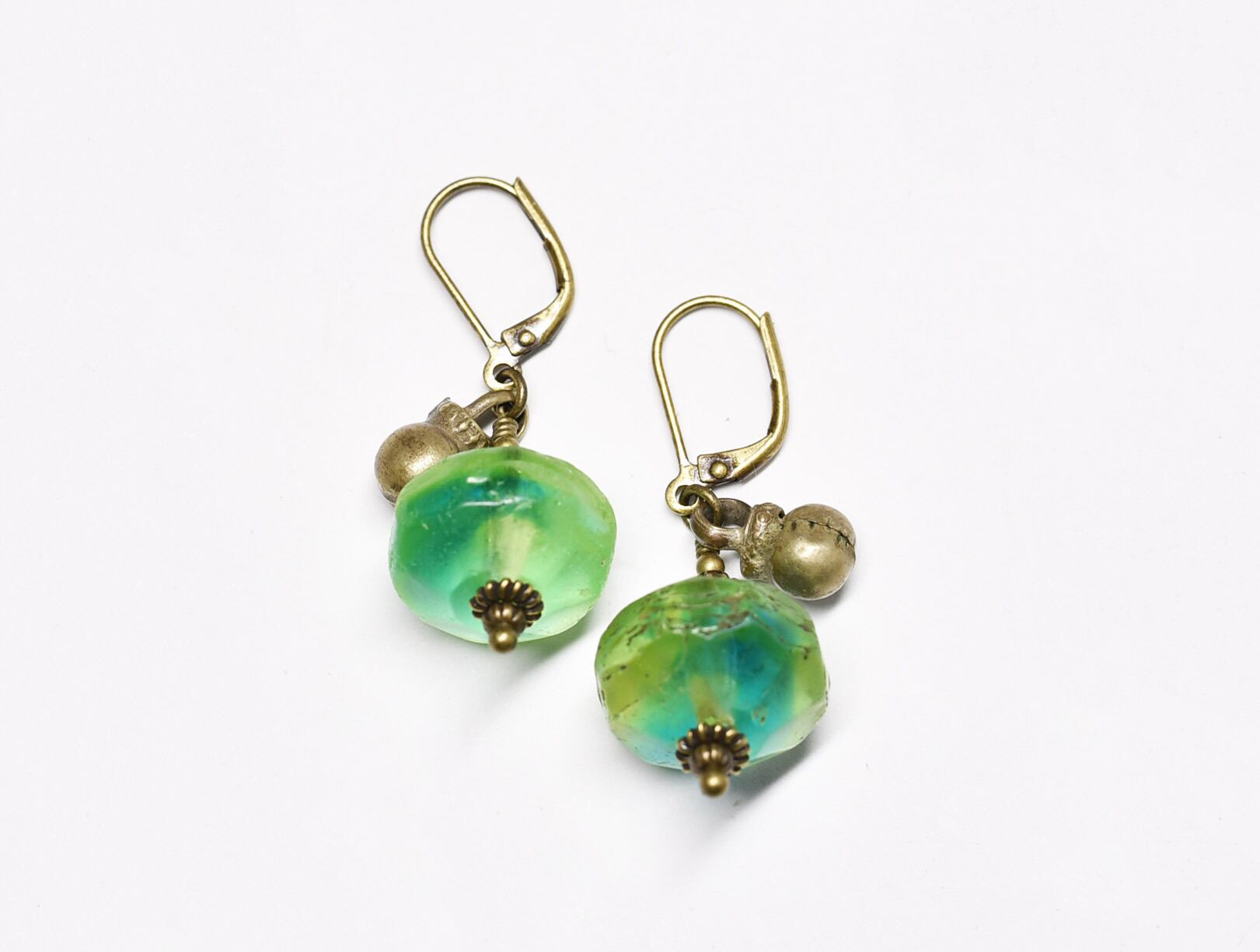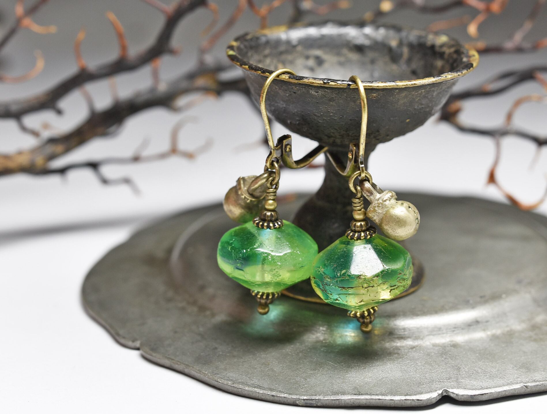 アンティークのウランガラスと、民族の鈴を繋いだピアスです。