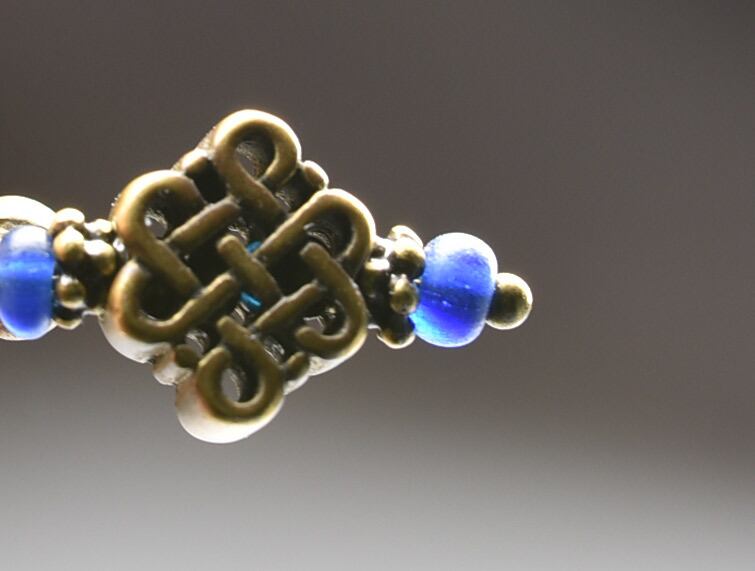 エンドレスノットとダークブルーアンティークビーズ、鈴を繋いだピアスです。