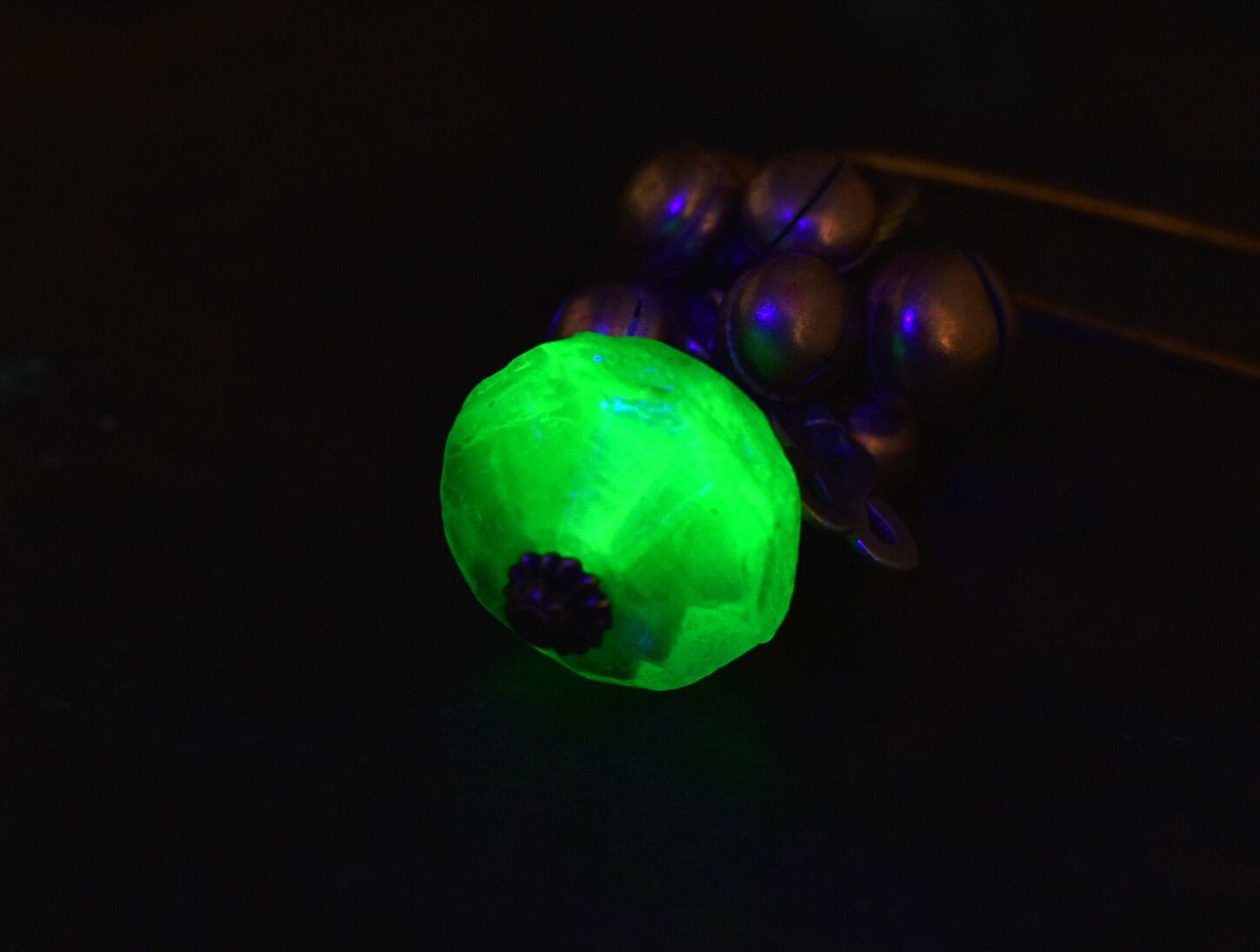 独特なセミクリアグリーンのビーズは、極々微量のウランで発色させています。ブラックライトを当てると光ります!