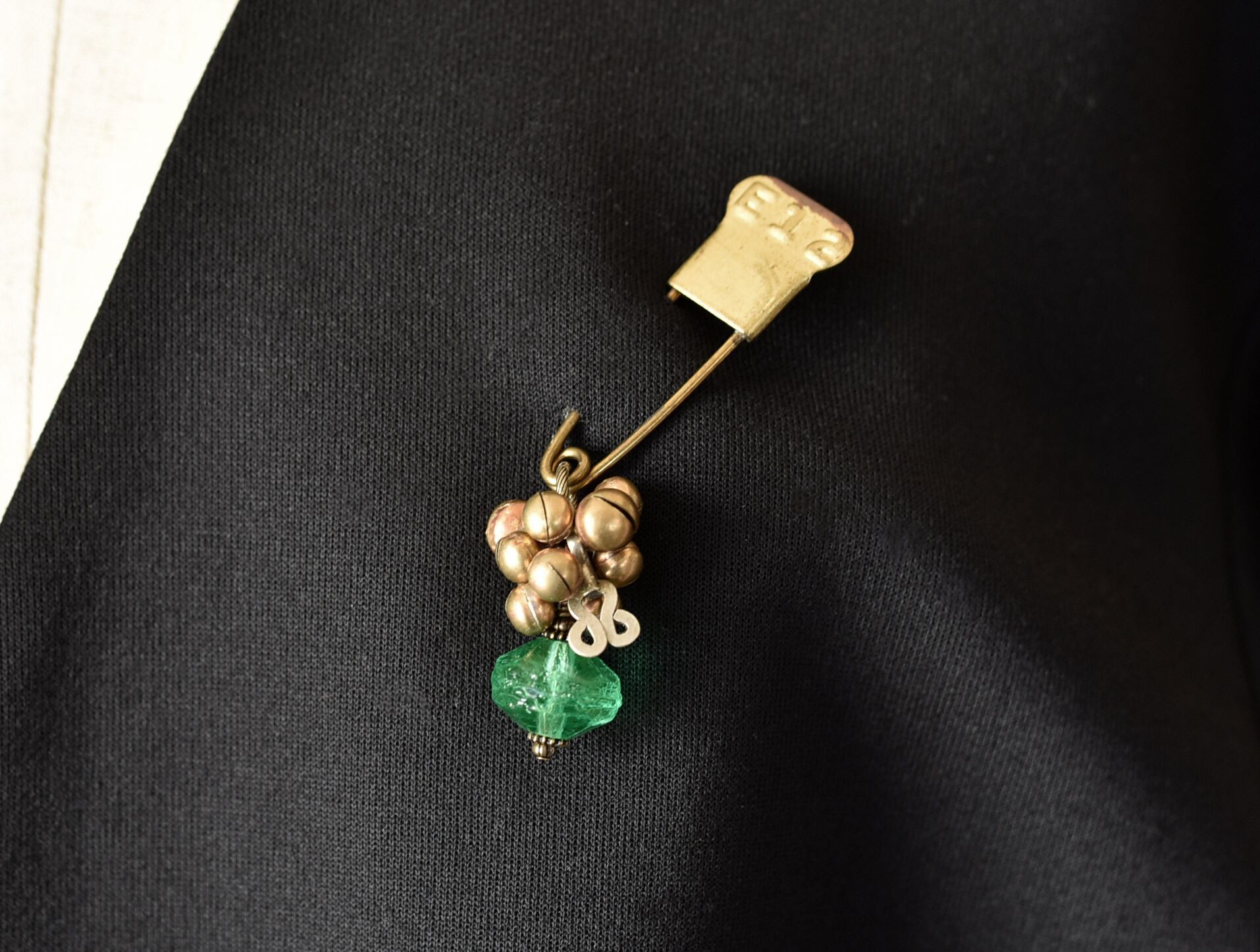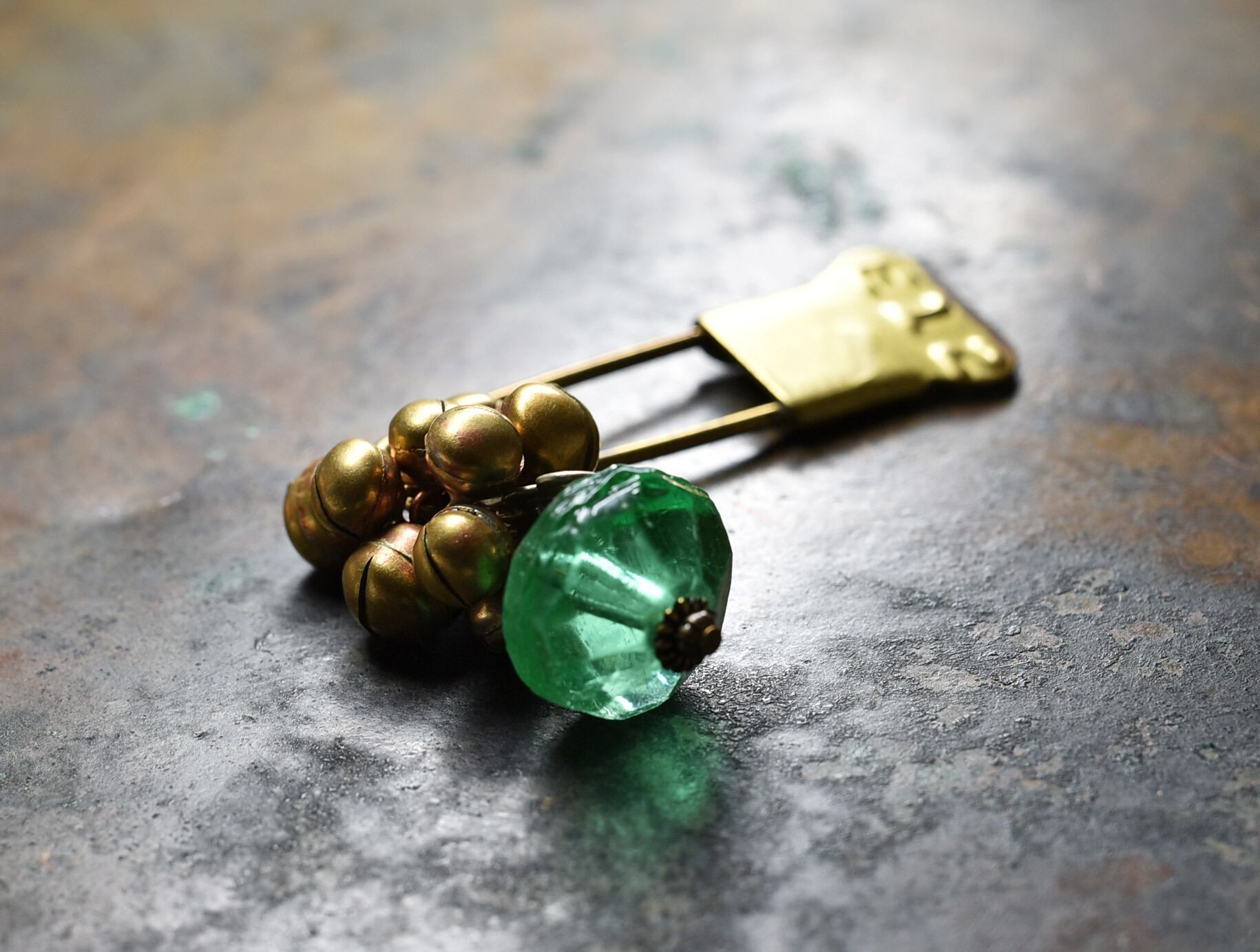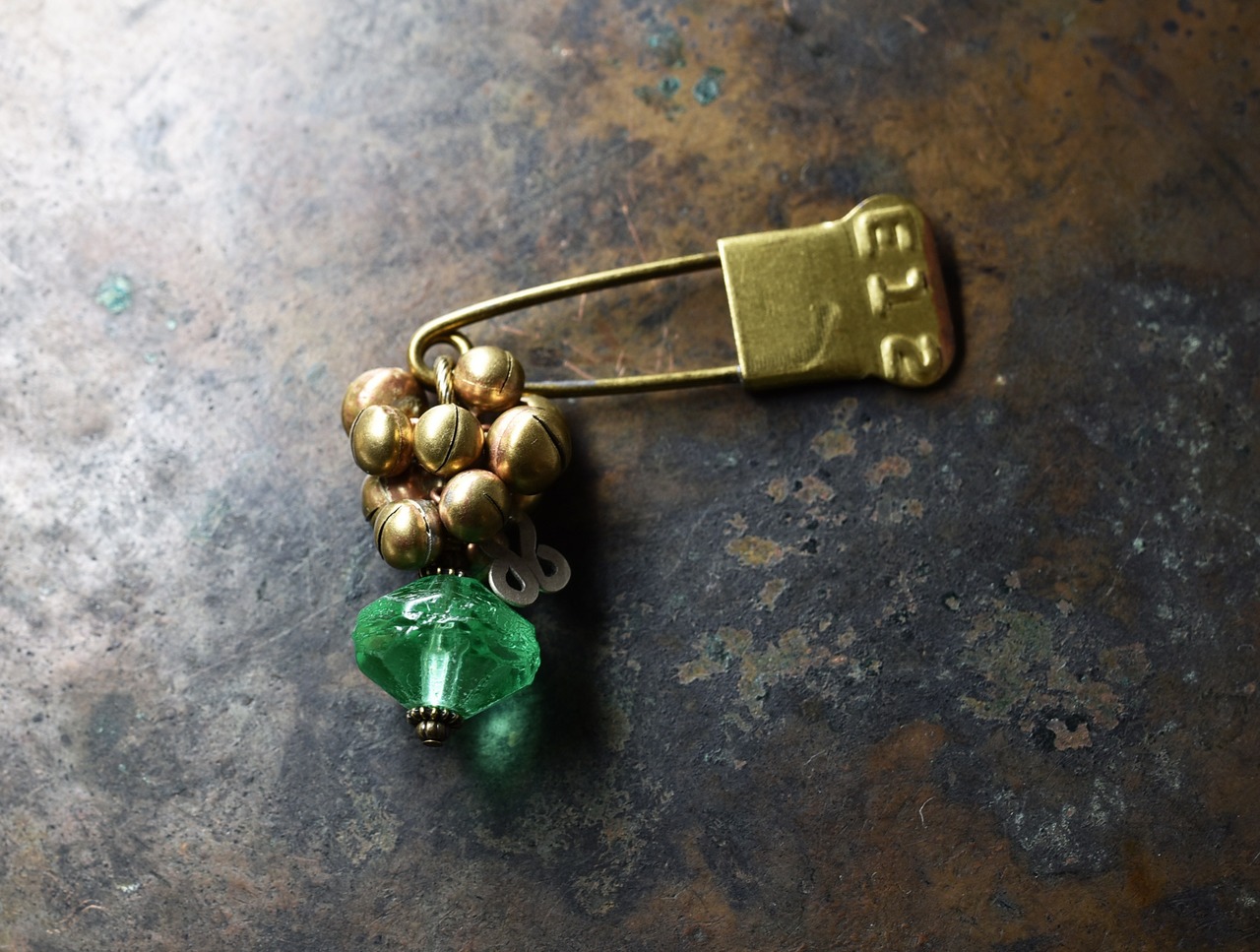 アンティークウランガラス、たわわな鈴、ズアフガニスタンのメタルパーツを繋いだランドリーピンブローチです