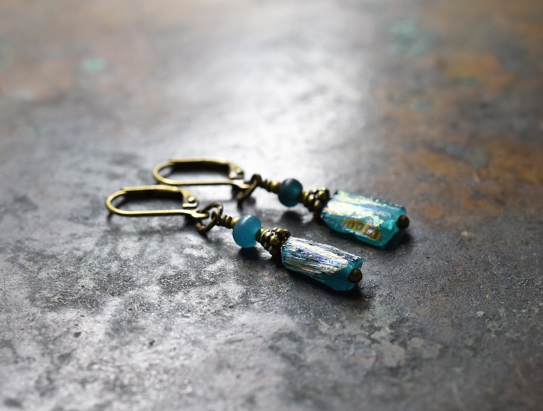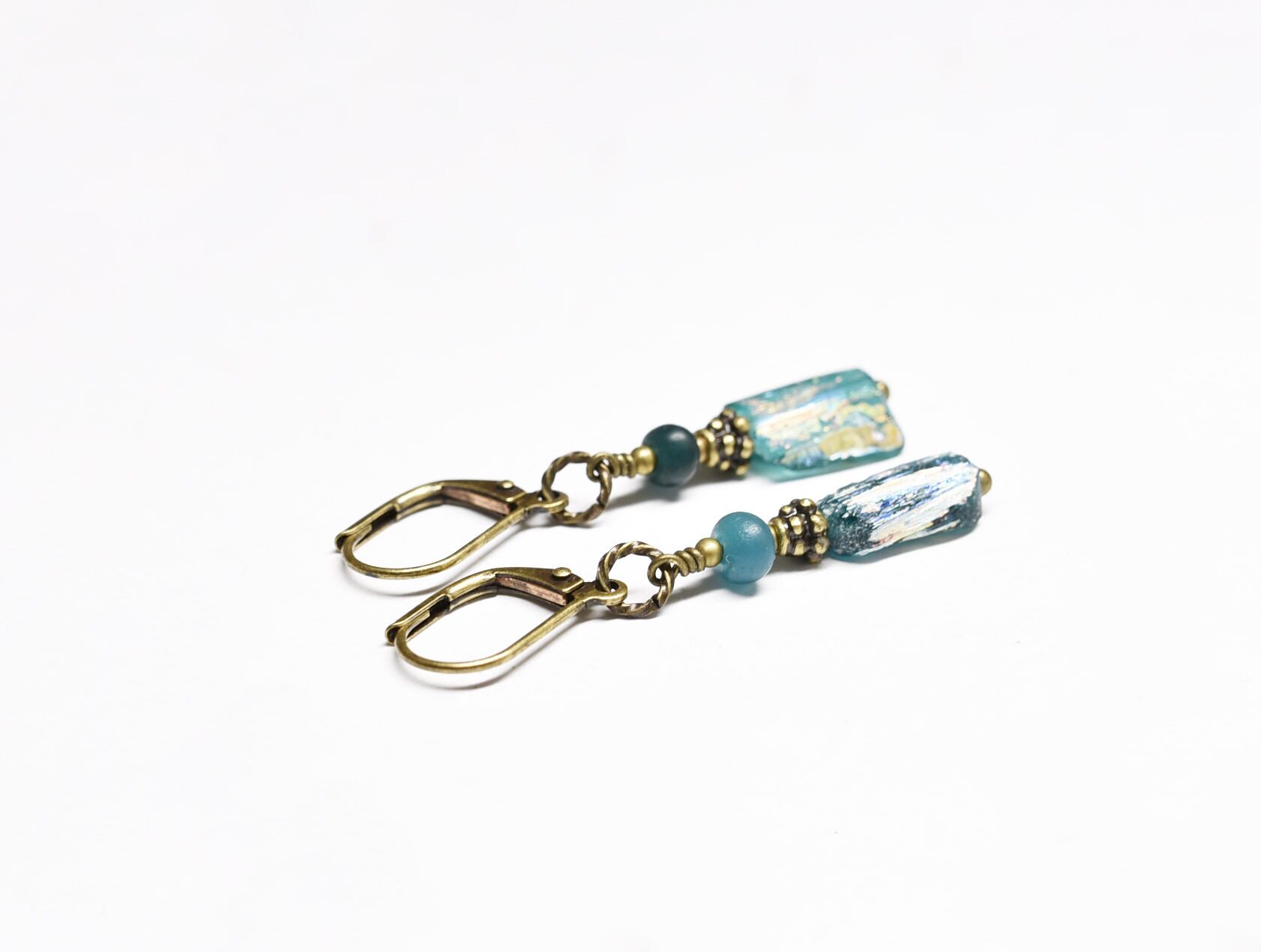 銀化したローマングラスと、エメラルドブルー、灰青色のアンティークビーズを繋いだピアスです。
