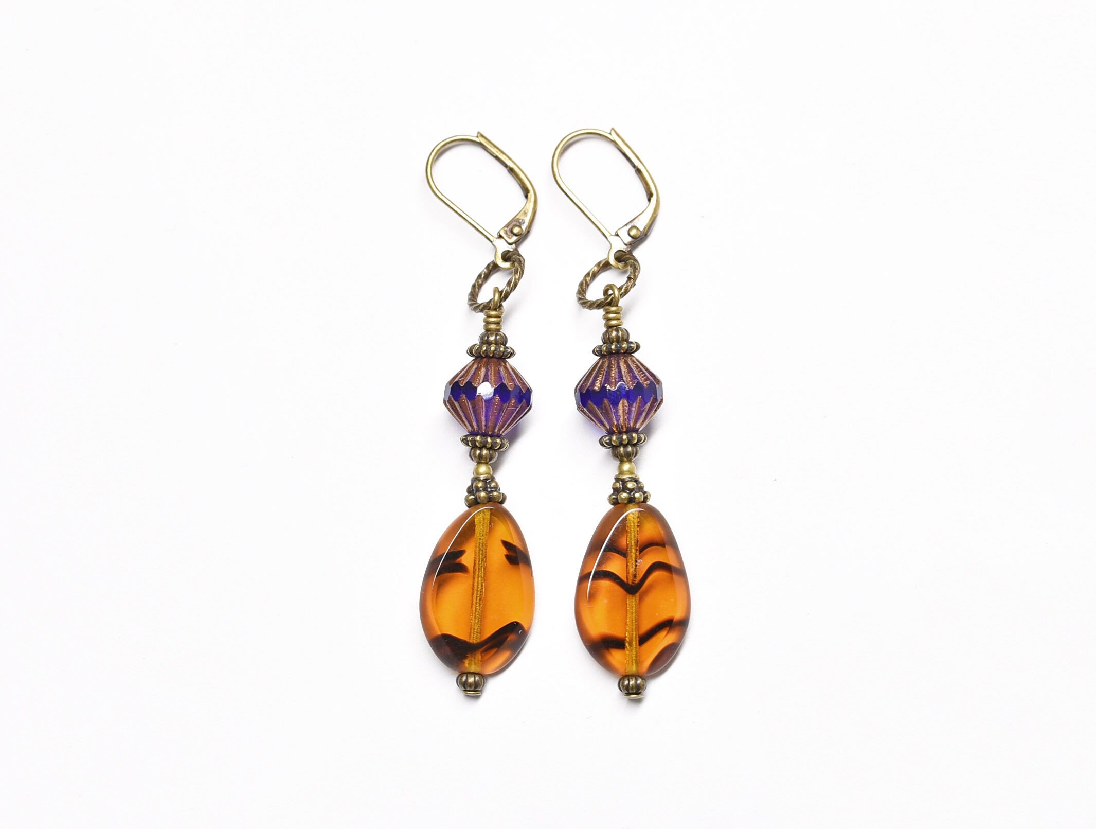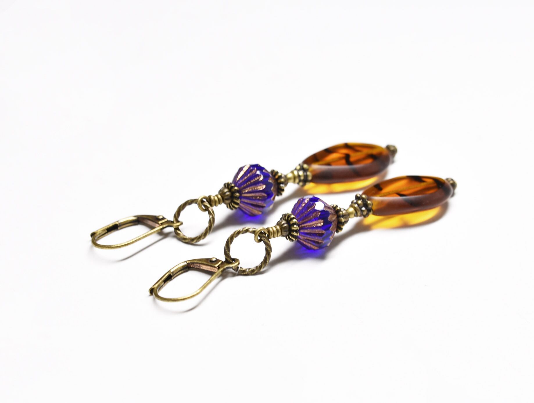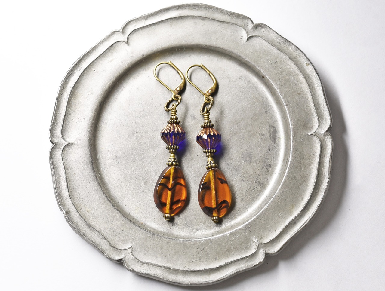 べっ甲色ヴィンテージビーとミッドナイトブルービーズのピアス