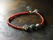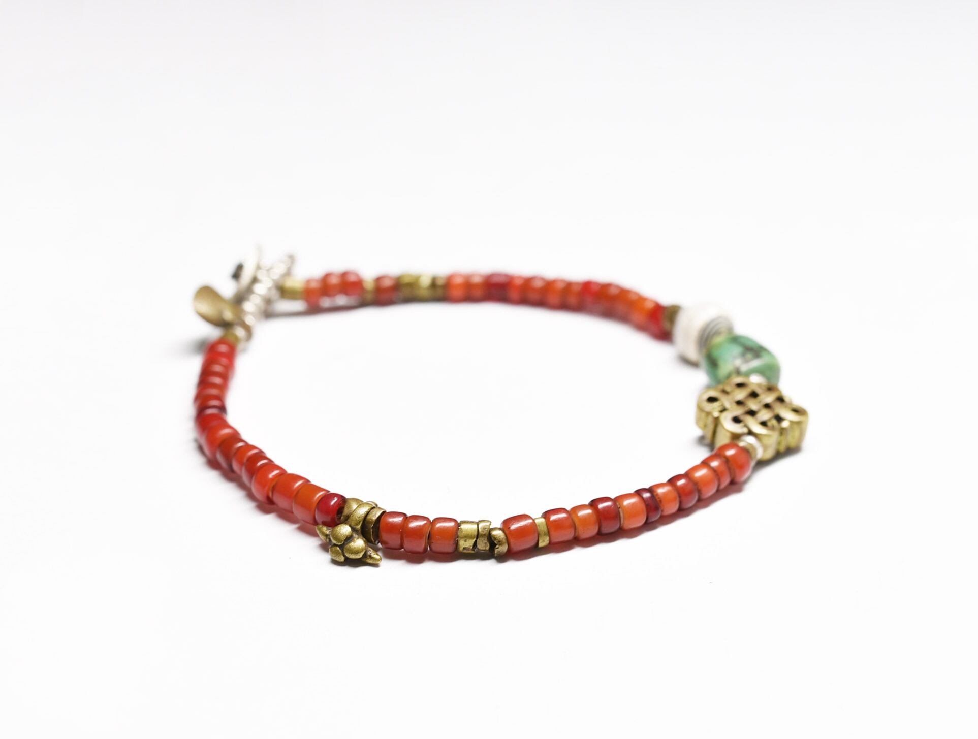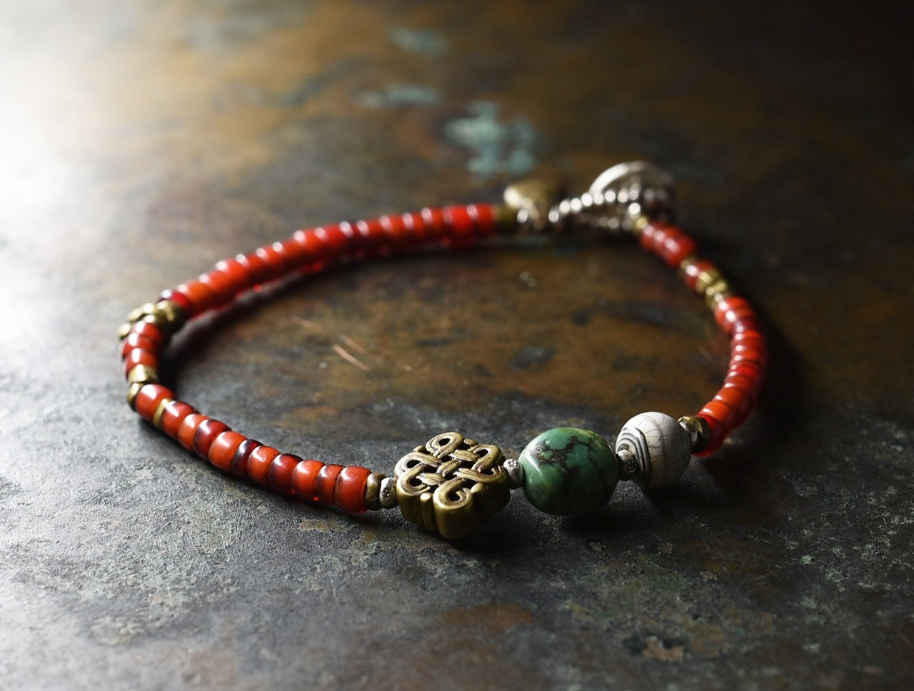 oldチベタンターコイズと、エンドレスノット、古代瑪瑙、飴色ホワイトハーツ、oldオリッサブラスのブレス