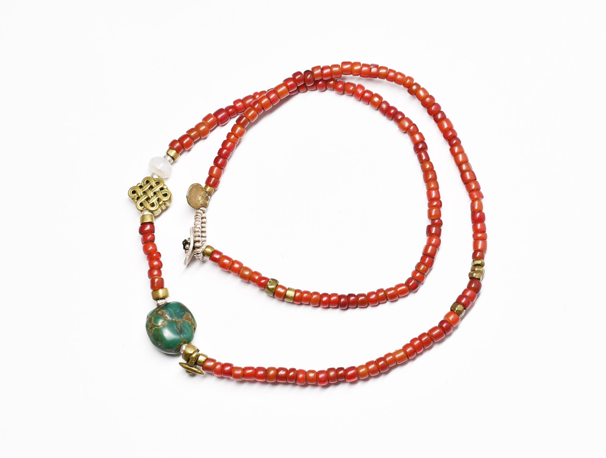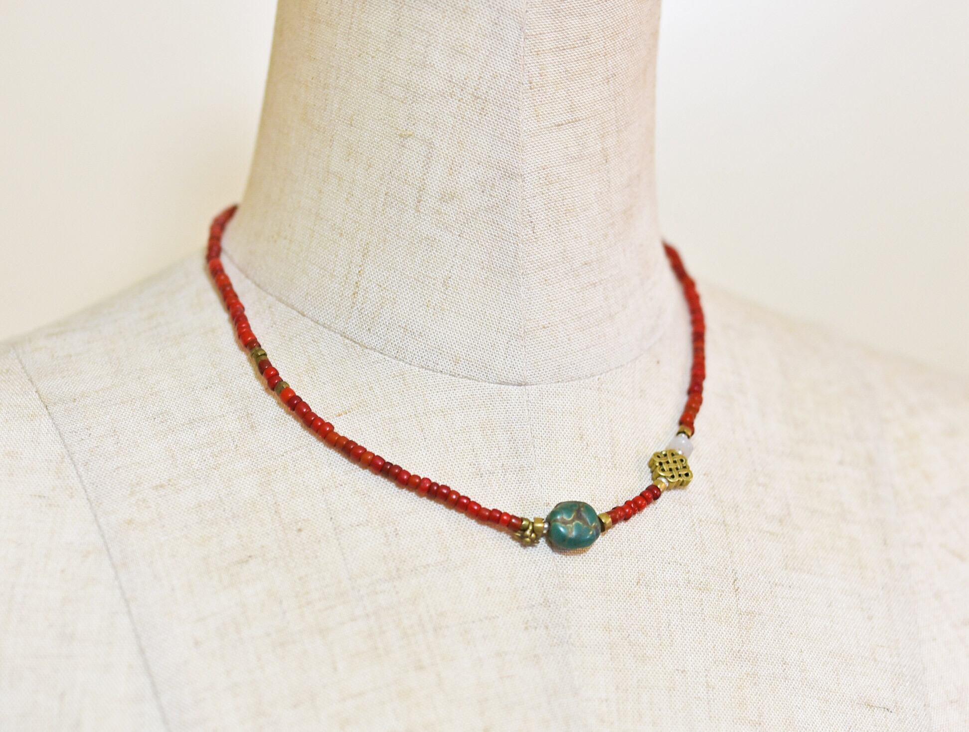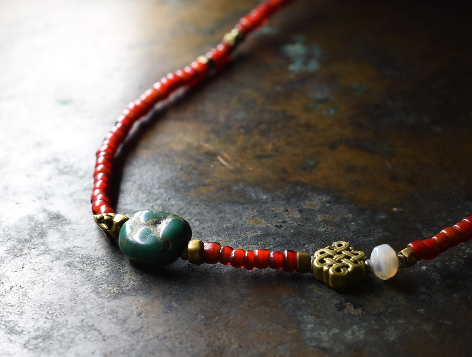 oldチベタンターコイズと、エンドレスノット、古代瑪瑙、飴色ホワイトハーツ、oldオリッサブラスのネックレス