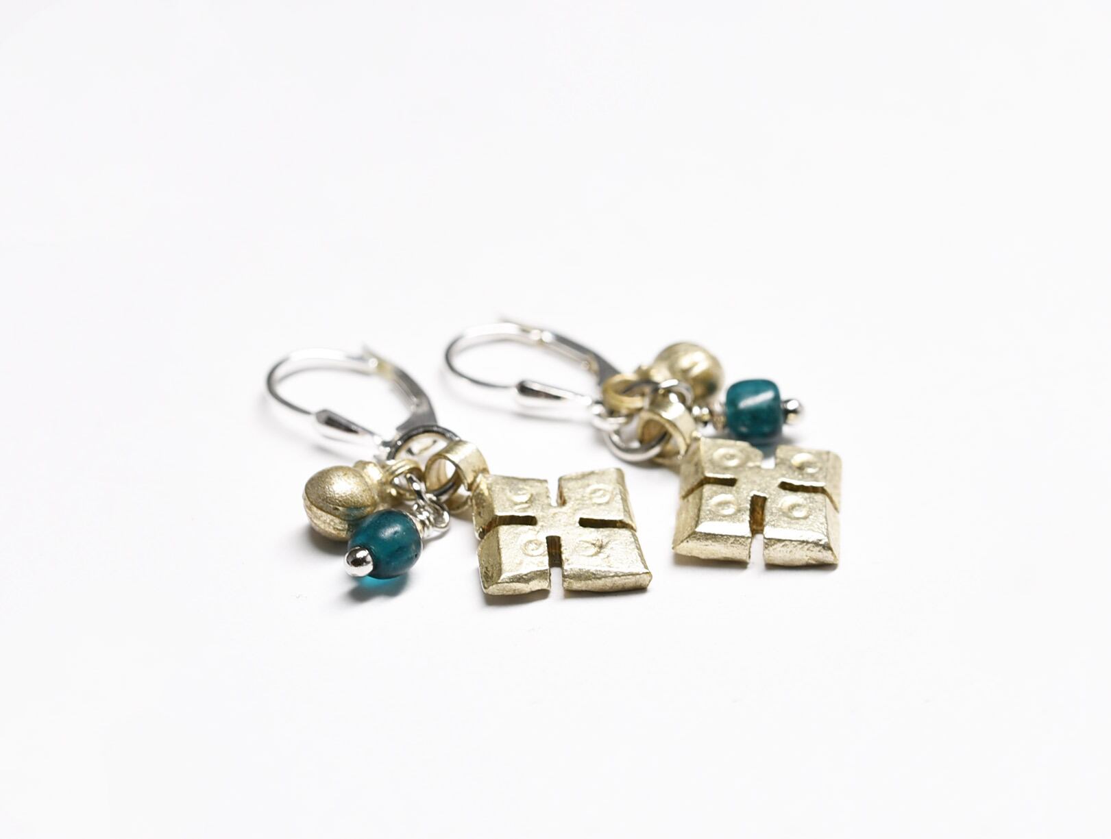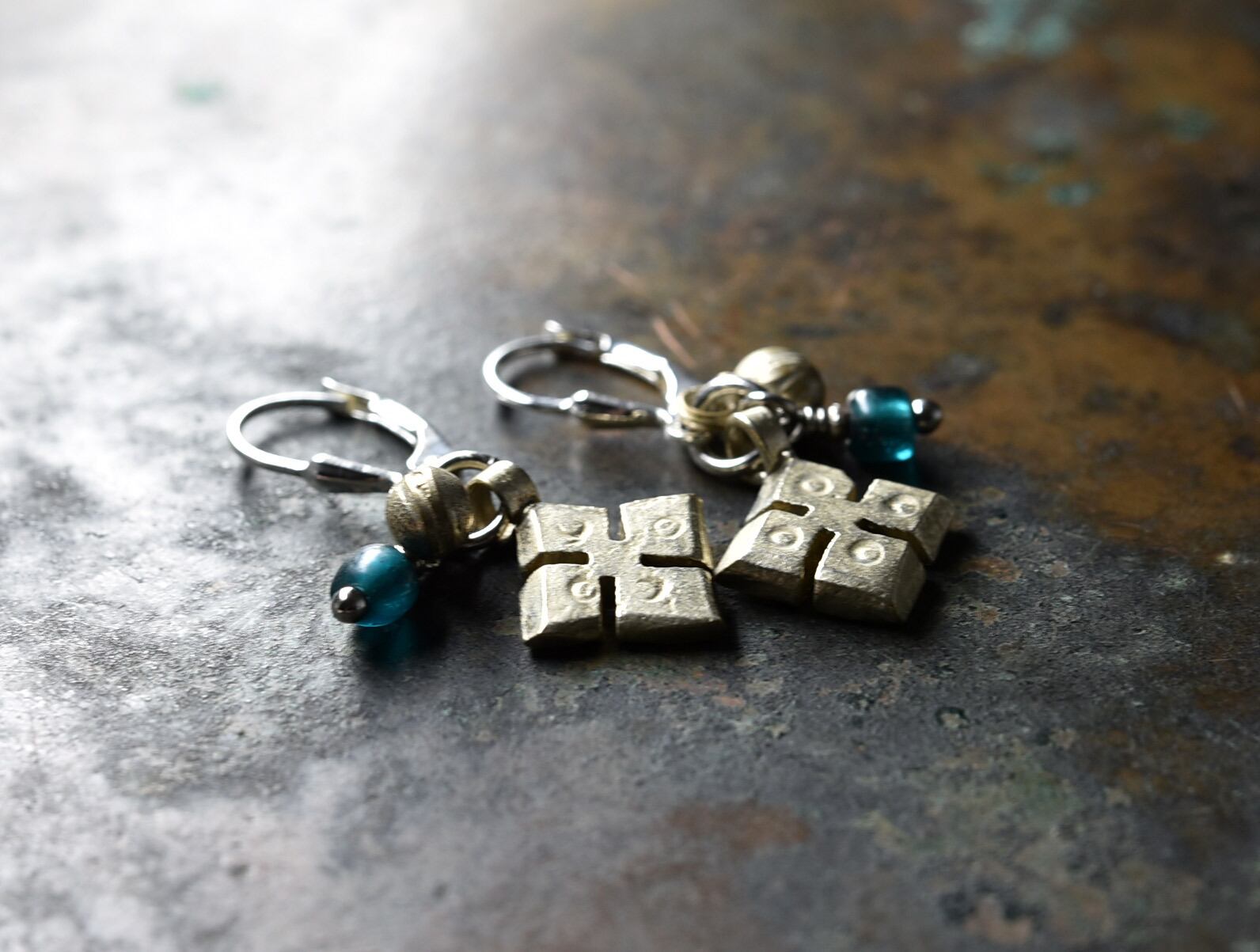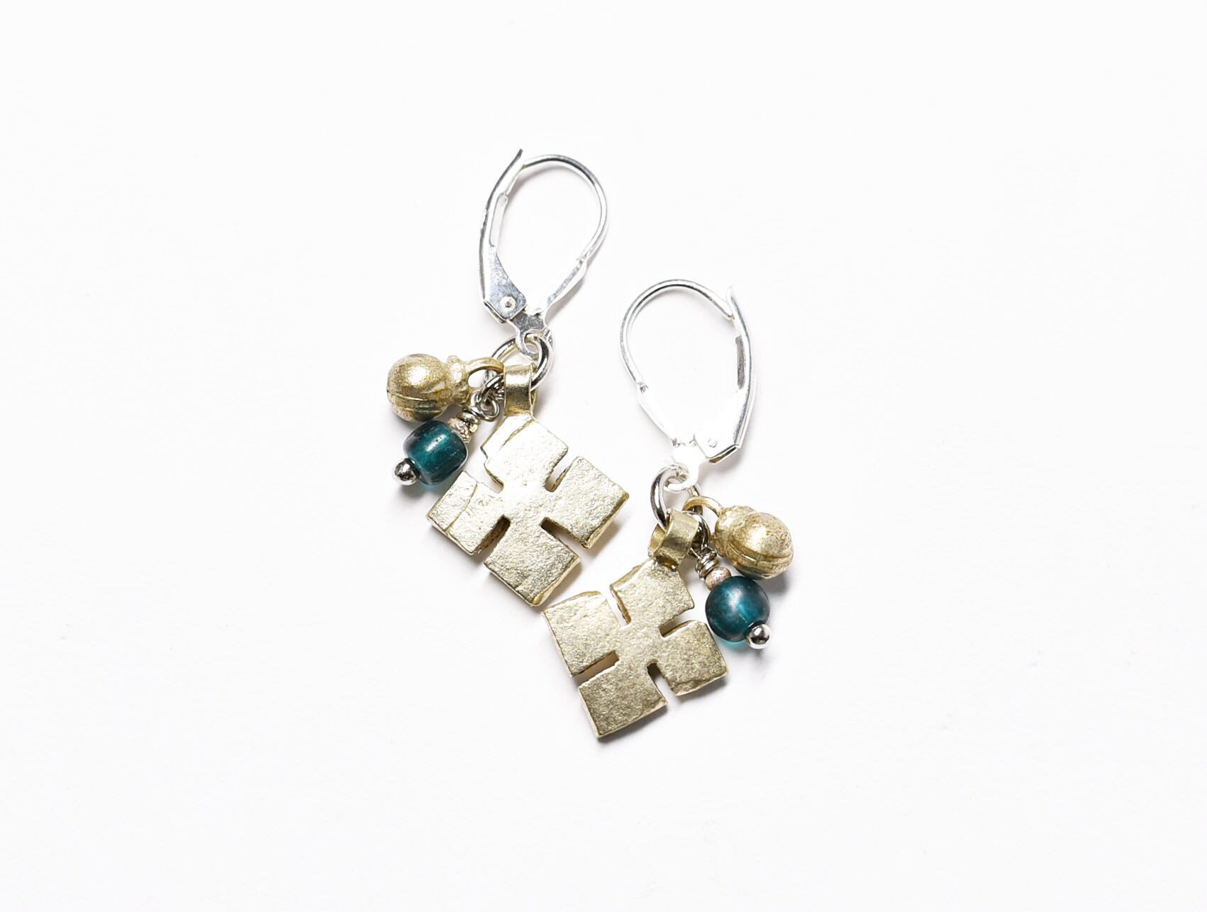 エチオピアンクロスと、民族鈴、エメラルドブルービーズのアンティークビーズを繋いだピアスです。