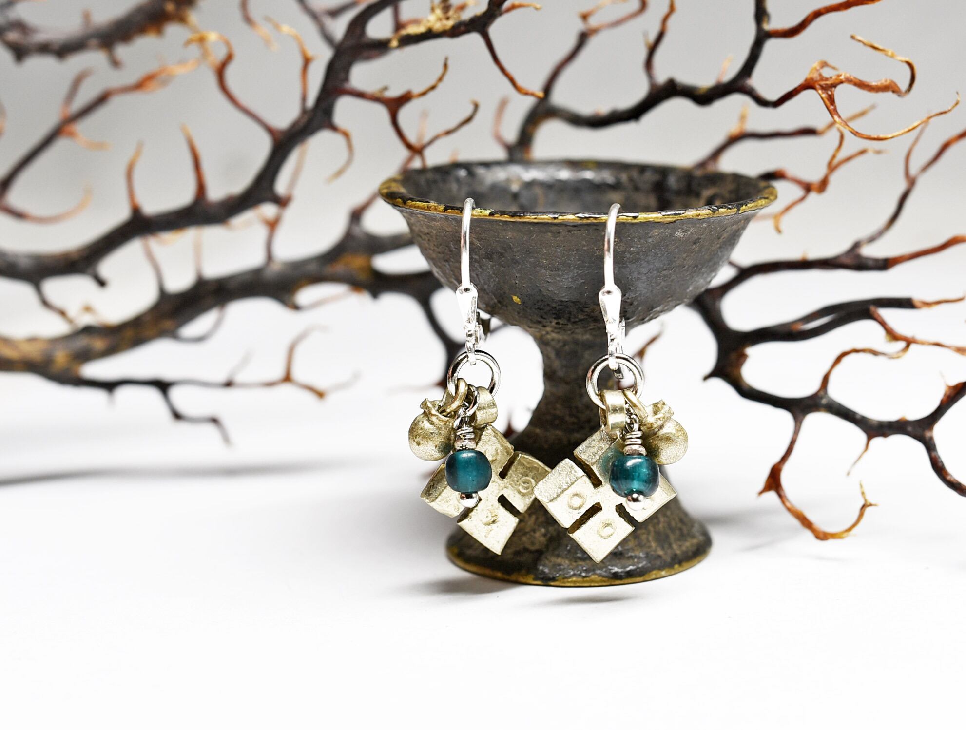 エチオピアンクロスと民族鈴、エメラルドブルービーズのピアス