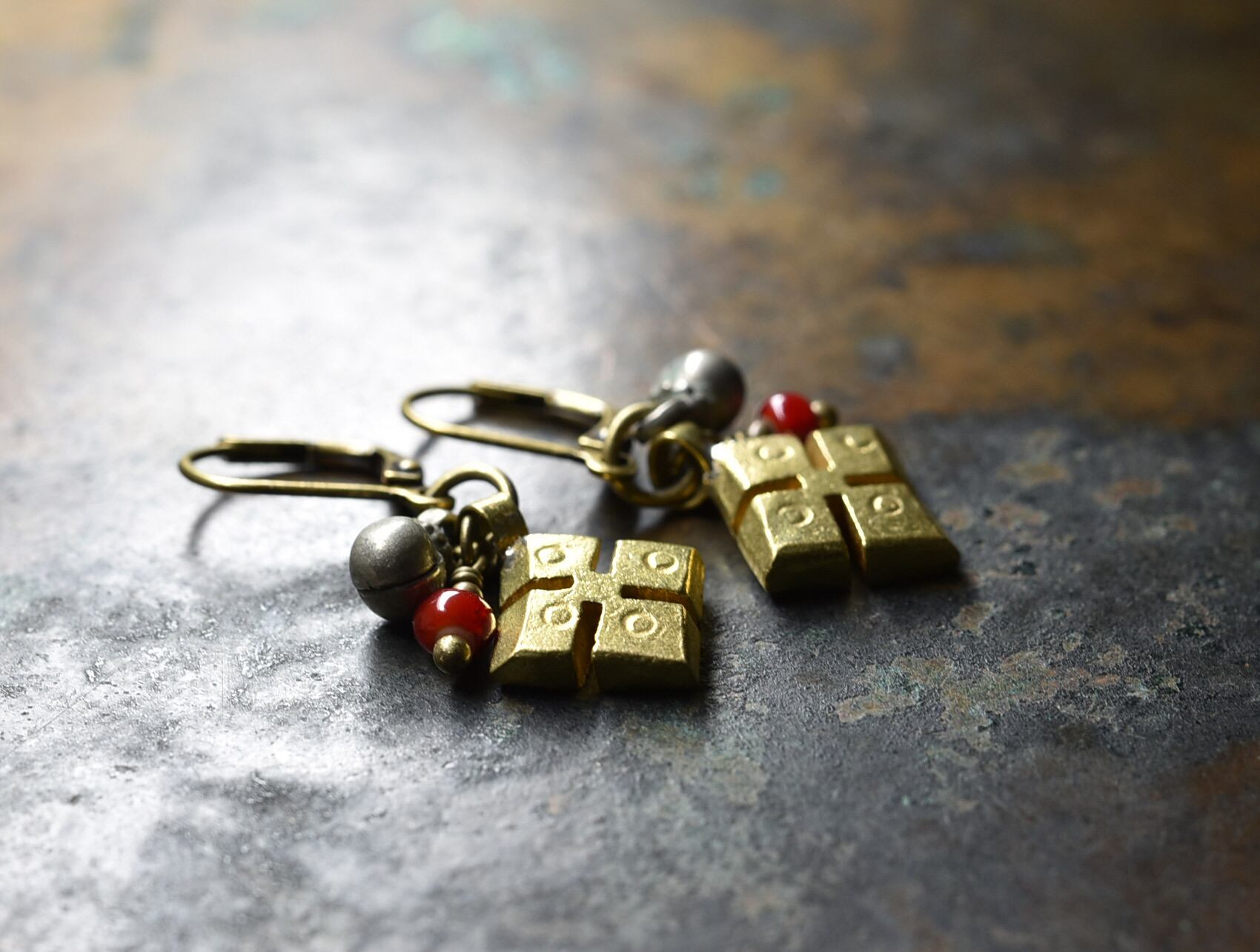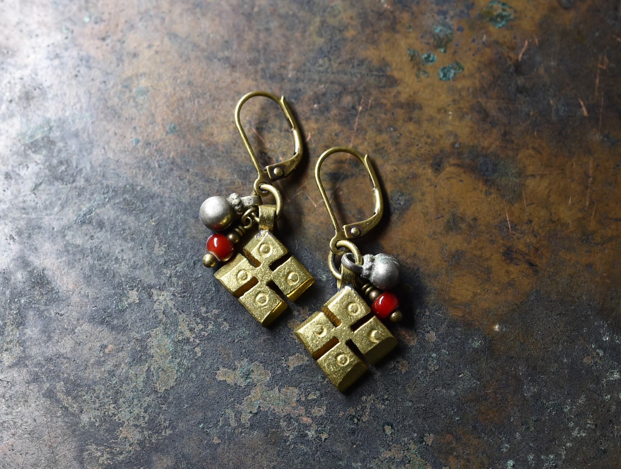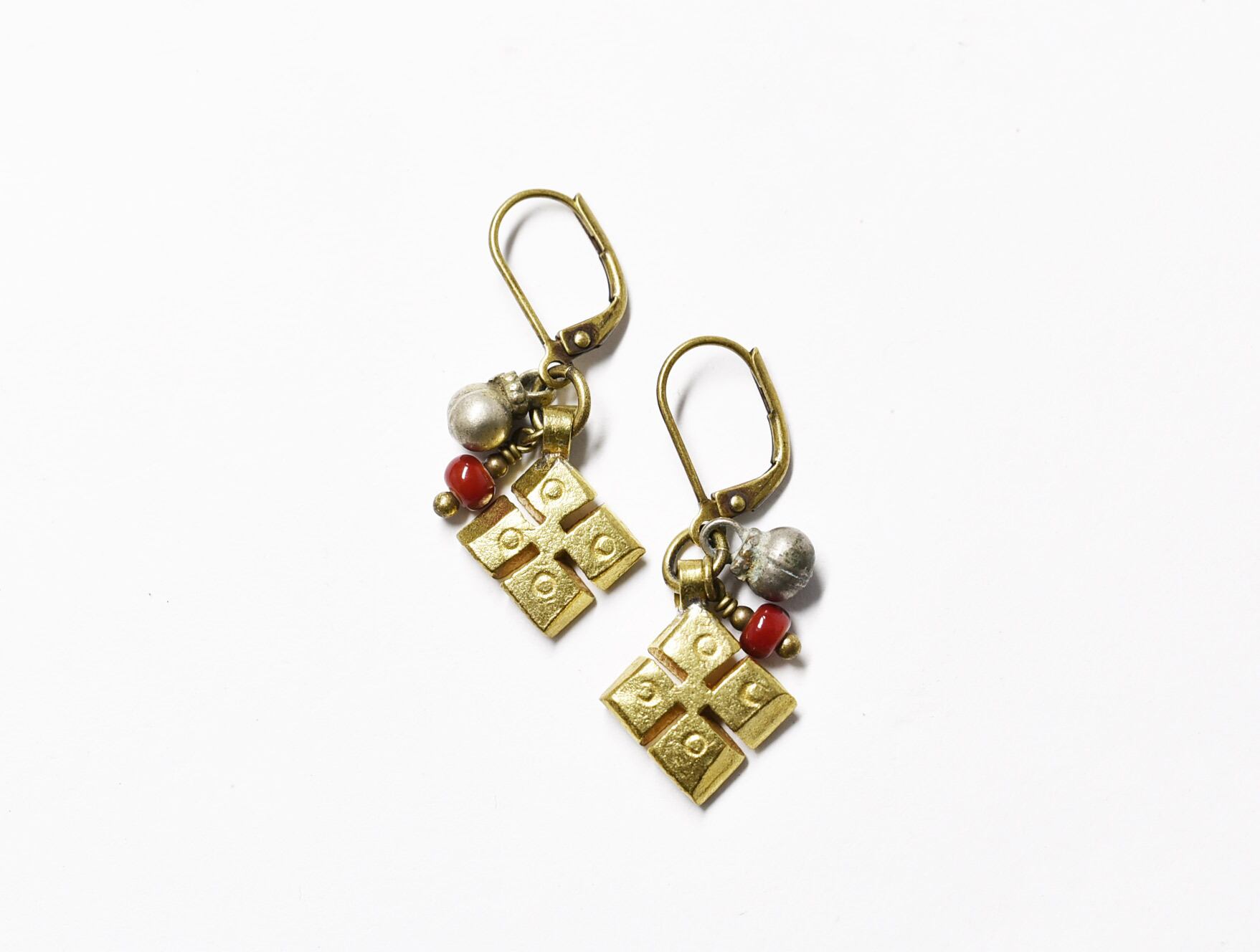 エチオピアンクロスと、民族鈴、血赤色ホワイトハーツを繋いだピアスです。