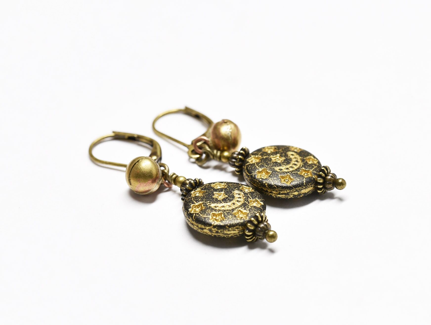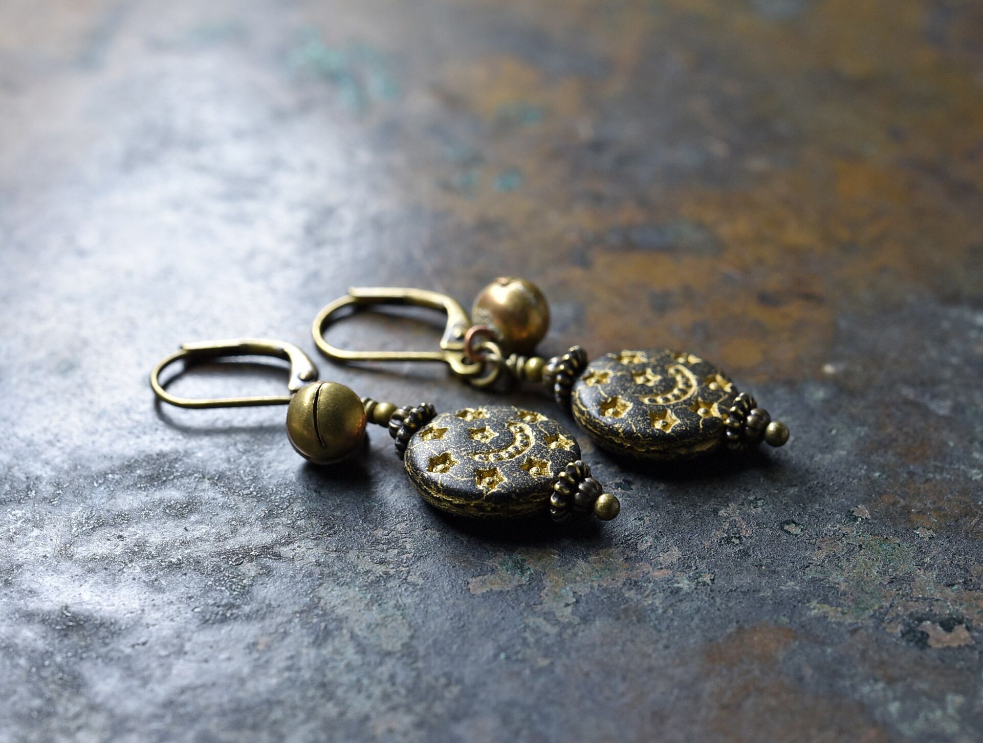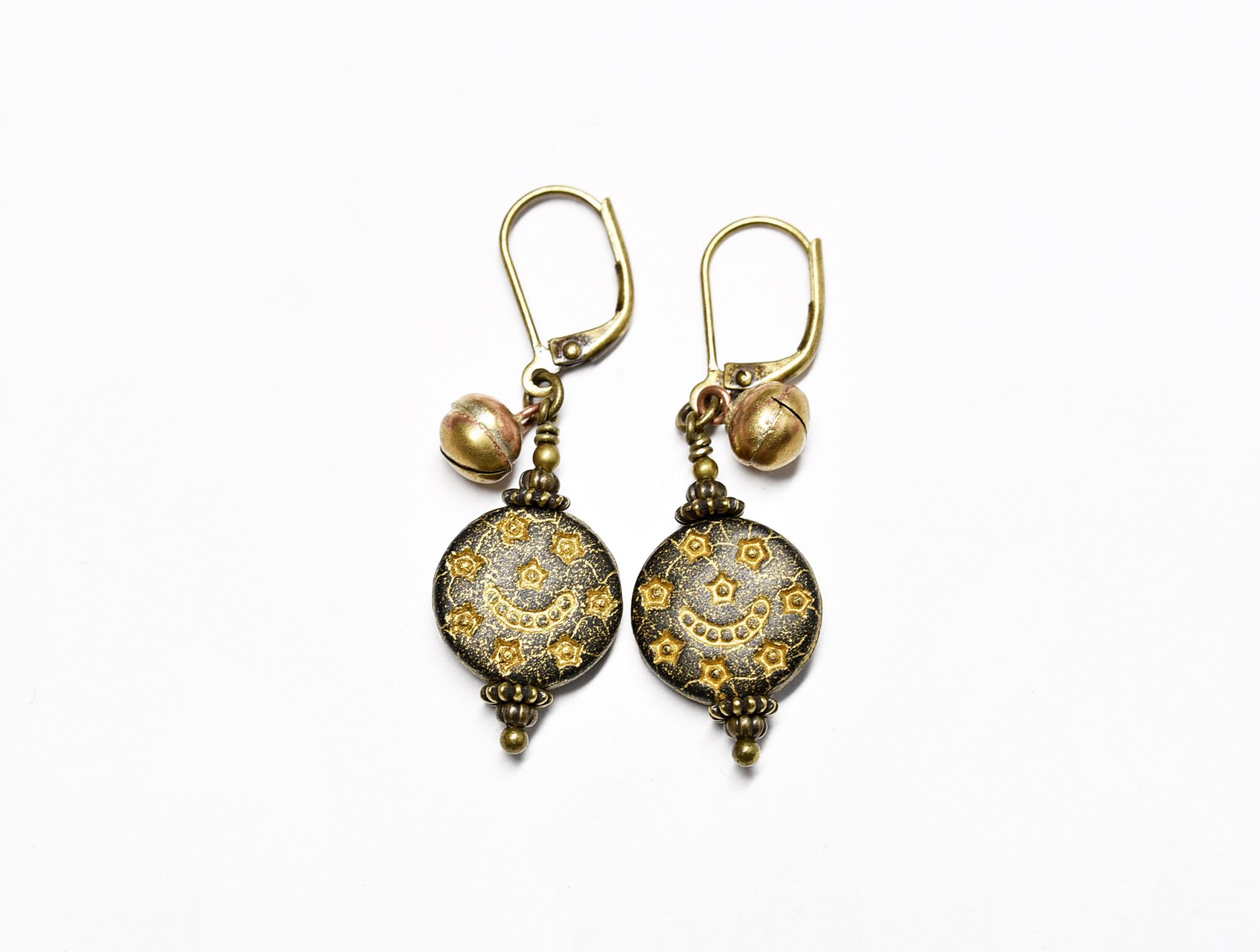 月と星の模様が施された聖者のビーズと、小さな鈴を繋いだピアスです。